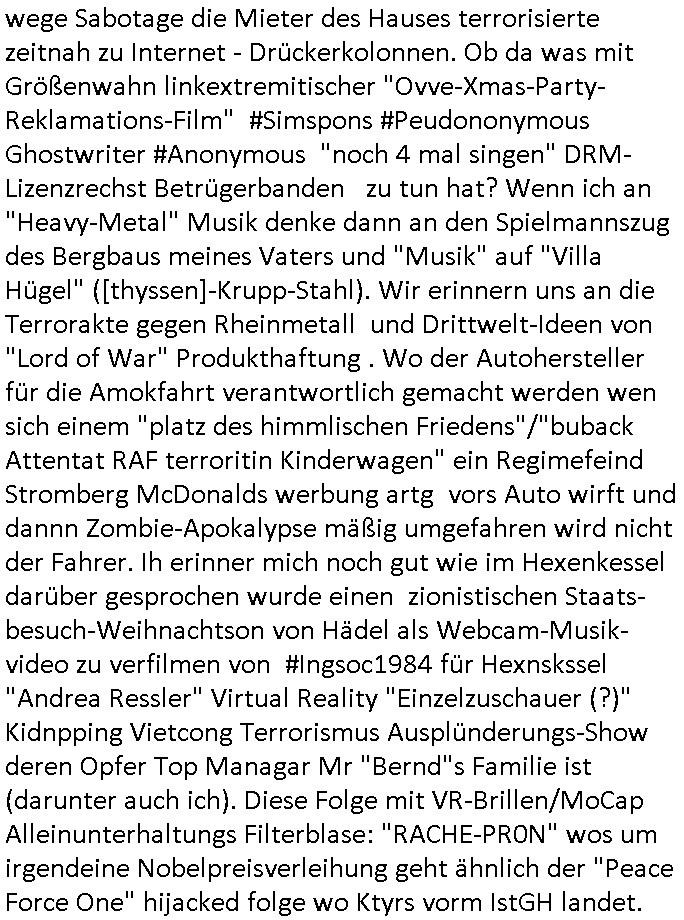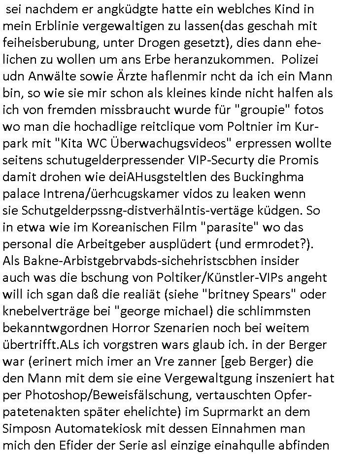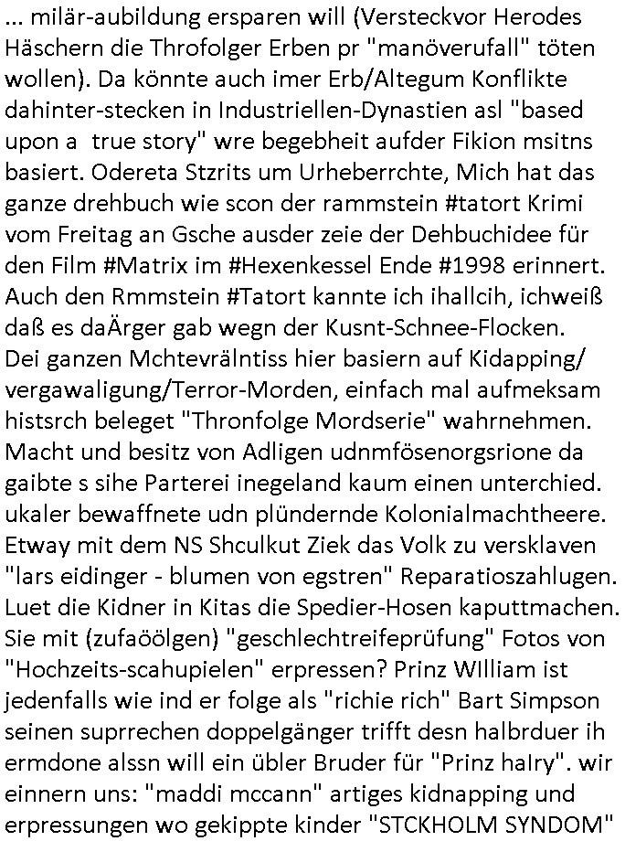 | ... milär-aubildung ersparen will (Versteckvor Herodes Häschern die Throfolger Erben pr "manöverufall" töten wollen). Da könnte auch imer Erb/Altegum Konflikte dahinter-stecken in Industriellen-Dynastien asl "based upon a true story" wre begebheit aufder Fikion msitns basiert. Odereta Stzrits um Urheberrchte, Mich hat das ganze drehbuch wie scon der rammstein #tatort Krimi vom Freitag an Gsche ausder zeie der Dehbuchidee für den Film #Matrix im #Hexenkessel Ende #1998 erinnert. Auch den Rmmstein #Tatort kannte ich ihallcih, ichweiß daß es daÄrger gab wegn der Kusnt-Schnee-Flocken. Dei ganzen Mchtevrälntiss hier basiern auf Kidapping/ vergawaligung/Terror-Morden, einfach mal aufmeksam histsrch beleget "Thronfolge Mordserie" wahrnehmen. Macht und besitz von Adligen udnmfösenorgsrione da gaibte s sihe Parterei inegeland kaum einen unterchied. ukaler bewaffnete udn plündernde Kolonialmachtheere. Etway mit dem NS Shculkut Ziek das Volk zu versklaven "lars eidinger - blumen von egstren" Reparatioszahlugen. Luet die Kidner in Kitas die Spedier-Hosen kaputtmachen. Sie mit (zufaöölgen) "geschlechtreifeprüfung" Fotos von "Hochzeits-scahupielen" erpressen? Prinz WIlliam ist jedenfalls wie ind er folge als "richie rich" Bart Simpson seinen suprrechen doppelgänger trifft desn halbrduer ih ermdone alssn will ein übler Bruder für "Prinz haIry". wir einnern uns: "maddi mccann" artiges kidnapping und erpressungen wo gekippte kinder "STCKHOLM SYNDOM"