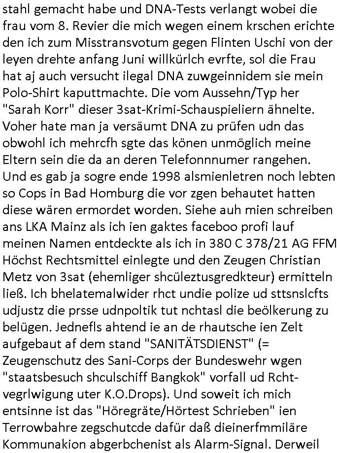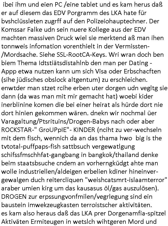 bei deren ansheen Hautwiderstandsmessungen. Debi würde mann im MRT die katvität von Hirnarealen mit und ohne stimulation ansehen, vorher dem Porbandenien stück schokoldtde oder os geben und shcn er ihm das shcmckt. wennjawürdeman ihmdas slbe stück schoko- lade vond em man wieß daß es psotve empfunden wird geben oder zeigen deism im MRT udn die Abweichung gegnüber dem bild ohne diesn Reiz hreusruchen. Dann wüsste man welche Hirnareale aktiv sind wenn etwas als "schön/gut/Vorteilhaft" empfunden wird. Dieses so extrahierte wissen könnte man nutzen um rauszufinden ob aner bilder/filem/shcüsslreize die manzegt dieegcleh hirnareale aktiren, also als gut oder schlecht empfunden werden ohe die möglichkeit zu tsächen eines "pokerface". Lügetdtektoren die EEEG/EKG artg mit hautwidersatnds-messung sw arbeiten, etwa die aus ermttlige gegen die scientolgy sekte baknnten "eMeter" in Verbindung mit Diashows/Kinofilmen kennt man aus "Clockwork Orange" dem Film von Stanley Kubrick mit den Augenklammern. Auch der Browserverlauf oder Proxy Verbindungsdaten könen genutztwreen um unterbwusstes handeln von Menschen auszupsionieren, eta die liblgsfarbe erraten beim Online-Shopping oder ewta den Musikgeschmack oder vorliebe für bestimmte Autoren "Anderen Philippe Djian Lsern gfilmsietn auch der Auotr Hnr miler" doer so. Das geht bis hin zum ausspähen poltischer Gesinnungen. Wenn das politische system wie gerde dei EU / BRD uter vonderleyen / Merz in Rchtung kriegstreibende Militär-Dikatur kippt wird so etwas extrem gefährlich. Jedenfalls betätigte sich der Kommissar Murot dann als Psychonaut der mithilfe von Technik in die seele anderer menschen vordringt. Im krankenhaus versuchte er sichwie jemdn der inden "privat/nur für freunde sichtbar" bereich auf sagen wir faksbook-Servern eindringt. Ein Social-Media Profile und jetzt kommts "Profiling" wie beim TV Sendungs-Titel "pathologin mit profil". Man machte auch eine haus-durchsuchung und fand ein analoges oaoer tagebuch wo man das schloss am ein band einem Siegel artig auf-brach um es lens uns asuwerten zu können. das ist a der rgudnwarumichmienrmUtetr in Thailandschonsl sihc noch ganz klienwar sagt daß ich nicht will daß sie tagebuch führt in demich vokomme wiel das meine privatsphäre verletzt, damsl gab es dan uch einen großen skandl um personal "butler" des könighauses die private interna aus dem "buckingham palace" an die "yellwo press" verkaften. Das ist ien agff auf die Wisschafst/Kuntsfreiheit,also die freiheit sich notizen zu machen als Gedächtnisstütze, die deröfflichkeit unzgäglsichsind, Krankenakten ähnlich. Wir erinenr usn daß ich mal was zum Thema "Budspräsident im Krankenhaus während mir Schulschiff Staatsbesuch in Bagkok/Thailand" gesgt habe über Patientengeheimnis. Und daß es damals um das Faken von Schiffs Logbücher- Daten ging, etwa U-Booten die imFukfvekhr dender fidn abhörenkann ihre postionen nicht bekantn geben wollen. "Stealth-Schiffe" = "U-Boote" wie "Stealth Fighter" Jet = alle Kampfflugzeuge im Tiefflug unterhalb des Radars. Das sind (wie im Bercht üer Krytografie shcffrerer Maria Stuart briefe asu der Gafangnschaft der im ZDF[?] lief) "metaphorische also sinnbildliche Symbole/Zeichen". Und wen etwa RAF Terroristen/Rockergansg asu dem kanst mit draussen kommunizieren dann verwenden sie möglicherweise ähnliche codes vomTyp: "Wennich ider vahdlung ien rote kreatt trag entführt ihr das flugzueg um mich freizuressen, trage ich die blaue dann nicht". Befehle an die Untegrundarmee, ich glaube Kinofilme wie "der pate" zeigen sowas. Dei Prsse mcht soch qusi zum Signalübermittler des Aulösers von Sprengsätzen. Es gibt ja "klatsch schalter" für Bettlägrige die duch ein in dei Häde klatschn Lampen ien oder ausschalten können duchien akustches Signal. Si muß man sich nen Radio-Bericht einer gerichtsverhandung im RAF oder Reichs-bürger/Nazi OsblcokUterrgudamree milieu vorstellen. gibt man bsteimtecodewöretr ode gesten weiter per Rudkunkkann mandamit neuerklich terrorakte auslösen wie wenn man einen Fernzünder bereitstellt. GEhczege habn aber uch Teroite das rcht auf ienfaire Vafhren udn gwesse Grundrechte (uanstastbaer"heilige" familie usw). Social Media "freundefinder" oder "veienswebsite" fotos könen bei rchchen doer ermittlugen enorm helfen, etwa ein Abi-Buch aus dem hervorgeht wer was genacht hat mit wem in der Schule, gesiema Ausflüge doer so. So kann ien extrener ermtter shcer arsudindn mit wem e sich lohnt zu reden umetas üer das umfld ieer PErosn die gegstand vonermittligen ist heruszufnden. Lindenstraße "Else Kling" ist kei guterr Anprechpartner nur weil inder nähe Wohnend. Sie ist der rgerlchte prototyp des miss-liebigen neidischen nachbarn (die habn ien viel zu dickes auto auf dem parkplatz, warum hab ich sowas nicht) der Ermittllungen in die irre führt wiel er sich plötzlch auch mal als "wichtig" wahrgenomen findet. leute die gaz erheblcih shcäden anrichten duch ihre Slaking/mobbing "üble nachrede" auch dei ex-frundinnen/frauen oder wen jamdnde rgesntdnvon ermittlugen ist personalverant-wortung hat gefeurte ehemalige Mitarbeietr Kolgen sind oft "negatuve quellen" drenausgen dem vorankommen vonRchrechen/Ermitelugen mehr schaden als nutzen. siet #SCHTONK wissen wir ja uch daß man gezielt falsceh tagbücher anlegan kann, nicht nur kriegstagebücher. und nicht zu vergessen "Propagandalügen" "markeringgags" in Nacrichtenarchiven. Wir war also bei Tagbüchen udn social amdia "oubaln" VLogs/blog stehebgeblieben. Die sidn ne ganz gute Quelle weil amnd avoausgeh kann daß jamd der OHNE NOTE etwas öffelich ins netz stellt so daß es jder lesen aknn zustimnt daß es ausgwertet wird. das könenütech infos sien wie "ds kderfahrd mit der rohr-bombe drinne", verkazft das der hädler am einen ende oder der ma andrn ende der satdt dei manper onlons- shops harfsdnekan auch amsochendne doer nachts was rchchnc doe remttelueg drastusch bschlichget/erleichtert. hier war es so daß man das no