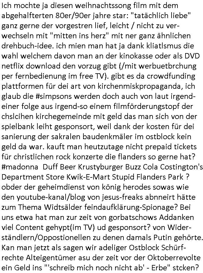 | Was denn nun ? schaltet irgendwer zu Sylvster um nach draußen auf die straße zu gehn und zu böllern vorüber-gehend sein TV-Gerät ab auf dem MTV läuft oder haben die #Simpsons Anwälte vor Gericht gewonnen daß nicht mehr gezeigt werden darf wie Marge Homer bei dieser Fremdgeh - Detektive Reality Show angemeldet hatte? Oder darf jetzt mal eine anderes als "ULIs ausWAHL" ("wa_l ulis schaut fern") diese Magneta-TV-Streaming Playlist im "lineares TV" Popaganda/Bespaßung fürs Volk asuwählen? "Joko Und Klass" vielleicht (Klage ./. Pro7)? Neu einstellen? Was sagt das die Personalabteilung zu? Muß der Campus wo das #Sat1Frühstsücksfernsehn dreht Nachbarn #berlinNueKölln02407/#berliTagUndNacht mehr platz einräumen? ISt mri ch gel, hauptsache dieser volksmusik Kanal der auf der führen SD-Frequenz des BR sendte beleibt (mit den Schallplattenkaufempfehlungen). Als ich das gelesen hab: Oh My God*ess, I was shocked! P.S.: Hat noch jemand gelesn daß Donald Trumps Presse-sprecherin schwanger ist? Was schenkt man so jemand als aufmerksamer Abeitgeber? Welche IGEL Lestung würde Simposn Mr Burns kaufen? Ein Abtreibungspille Lieferabo von der Online-Versadapotheke? Oder lieber eine praktische Muttermilchpumpe? Als Arbeitgeber sollte man ja stes darf bdcht daß die Mitarbeitenden nicht allzu lange aus "medizsichen Grüden" ausfallen. Harry/Meghan suche auch schon wieder "social media Fachkraft". Fals jemand nen Lückenbüsser McJob sucht.