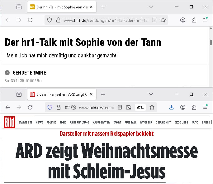 Daher finde ich das lustig wenn man bei zivilen Firmen von "officer"s spricht, ich find den Sprachgebrauch ver-räterisch, sind die spowas wie Küchen-Chefs/Chefköche? Zur Zeit der Treuhand-Rückabwicklung der VEBs/LPGs also der Re-Privatisierung der DDR/Osblock Wirtschaft und EU Gründung aus der GE ehrus gab es wirklich üer-aus interessant Blüten die das trieb (die Privatpost von Jil Snader list nach aufkauf druch Kokkurrent Vesace oder so). Schlimmer wurde es mit DNS-Domains / SSL-Certs. Stichwort Alteigentümer-Anspruch und multinationale Schiedsstellen. Was das mit beglaubigten Übersetzungen zu tun hat also Stellen für 3sat/Swissinfo.ch Personal? Ich erinner mich noch genau als man bei RTL die ersten Stellenstreichungen erahnen konnte als "Köln 50667" nur noch als galsafser pder Elon-Musk-Starlink-Intrenet/Netz-Streaming verfügbar war und nicht mehr wie zuvor im linearen (DVB-S) Astra Satellittenfernsehen. Und das GEZ-Zwansgabo TV macht auch die SD-Qualität Kanäle zu. Die Schweizer die 3sat mitfinanzieren sind der Meinung daß es genug deutschsprachig Angebote gibt den manmit einem Rundfunkbeitrag finanzierten Kanal genüer den rein werbfinanzierten Angeboten ein unfaire wettbwerbs-verzerrendes Konkurrenzumfeldsbedigungen aufzwinge. So lang Jornlsiten durch ein bedingungsloses grundein-kommen/pfändungsfreieheiet für Arbeits-matrelien wie kameras usw. sozial abgesichert sind ielobswerte Ansatz. Jedenfalls war es bei RTL so daß es diesen "Sonnenstudio Stalker", nen "ehemaligen Polizist" gab bei "Köln 50667" zeitnah dazu daß deise lang-haariege Blonde von dieser Morning-Show "Sat1 Frühstücksfernsehen" aus so eine Stalkerin hatte (Haar-Typ "geborene Ketchup-Expertin"). Da musste ich egstren drann denken wiel egstre in pro7 #taff kam daß "Ellie Goulding" schwanger sei und ein Song von ihr eine der letzten Folgen von "köln 50667" untermalte. Ich glaub das war ein Weichnachten nach-dem "Helene Fischer" ein Weihnachtsduett veröffent-licht hatte zusammen mit einem "Take That"-Boygroup Mitglied, ich mien isgcow egshen zu habn daß sie sich da selbst Kokurez mcht mit einem neuen Weihnachts-lieder Album dieses jahre, anders als "Mariah Carey". Ich würde da jetzt aber nicht bei "MTV guess the year" mitmachen wollen was das angeht aber es war nach-dem Marlne ufen vom Sat1-FrühstücksTV bei Böhmi war. Irgndwann damals hate die laghaarge blonde vom Sat1 Frühstücksfernshen die mich an "Trixie Dörfel's XMas Nightmare" erinnert hat weil sie mal in irgendsoeiner "klinik-paradies" arztserie mitspielte diese Sat1-Akte sonder-Sendung inder sie ihre Stalkerin aufspürte so "Oliver Stone" "Talk Radio" in Verbindung mit "die Blumen von gestrern" mit "Lars Eidinger" artig wo es um jdsüches osblcok ategteun und Kidnapping geht (siehe metallegsellscft Öl"). Und als "Köln 50667" nichtmerh gesendet wurde gab es da auch irgendwas mit "wellness" Kuren oder so. Sonnenstudio udn Sat1 FrühstücksTV mit Sonnenlogo. Ich hba ja berist mitgeteilt daß es da einen Zusammen-hnag gibt hsichlch der Quer-finanzierung der Sender als "Onkel Dagbeort grüsst seine Neffen" per "Livebe-richt-Interview vom Banken-Geiseldrama Gladbeck" "Siet ### Tagen gefanger der RFA" duch Kidnapping Erpressungen des Banken-sicherheitarbeitgeberverbands wo sie nebn Kaksusus öl die die postsowjetische Pleite-Raumfahrt finzern sollten per tele-"Shopping Queen" oder auch "facebook" zumInfided-Login bei der Internet Betsllananhmen für die TV-Shops die als #NECKERMANN Insolvanz amnmdlet udndort das Inetrexion-DeCIX entstand wie pilze aus dem "amazon.com" boden (sihe 3sat kulturzet kinderbuchtipp) schossen. (Synergieffekte bei Onlinebanking/-brokerage). iche riner mich noch gut wie 3sat damals (von Eutelsat her?) begann aufs Astra Satellitten Grid zu expandieren. Das hate nälhc alleswas mit billigen Raketenstarts nach dem zusammenbruch der UdSSR Raumfahrt zu tun. Und zeitgleich dazu baute man dann das WWW-Intrent auf. https://www.bild.de/unterhaltung/tv-fernsehformate/rtl-baut-600-stellen-ab-ceo-massnahmen-zwingend-notwendig-692e9c441b3201955317e498 https://www.reporter-ohne-grenzen.de/artikel/pressemitteilungen/4129/informationsportal-des-rundfunks-und-3sat-in-gefahr-rsf-unterstutzt-petition https://www.promiflash.de/news/2025/12/02/mariah-careys-weihnachts-hit-ein-jaehrliches-millionenwunder.html https://www.bild.de/unterhaltung/stars-und-leute/ellie-goulding-erneut-schwanger-692df63c46f39b6230ff7993 https://www.youtube.com/watch?v=rio6RI9c6o0 https://www.stern.de/kultur/tv/-weihnachten-mit-trixie-doerfel---olli-dittrich-als-engelblonde-saengerin-7793972.html https://www.rtl2.de/sendungen/koeln-50667/videos/1100105533-noah-befreit-sandra https://de.wikipedia.org/wiki/Die_Blumen_von_gestern https://www.youtube.com/watch?v=7G0VahyY9GE | |
