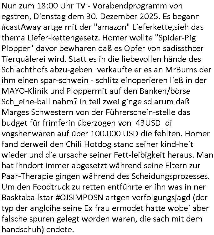 | Nun zum 18:00 Uhr TV - Vorabendprogramm von egstren, Dienstag dem 30. Dezember 2025. Es begann #castAway artge mit der "amazon" Lieferkette,sieh das thema Liefer-kettengesetz. Homer wollte "Spider-Pig Plopper" davor bewharen daß es Opfer von sadissthcer Tierquälerei wird. Statt es in die liebevollen hände des Schlachthofs abzu-geben verkaufte er es an MrBurns der ihm einen spar-schwein - schlitz einoperieren ließ in der MAYO-Klinik und Ploppermit auf den Banken/börse Sch_eine-ball nahm? In teil zwei ginge sd arum daß Marges Schwestern von der Führerschein-stelle das budget für frimferin überzogen von 43USD di vogshenwaren auf über 100.000 USD die fehlten. Homer fand derweil den Chili Hotdog stand seiner kind-heit wieder und die ursache seiner Fett-leibigkeit heraus. Man hat ihndort immer abgesetzt während seine Eltern zur Paar-Therapie gingen während des Scheidungsprozesses. Um den Foodtruck zu retten entführte er ihn was in ner Basktaballstar #OJSIMPOSN artgen verfolgungsjagd (der typ der anglcihe seine Ex frau ermodet hatte wobei aber falsche spuren gelegt worden waren, die sach mit dem handschuh) endete.