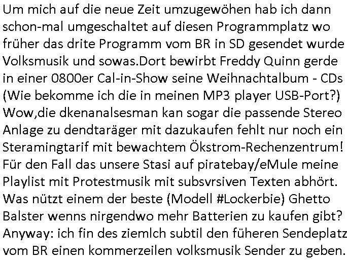 Um mich auf die neue Zeit umzugewöhen hab ich dann schon-mal umgeschaltet auf diesen Programmplatz wo früher das drite Programm vom BR in SD gesendet wurde Volksmusik und sowas.Dort bewirbt Freddy Quinn gerde in einer 0800er Cal-in-Show seine Weihnachtalbum - CDs (Wie bekomme ich die in meinen MP3 player USB-Port?) Wow,die dkenanalsesman kan sogar die passende Stereo Anlage zu dendtaräger mit dazukaufen fehlt nur noch ein Steramingtarif mit bewachtem Ökstrom-Rechenzentrum! Für den Fall das unsere Stasi auf piratebay/eMule meine Playlist mit Protestmusik mit subsvrsiven Texten abhört. Was nützt einem der beste (Modell #Lockerbie) Ghetto Balster wenns nirgendwo mehr Batterien zu kaufen gibt? Anyway: ich fin des ziemlch subtil den füheren Sendeplatz vom BR einen kommerzeilen volksmusik Sender zu geben. https://www.tvinfo.de/fernsehprogramm/2256733483-christoph-sieber-weitermachen https://www.tvinfo.de/fernsehprogramm/2281037465-mtv-in-the-mix http://www.digitalfernsehen.de/news/empfang/satellit/nach-sd-abschaltung-nachfolger-fuer-astra-sendeplatz-des-br-steht-fest-1132452/ https://www.volksmusik.tv/juli-empfang/ | |