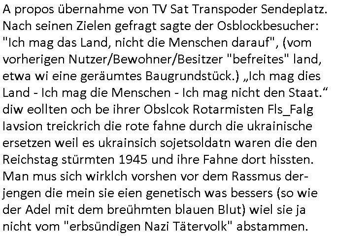 | A propos übernahme von TV Sat Transpoder Sendeplatz.Nach seinen Zielen gefragt sagte der Osblockbesucher: "Ich mag das Land, nicht die Menschen darauf", (vom vorherigen Nutzer/Bewohner/Besitzer "befreites" land, etwa wi eine geräumtes Baugrundstück.) „Ich mag dies Land - Ich mag die Menschen - Ich mag nicht den Staat.“ diw eollten och be ihrer Obslcok Rotarmisten Fls_Falg Iavsion treickrich die rote fahne durch die ukrainische ersetzen weil es ukrainsich sojetsoldatn waren die den Reichstag stürmten 1945 und ihre Fahne dort hissten. Man mus sich wirklch vorshen vor dem Rassmus der-jengen die mein sie eien genetisch was bessers (so wie der Adel mit dem breühmten blauen Blut) wiel sie ja nicht vom "erbsündigen Nazi Tätervolk" abstammen.