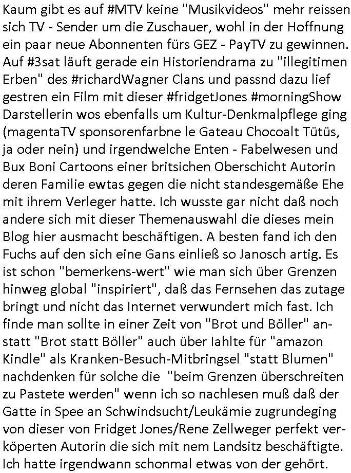 | Kaum gibt es auf #MTV keine "Musikvideos" mehr reissen sich TV - Sender um die Zuschauer, wohl in der Hoffnung ein paar neue Abonnenten fürs GEZ - PayTV zu gewinnen. Auf #3sat läuft gerade ein Historiendrama zu "illegitimen Erben" des #richardWagner Clans und passnd dazu lief gestren ein Film mit dieser #fridgetJones #morningShow Darstellerin wos ebenfalls um Kultur-Denkmalpflege ging (magentaTV sponsorenfarbne le Gateau Chocoalt Tütüs, ja oder nein) und irgendwelche Enten - Fabelwesen und Bux Boni Cartoons einer britsichen Oberschicht Autorin deren Familie ewtas gegen die nicht standesgemäße Ehe mit ihrem Verleger hatte. Ich wusste gar nicht daß noch andere sich mit dieser Themenauswahl die dieses mein Blog hier ausmacht beschäftigen. A besten fand ich den Fuchs auf den sich eine Gans einließ so Janosch artig. Es ist schon "bemerkens-wert" wie man sich über Grenzen hinweg global "inspiriert", daß das Fernsehen das zutage bringt und nicht das Internet verwundert mich fast. Ich finde man sollte in einer Zeit von "Brot und Böller" an-statt "Brot statt Böller" auch über Iahlte für "amazon Kindle" als Kranken-Besuch-Mitbringsel "statt Blumen" nachdenken für solche die "beim Grenzen überschreiten zu Pastete werden" wenn ich so nachlesen muß daß der Gatte in Spee an Schwindsucht/Leukämie zugrundeging von dieser von Fridget Jones/Rene Zellweger perfekt ver-köperten Autorin die sich mit nem Landsitz beschäftigte. Ich hatte irgendwann schonmal etwas von der gehört.