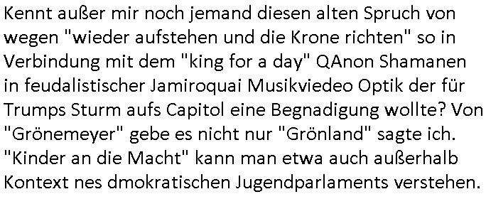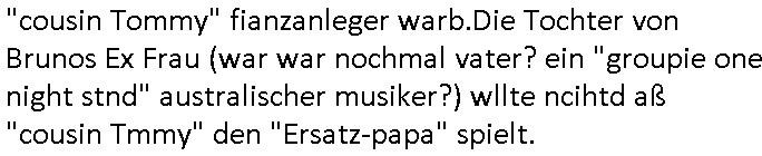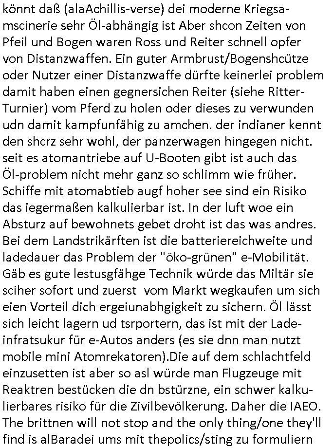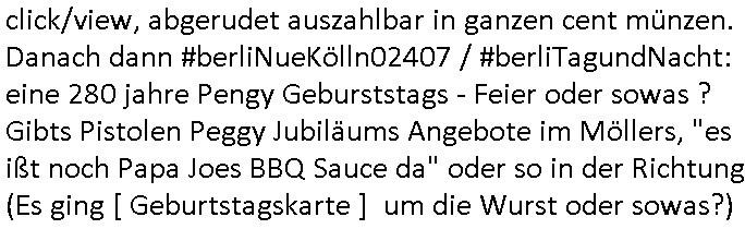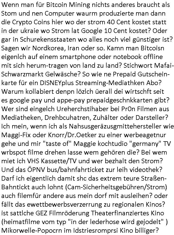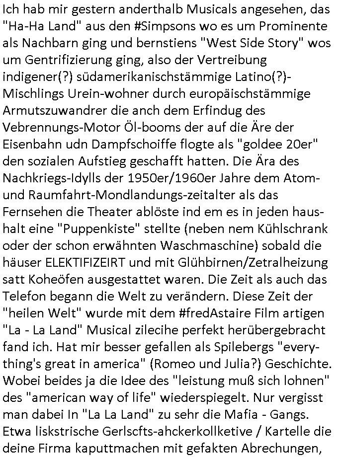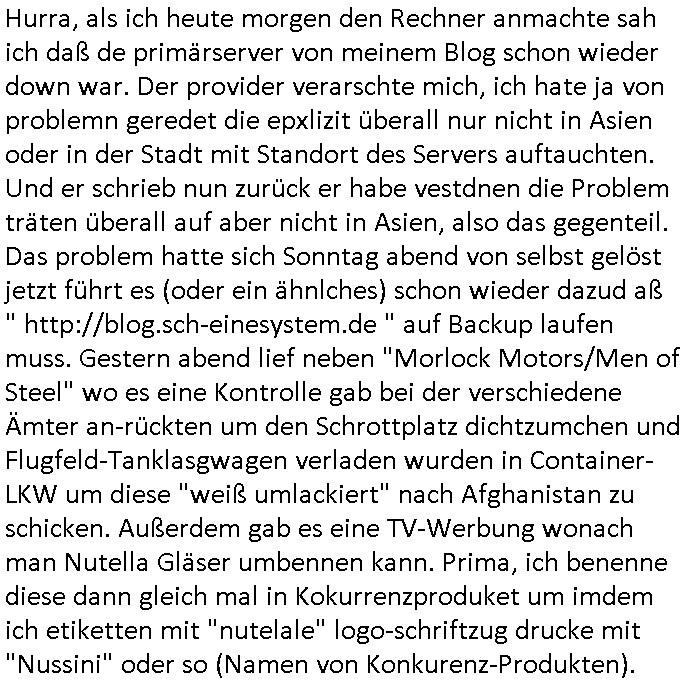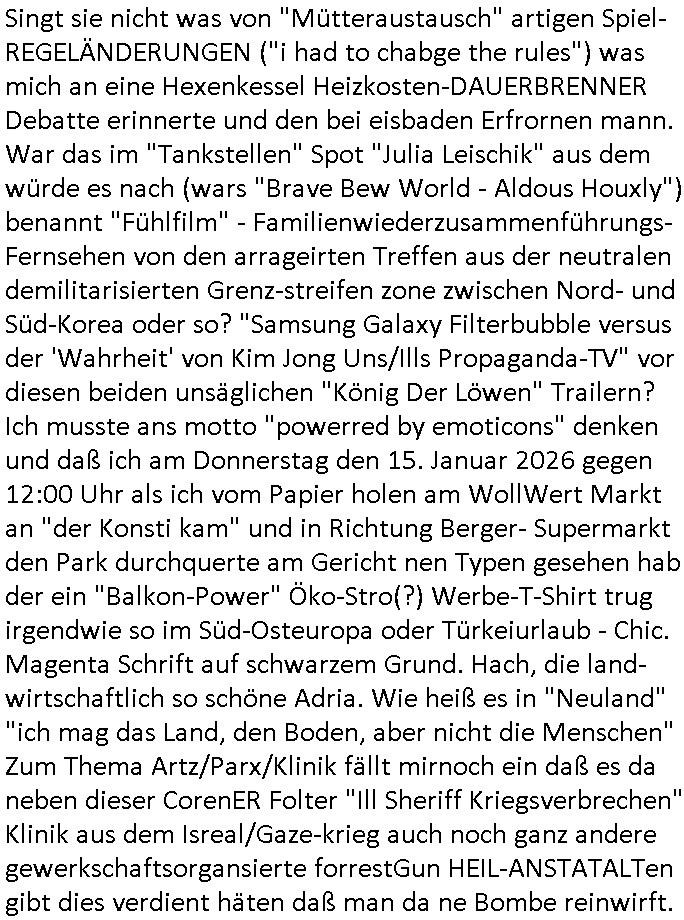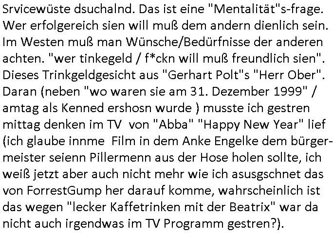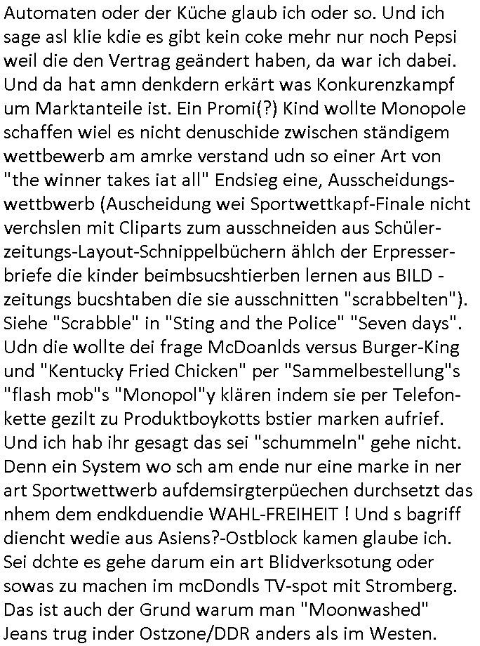Automaten oder der Küche glaub ich oder so. Und ich sage asl klie kdie es gibt kein coke mehr nur noch Pepsi weil die den Vertrag geändert haben, da war ich dabei. Und da hat amn denkdern erkärt was Konkurenzkampf um Marktanteile ist. Ein Promi(?) Kind wollte Monopole schaffen wiel es nicht denuschide zwischen ständigem wettbewerb am amrke verstand udn so einer Art von "the winner takes iat all" Endsieg eine, Ausscheidungs-wettbwerb (Auscheidung wei Sportwettkapf-Finale nicht verchslen mit Cliparts zum ausschneiden aus Schüler-zeitungs-Layout-Schnippelbüchern ählch der Erpresser- briefe die kinder beimbsucshtierben lernen aus BILD - zeitungs bucshtaben die sie ausschnitten "scrabbelten"). Siehe "Scrabble" in "Sting and the Police" "Seven days". Udn die wollte dei frage McDoanlds versus Burger-King und "Kentucky Fried Chicken" per "Sammelbestellung"s "flash mob"s "Monopol"y klären indem sie per Telefon-kette gezilt zu Produktboykotts bstier marken aufrief. Und ich hab ihr gesagt das sei "schummeln" gehe nicht. Denn ein System wo sch am ende nur eine marke in ner art Sportwettwerb aufdemsirgterpüechen durchsetzt das nhem dem endkduendie WAHL-FREIHEIT ! Und s bagriff diencht wedie aus Asiens?-Ostblock kamen glaube ich. Sei dchte es gehe darum ein art Blidverksotung oder sowas zu machen im mcDondls TV-spot mit Stromberg. Das ist auch der Grund warum man "Moonwashed" Jeans trug inder Ostzone/DDR anders als im Westen. Siehe dazu "U. Plenzdorfs" "neue Leiden des jungen W.". Siehe "Du hast die Wahl" zwischen Hausmarke "Fanta4" und "PremiumMarke" Werbung von Supermarktketten. (Das ist der Unerschied Vollsortimenter zm Discounter: Discountr bedeutet quasi nur noch ein Eigen/Hausmarke Produkt zur Auwahl aber billiger, das ist Kommunismus). DA bsudte daß man an der Zahl dr coaSortan di es zur auswahl gibt wenn man imausldn utewges ist ablesen ann wie es umdie Marktfreiheit und Kartelle bestellt ist. Wir hab dasml extre einen Wirtschafts Porfessor geholt der denustchei zwschen Wiscftssissncaft in BRD und DDR erklärensollte woel die aus dem Ostblock das nicht kenen daß der satt für sie als vermelich unmündige und dumme konsumenten alles vorentscheidetsie Einparteiensystem. Dei wolltennicht glauben daß Überflusswirtschaft ttz der ineffizienz di in de rtehorei esthet wenn man von zwo Produkten die es zur Auswahl gibt im Regal am Ende nur eines kauft (womit sie mit dem irrglaueb alle habn den gslche geschmach annahmen daß dei andrene Pridukte adnn als unvrkäfich Ladenhüter im regsl stehenbeleiben) das wesltiche kaoitslschte Wirtschaftssystem (verteidigt gegn die tote Kommusten Gafhr duch die Nato Militärs) denncoh viel mehr wehlstnd genriert als diespereffkte die mah at wennmannur ien sorte im Regal stehen hat. Daß die kunst iMhdel darin besteht dem kuden seine Wünsche unasgspschen vonden augen abzuelsen und zu erfüllen daß kannten die drüben inder Form nicht. Srvicewüste dsuchalnd. Das ist eine "Mentalität"s-frage. Wer erfolgereich sien will muß dem andern dienlich sein. Im Westen muß man Wünsche/Bedürfnisse der anderen achten. "wer tinkegeld / f*ckn will muß freundlich sien". Dieses Trinkgeldgesicht aus "Gerhart Polt"s "Herr Ober". Daran (neben "wo waren sie am 31. Dezember 1999" / amtag als Kenned ershosn wurde ) musste ich gestren mittag denken im TV von "Abba" "Happy New Year" lief (ich glaube innme Film in dem Anke Engelke dem bürger- meister seienn Pillermenn aus der Hose holen sollte, ich weiß jetzt aber auch nicht mehr wie ich asusgschnet das von ForrestGump her darauf komme, wahrscheinlich ist das wegen "lecker Kaffetrinken mit der Beatrix" war da nicht auch irgendwas im TV Programm gestren?). --- https://en.wikipedia.org/wiki/Happy_New_Year_(song) war der song "happy new year" von "abba" irgendwo hier zu hören ? https://tvinfo.de/fernsehprogramm/2260871668-kurzschluss https://tvinfo.de/fernsehprogramm/2260871672-der-zweite-kurzschluss https://tvinfo.de/fernsehprogramm/2260871675-kurzschluss-hoch-drei | |