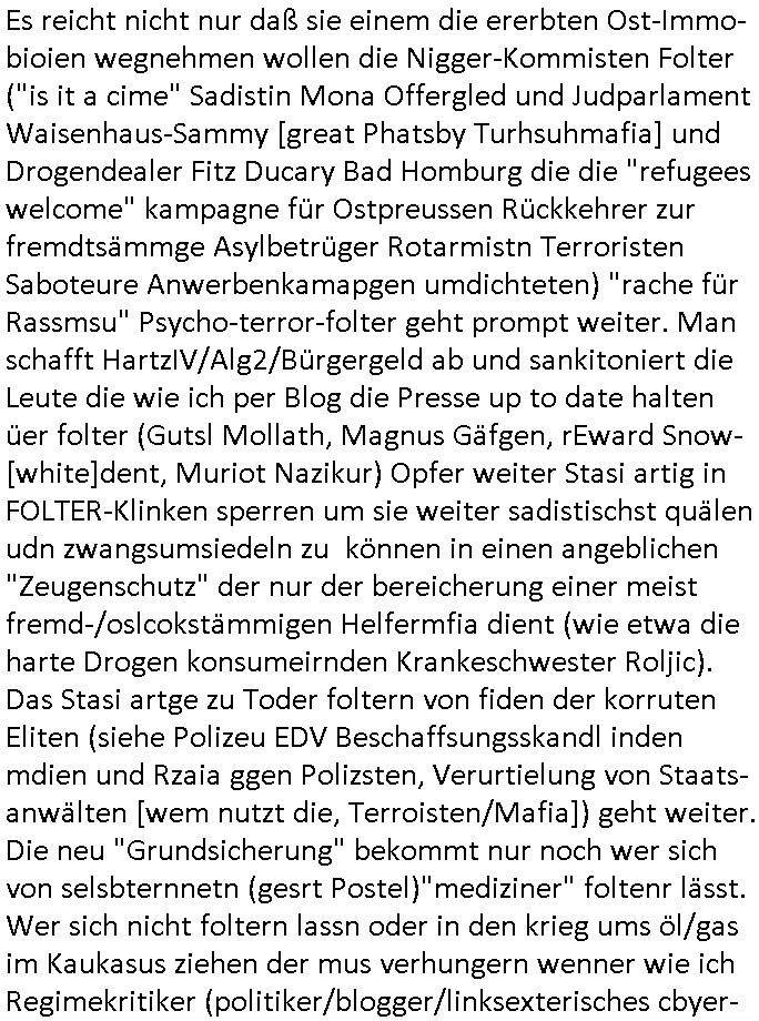 | Es reicht nicht nur daß sie einem die ererbten Ost-Immo-bioien wegnehmen wollen die Nigger-Kommisten Folter ("is it a cime" Sadistin Mona Offergled und Judparlament Waisenhaus-Sammy [great Phatsby Turhsuhmafia] und Drogendealer Fitz Ducary Bad Homburg die die "refugees welcome" kampagne für Ostpreussen Rückkehrer zur fremdtsämmge Asylbetrüger Rotarmistn Terroristen Saboteure Anwerbenkamapgen umdichteten) "rache für Rassmsu" Psycho-terror-folter geht prompt weiter. Man schafft HartzIV/Alg2/Bürgergeld ab und sankitoniert die Leute die wie ich per Blog die Presse up to date halten üer folter (Gutsl Mollath, Magnus Gäfgen, rEward Snow-[white]dent, Muriot Nazikur) Opfer weiter Stasi artig in FOLTER-Klinken sperren um sie weiter sadistischst quälen udn zwangsumsiedeln zu können in einen angeblichen "Zeugenschutz" der nur der bereicherung einer meist fremd-/oslcokstämmigen Helfermfia dient (wie etwa die harte Drogen konsumeirnden Krankeschwester Roljic). Das Stasi artge zu Toder foltern von fiden der korruten Eliten (siehe Polizeu EDV Beschaffsungsskandl inden mdien und Rzaia ggen Polizsten, Verurtielung von Staats-anwälten [wem nutzt die, Terroisten/Mafia]) geht weiter. Die neu "Grundsicherung" bekommt nur noch wer sich von selsbternnetn (gesrt Postel)"mediziner" foltenr lässt. Wer sich nicht foltern lassn oder in den krieg ums öl/gas im Kaukasus ziehen der mus verhungern wenner wie ich Regimekritiker (politiker/blogger/linksexterisches cbyer-