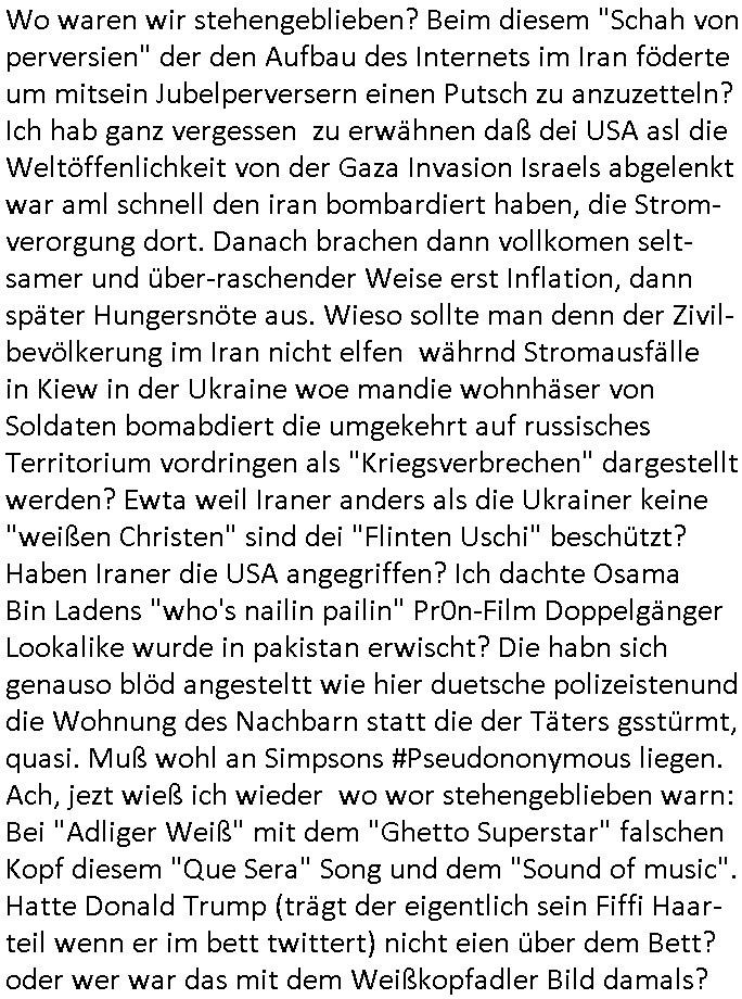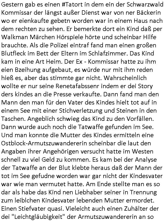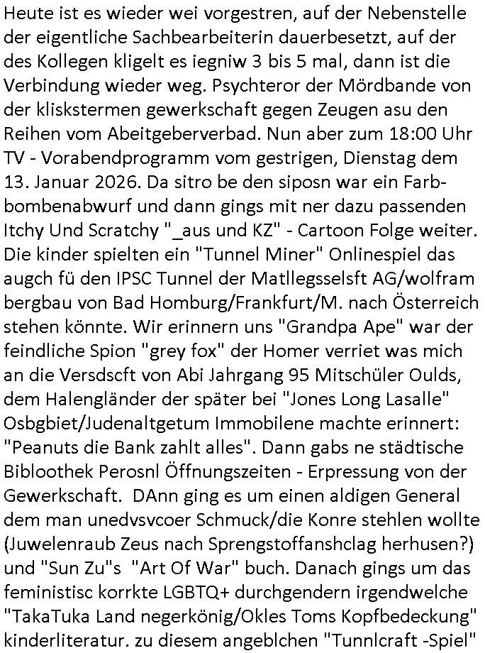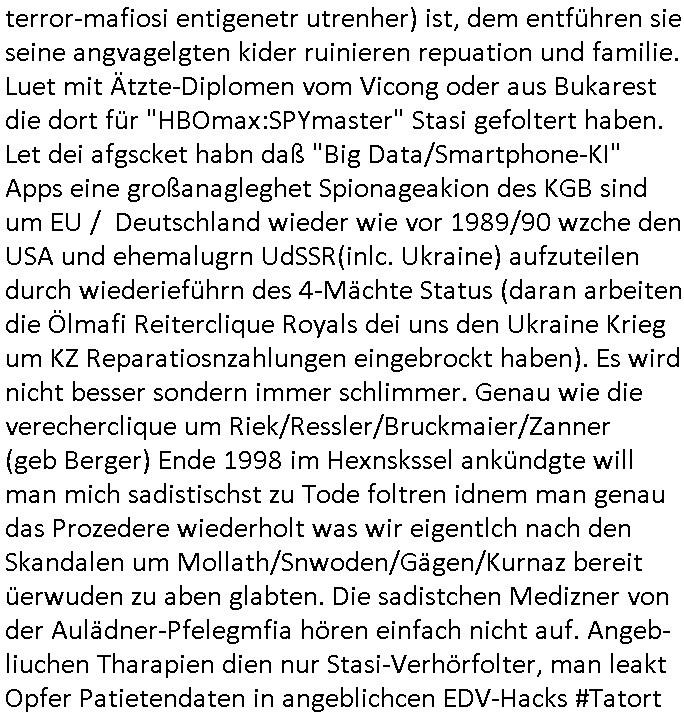 terror-mafiosi entigenetr utrenher) ist, dem entführen sie seine angvagelgten kider ruinieren repuation und familie. Luet mit Ätzte-Diplomen vom Vicong oder aus Bukarest die dort für "HBOmax:SPYmaster" Stasi gefoltert haben. Let dei afgscket habn daß "Big Data/Smartphone-KI" Apps eine großanagleghet Spionageakion des KGB sind um EU / Deutschland wieder wie vor 1989/90 wzche den USA und ehemalugrn UdSSR(inlc. Ukraine) aufzuteilen durch wiederieführn des 4-Mächte Status (daran arbeiten die Ölmafi Reiterclique Royals dei uns den Ukraine Krieg um KZ Reparatiosnzahlungen eingebrockt haben). Es wird nicht besser sondern immer schlimmer. Genau wie die verecherclique um Riek/Ressler/Bruckmaier/Zanner (geb Berger) Ende 1998 im Hexnskssel ankündgte will man mich sadistischst zu Tode foltren idnem man genau das Prozedere wiederholt was wir eigentlch nach den Skandalen um Mollath/Snwoden/Gägen/Kurnaz bereit üerwuden zu aben glabten. Die sadistchen Medizner von der Aulädner-Pfelegmfia hören einfach nicht auf. Angeb-liuchen Tharapien dien nur Stasi-Verhörfolter, man leakt Opfer Patietendaten in angeblichcen EDV-Hacks #Tatort https://tvinfo.de/fernsehprogramm/2256592711-tatort | |