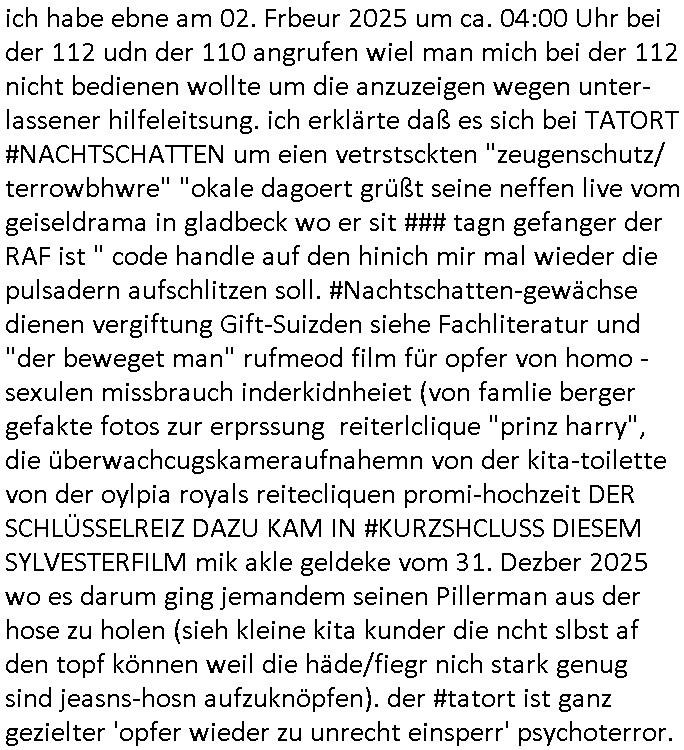 | ich habe ebne am 02. Frbeur 2025 um ca. 04:00 Uhr bei der 112 udn der 110 angrufen wiel man mich bei der 112 nicht bedienen wollte um die anzuzeigen wegen unter-lassener hilfeleitsung. ich erklärte daß es sich bei TATORT #NACHTSCHATTEN um eien vetrstsckten "zeugenschutz/ terrowbhwre" "okale dagoert grüßt seine neffen live vom geiseldrama in gladbeck wo er sit ### tagn gefanger der RAF ist " code handle auf den hinich mir mal wieder die pulsadern aufschlitzen soll. #Nachtschatten-gewächse dienen vergiftung Gift-Suizden siehe Fachliteratur und "der beweget man" rufmeod film für opfer von homo - sexulen missbrauch inderkidnheiet (von famlie berger gefakte fotos zur erprssung reiterlclique "prinz harry", die überwachcugskameraufnahemn von der kita-toilette von der oylpia royals reitecliquen promi-hochzeit DER SCHLÜSSELREIZ DAZU KAM IN #KURZSHCLUSS DIESEM SYLVESTERFILM mik akle geldeke vom 31. Dezber 2025 wo es darum ging jemandem seinen Pillerman aus der hose zu holen (sieh kleine kita kunder die ncht slbst af den topf können weil die häde/fiegr nich stark genug sind jeasns-hosn aufzuknöpfen). der #tatort ist ganz gezielter 'opfer wieder zu unrecht einsperr' psychoterror.