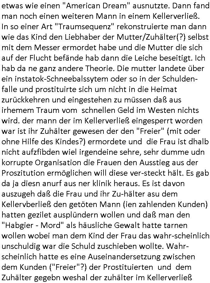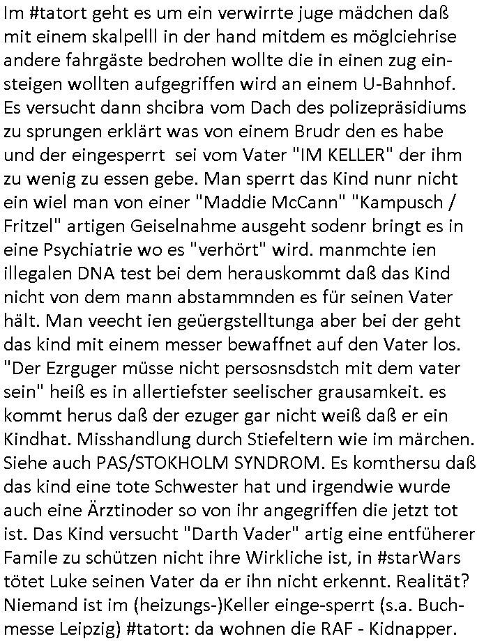 | Im #tatort geht es um ein verwirrte juge mädchen daß mit einem skalpelll in der hand mitdem es möglciehrise andere fahrgäste bedrohen wollte die in einen zug ein-steigen wollten aufgegriffen wird an einem U-Bahnhof.Es versucht dann shcibra vom Dach des polizepräsidiums zu sprungen erklärt was von einem Brudr den es habe und der eingesperrt sei vom Vater "IM KELLER" der ihm zu wenig zu essen gebe. Man sperrt das Kind nunr nicht ein wiel man von einer "Maddie McCann" "Kampusch / Fritzel" artigen Geiselnahme ausgeht sodenr bringt es in eine Psychiatrie wo es "verhört" wird. manmchte ien illegalen DNA test bei dem herauskommt daß das Kind nicht von dem mann abstammnden es für seinen Vater hält. Man veecht ien geüergstelltunga aber bei der geht das kind mit einem messer bewaffnet auf den Vater los. "Der Ezrguger müsse nicht persosnsdstch mit dem vater sein" heiß es in allertiefster seelischer grausamkeit. es kommt herus daß der ezuger gar nicht weiß daß er ein Kindhat. Misshandlung durch Stiefeltern wie im märchen. Siehe auch PAS/STOKHOLM SYNDROM. Es komthersu daß das kind eine tote Schwester hat und irgendwie wurde auch eine Ärztinoder so von ihr angegriffen die jetzt tot ist. Das Kind versucht "Darth Vader" artig eine entfüherer Famile zu schützen nicht ihre Wirkliche ist, in #starWars tötet Luke seinen Vater da er ihn nicht erkennt. Realität? Niemand ist im (heizungs-)Keller einge-sperrt (s.a. Buch-messe Leipzig) #tatort: da wohnen die RAF - Kidnapper.
