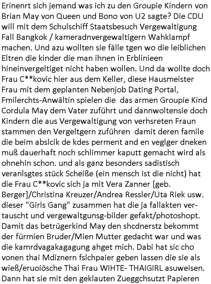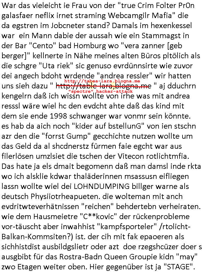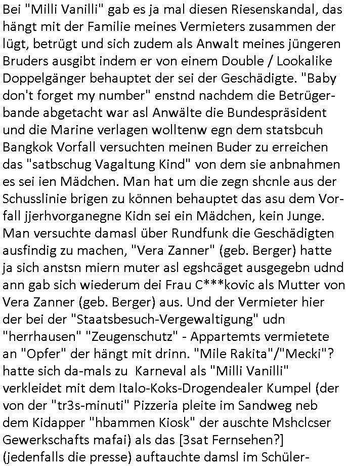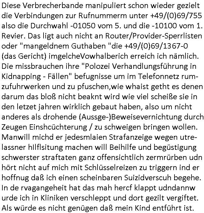 | Diese Verbrecherbande manipuliert schon wieder gezielt die Verbindungen zur Rufnummerm unter +49/(0)69/755 also die Durchwahl -01050 vom 5. und die -10100 vom 1. Revier. Das ligt auch nicht an Router/Provider-Sperrlisten oder "mangeldnem Guthaben "die +49/(0)69/1367-0 (das Gericht) imgelcheVowhalberich erreich ich nämlich. Die missbrauchen ihre "Polozei Verhandlungsführung in Kidnapping - Fällen" befugnisse um im Telefonnetz rum- zufuhrwerken und zu pfuschen,wie whaist getht es denen darum das bloß nicht beaknt wird wie viel scheiße sie in den letzet jahren wirklich gebaut haben, also um nicht anderes als drohende (Aussge-)Beweisevernichtung durch Zeugen Einshcüchterung / zu schweigen bringen wollen. Manwill michd er jedesmlaien Strafanzeige wegen utre-lassner hIlflsitung machen will Beihilfe und begüstigung schwerster straftaten ganz offensichtlich zermrürben udn hört nicht auf mich mit Schlüsselreizen zu triggern ind er hoffnug daß ich einen scheinbaren Suizidverscuh begehe. In de rvagangeheit hat das mah hercf klappt udndannw urde ich in Kliniken verschleppt und dort gezilt vergiftet. Als würde es nicht genügen daß mein Kind entführt ist.