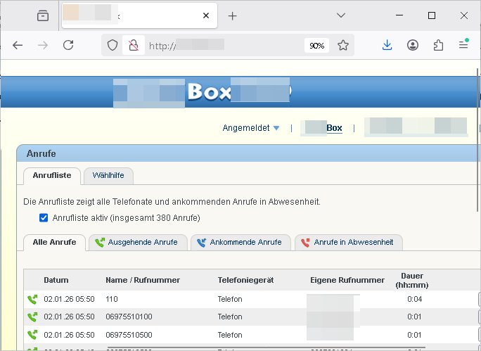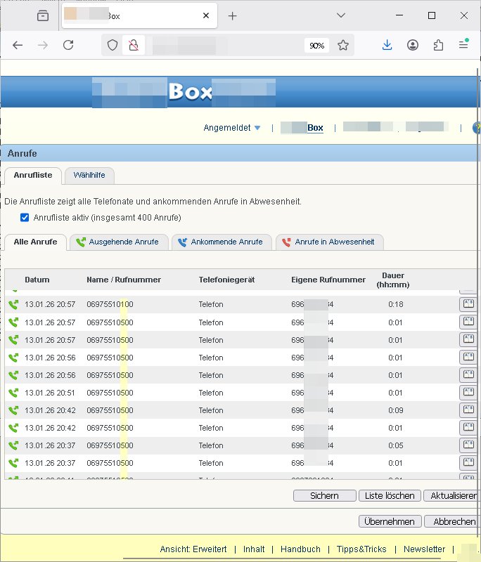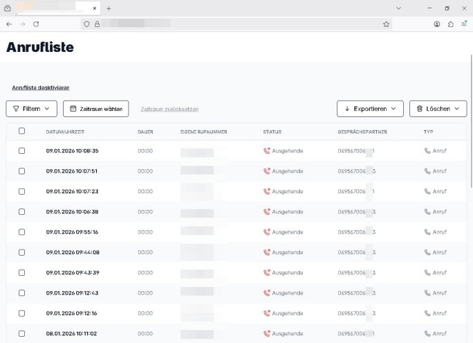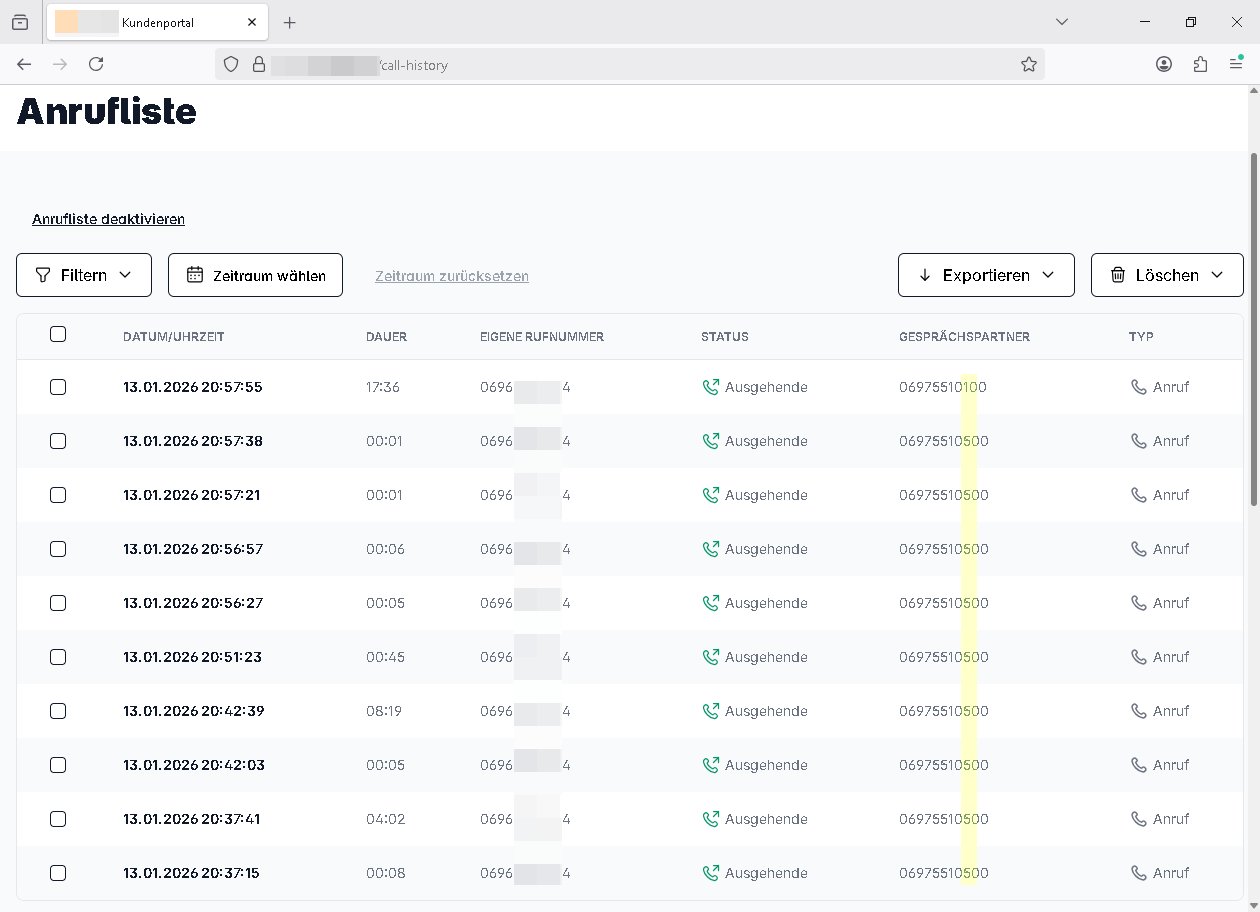 Datum Name / Rufnummer Dauer (hh:mm) 02.01.26 05:50 110 0:04 02.01.26 05:50 06975510100 0:01 02.01.26 05:50 06975510500 0:01 | |