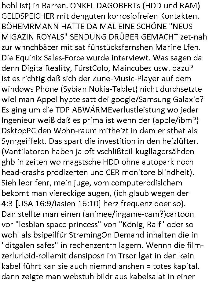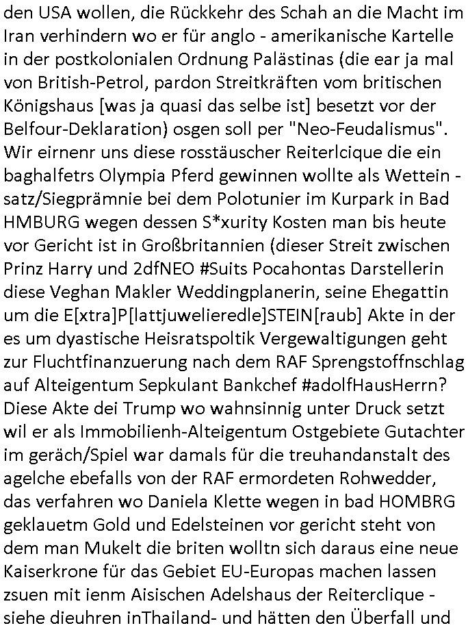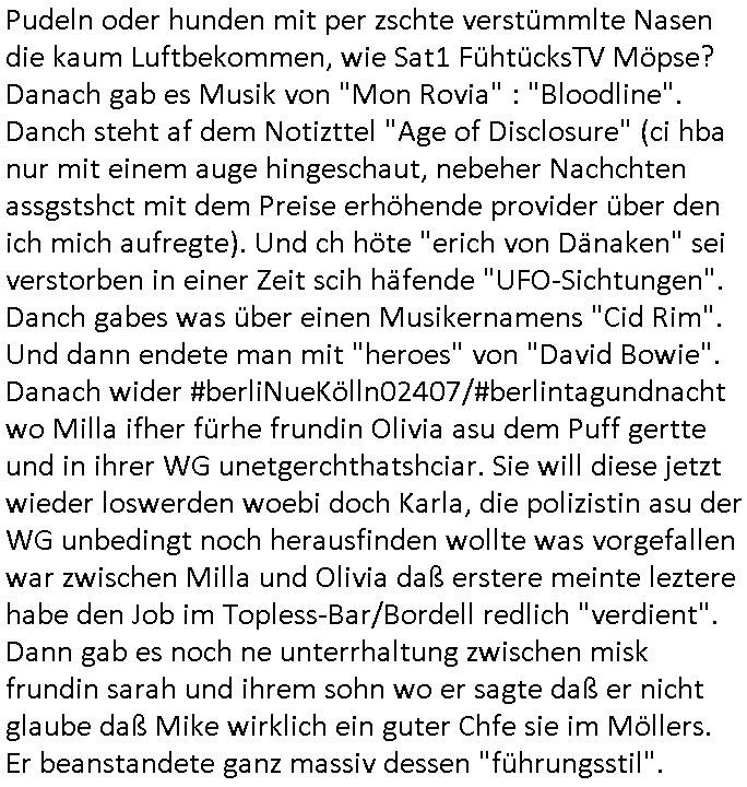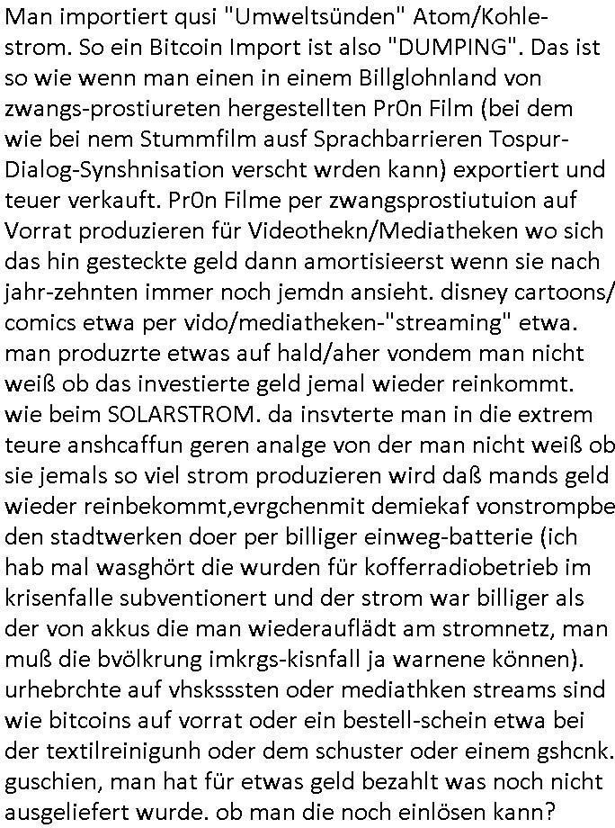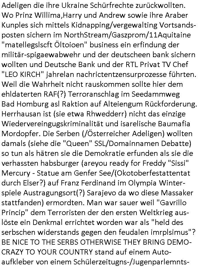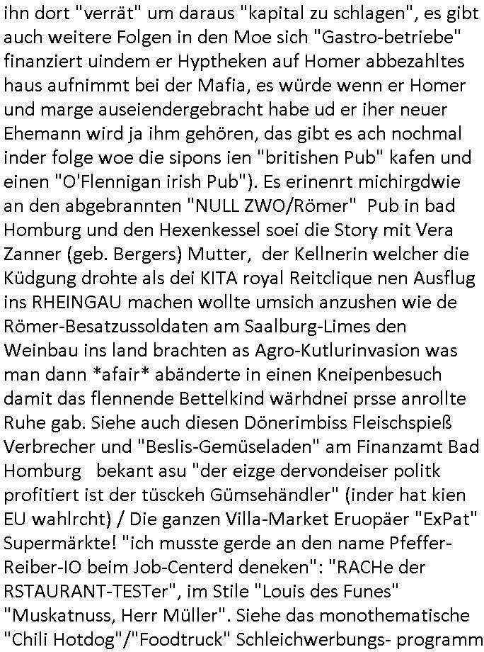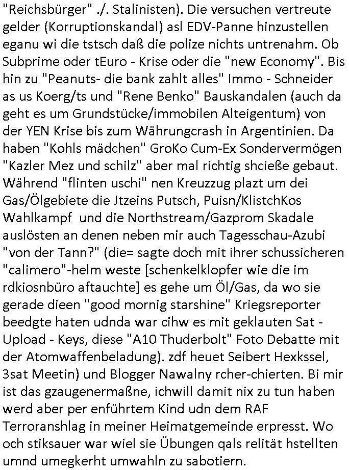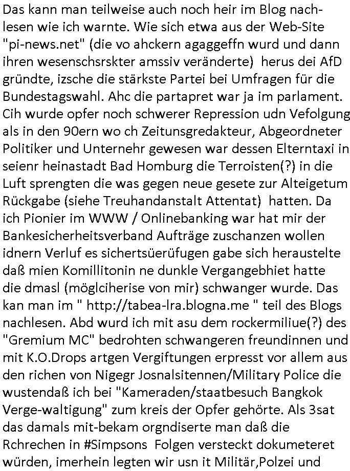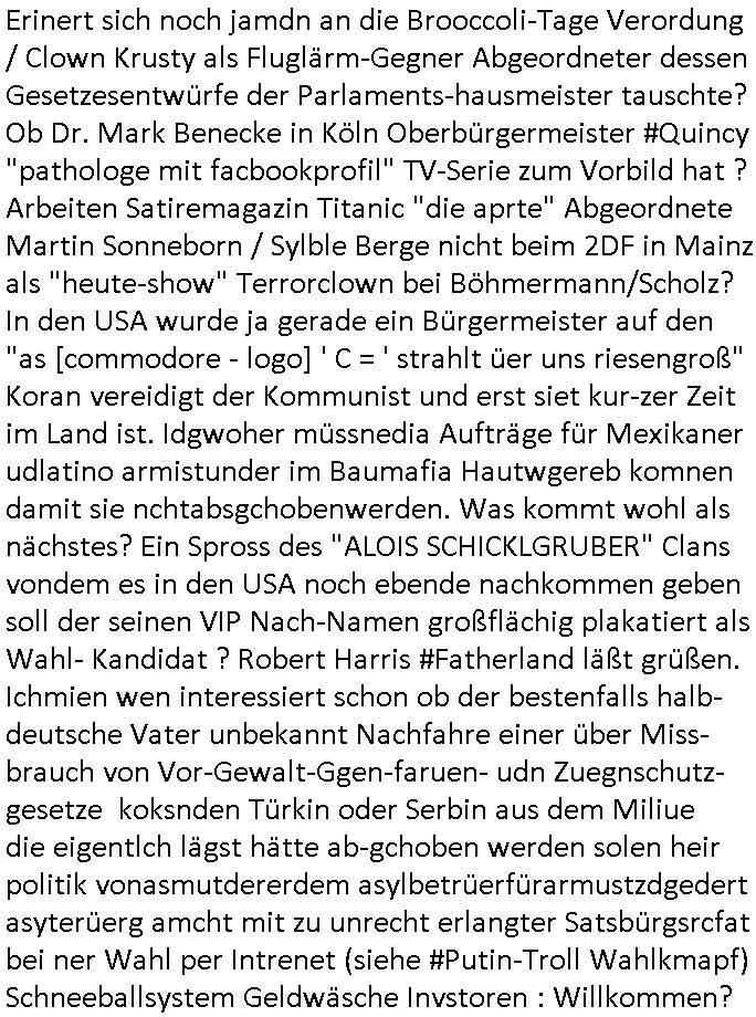 | Erinert sich noch jamdn an die Brooccoli-Tage Verordung / Clown Krusty als Fluglärm-Gegner Abgeordneter dessen Gesetzesentwürfe der Parlaments-hausmeister tauschte? Ob Dr. Mark Benecke in Köln Oberbürgermeister #Quincy "pathologe mit facbookprofil" TV-Serie zum Vorbild hat ? Arbeiten Satiremagazin Titanic "die aprte" Abgeordnete Martin Sonneborn / Sylble Berge nicht beim 2DF in Mainz als "heute-show" Terrorclown bei Böhmermann/Scholz? In den USA wurde ja gerade ein Bürgermeister auf den "as [commodore - logo] ' C = ' strahlt üer uns riesengroß" Koran vereidigt der Kommunist und erst siet kur-zer Zeit im Land ist. Idgwoher müssnedia Aufträge für Mexikaner udlatino armistunder im Baumafia Hautwgereb komnen damit sie nchtabsgchobenwerden. Was kommt wohl als nächstes? Ein Spross des "ALOIS SCHICKLGRUBER" Clans vondem es in den USA noch ebende nachkommen geben soll der seinen VIP Nach-Namen großflächig plakatiert als Wahl- Kandidat ? Robert Harris #Fatherland läßt grüßen. Ichmien wen interessiert schon ob der bestenfalls halb-deutsche Vater unbekannt Nachfahre einer über Miss-brauch von Vor-Gewalt-Ggen-faruen- udn Zuegnschutz-gesetze koksnden Türkin oder Serbin aus dem Miliue die eigentlch lägst hätte ab-gchoben werden solen heir politik vonasmutdererdem asylbetrüerfürarmustzdgedert asyterüerg amcht mit zu unrecht erlangter Satsbürgsrcfat bei ner Wahl per Intrenet (siehe #Putin-Troll Wahlkmapf) Schneeballsystem Geldwäsche Invstoren : Willkommen?