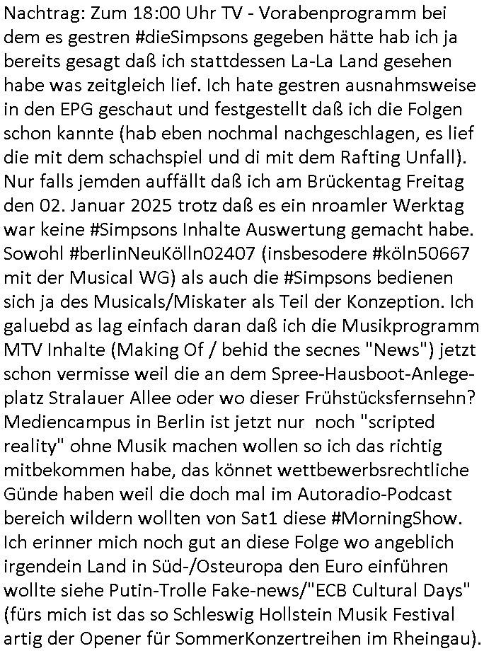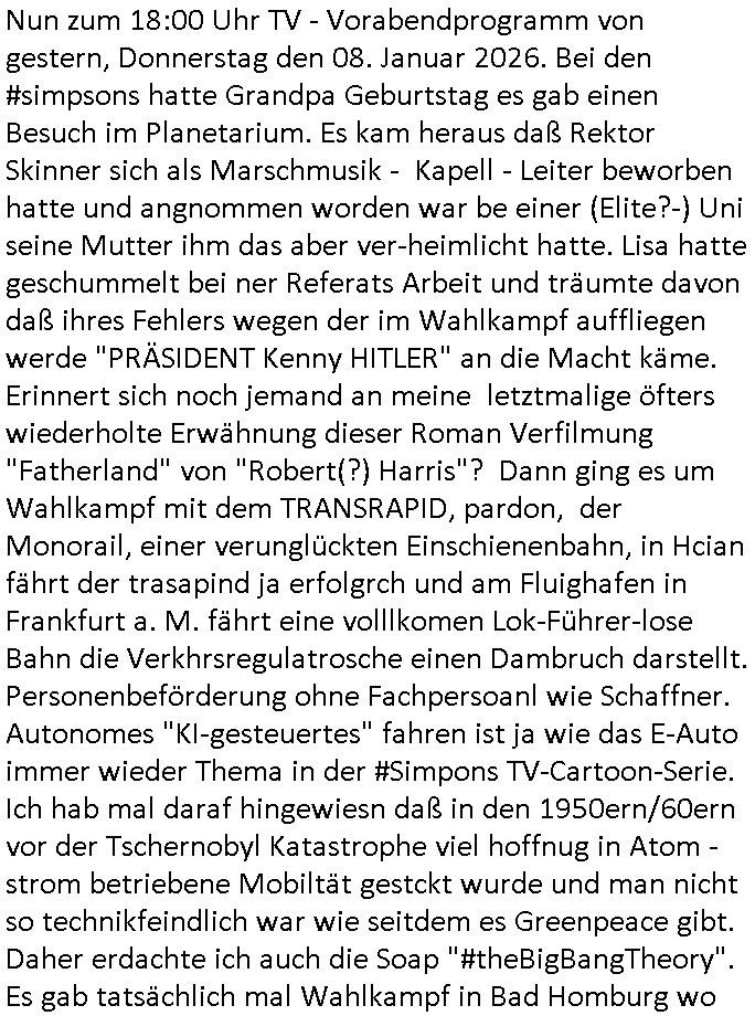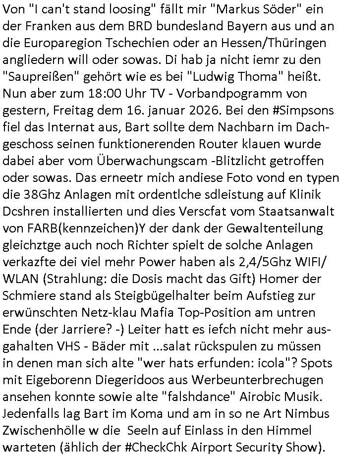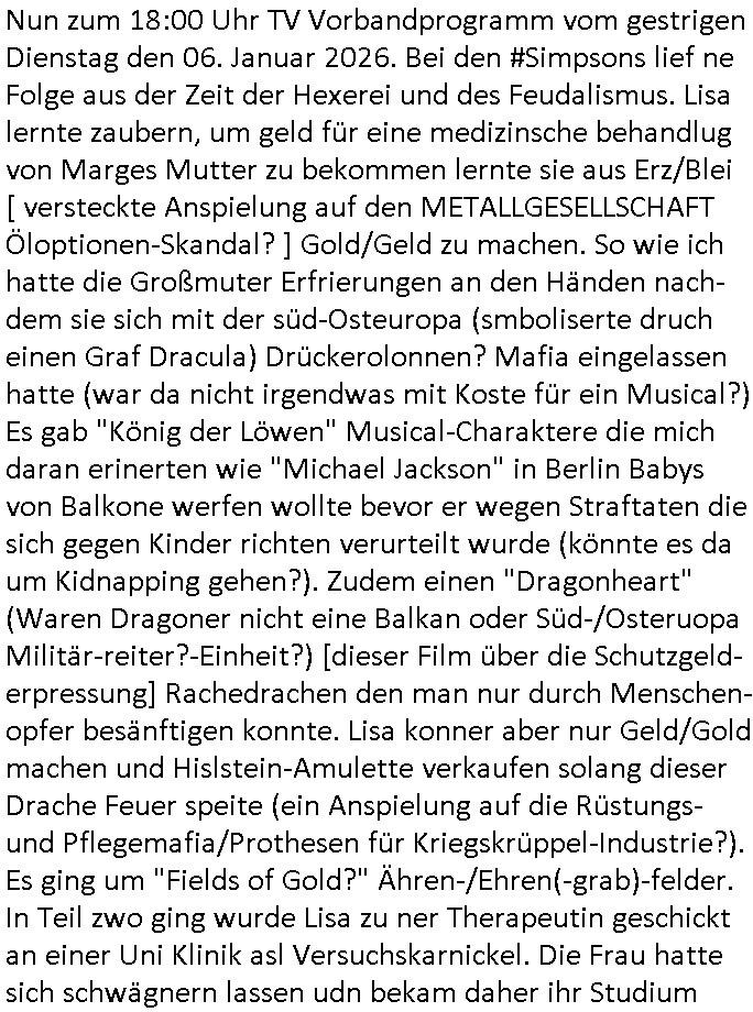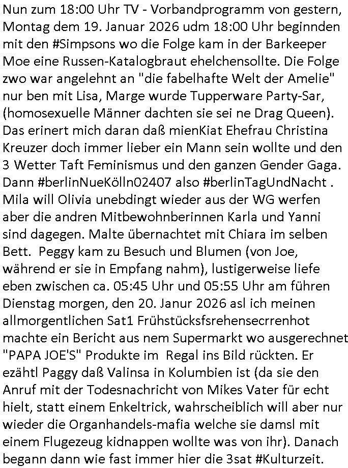 | Vom 18:00 Uhr TV - Vorabendprogramm von gestern, Donnerstag dem 29. Januar 2026 habe ich mal wieder den ersten Teil der #Simpsons verpasst weil ich noch das Schreiben ans Jobcenter fertigmachen musste wo es um möglicherweise abgefangene Post und um manipulierte Telefonie sowie Unfug mit DIN-5008 Diktatzeichen ging. Als ich einschaltete war Marge Simpson gerade mit dem Fällen von Bäumen beschäftigt, sie bewunderte irgend- eine "Timbersports" Athletin, das sind Personen die das Fälen von Bäumen zum Sport machen, in Schottland, so hab ich glaub ich mal im Frehsen gesehen gibt es wenn ich mich rcht entisnn Meisterschaften im Stämme durch die Gegend tragen. Mrge zog zu dieser Athletin in eine andere Stadt und Homer und die Kider/Familie mussten die Mutter mal wieder zurückholen. Danach dann wie immer #berlinNueKölln02407 / #berlinTagUndNacht wo Olivia wider zurück ist in Millas WG. Und Raphi plante eine Hochzeit mit einer Drohnen-Show. Danach dann die 3sat #Kulturzeit wo es um diese Abschiebepolizei "ICE" in den USA ging die Asbchiebekandidaten bei Anhörungen in Behörden einfing und Häuser stürmte. Danach kam ein Interview dazu. Dann eine Art Musikvideo von einer süd- amerikanischen Sängerin namens Gotop die etwas zu der Maduro - Verhaftung brachte, einen Protestsong dessen inhaltliche Botschaft an ihre Landsleute gerichtet war, es ging um manipulierte Wahlen und Maduros Nachfolgerin die noch schlinmer wäre als er. Dann Extremsport Videos