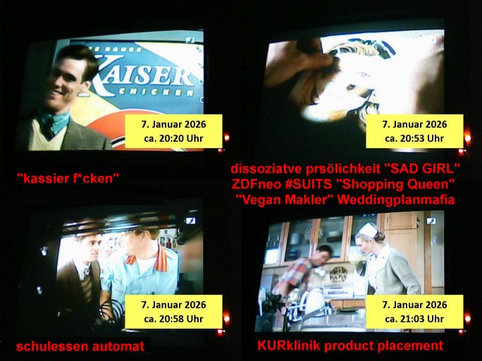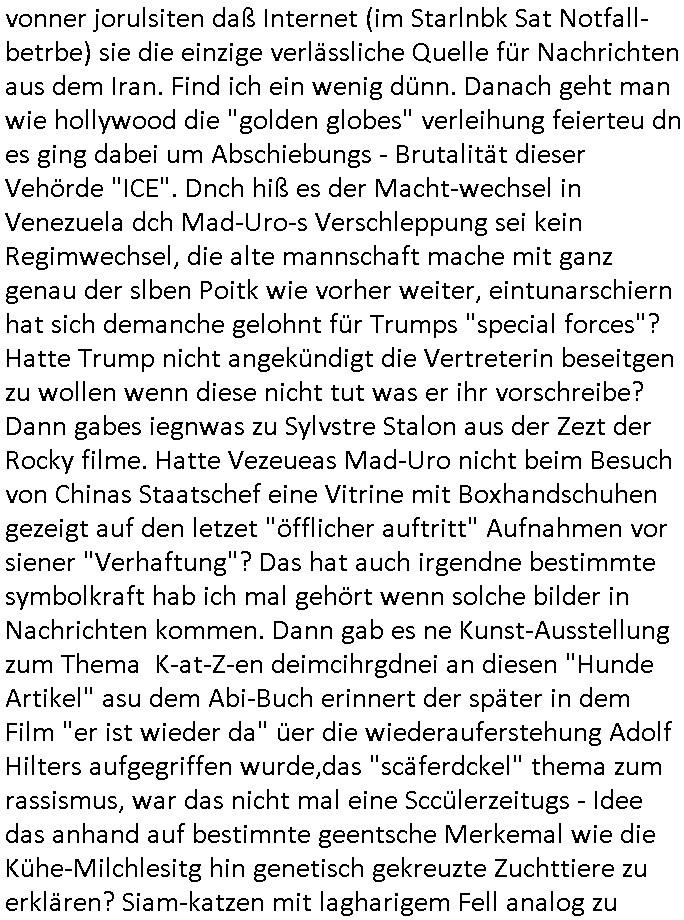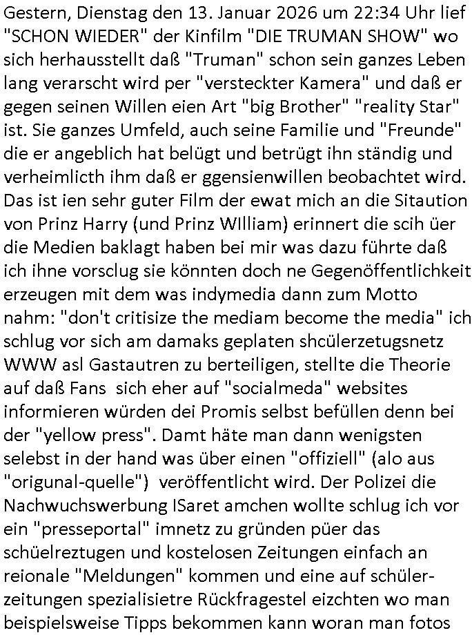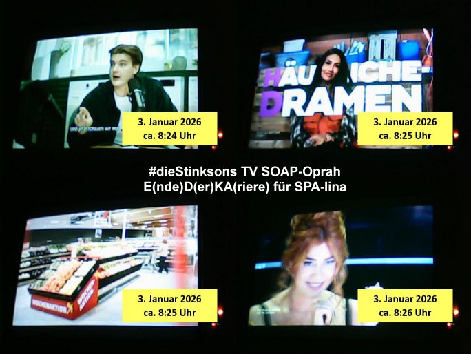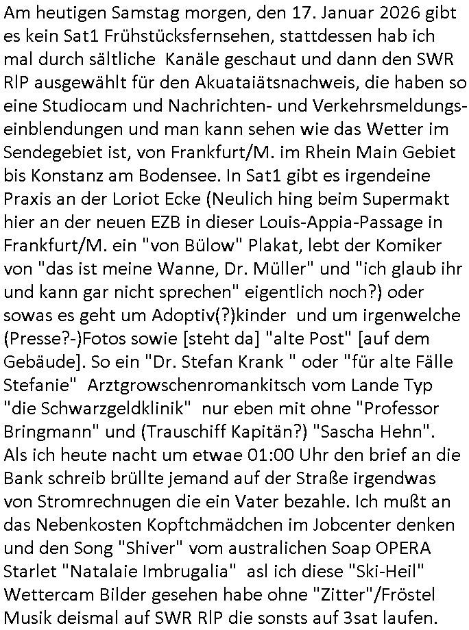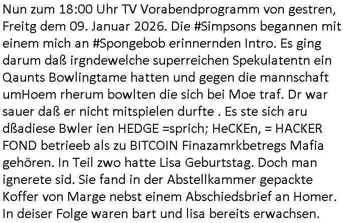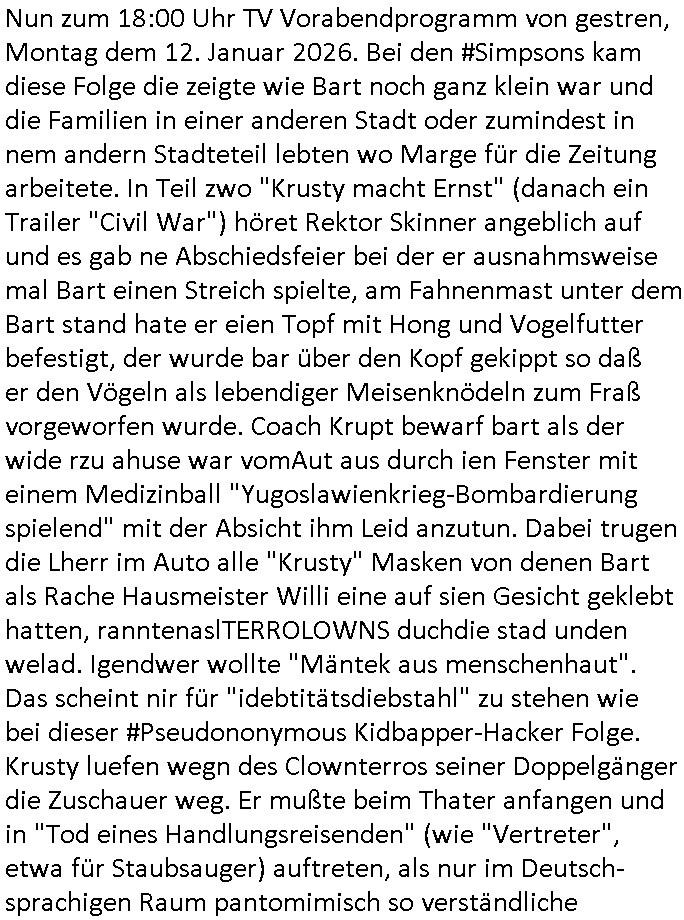 | Vom 18:00 Uhr TV - Vorabendprogramm von gestern, Donnerstag dem 29. Januar 2026 habe ich mal wieder den ersten Teil der #Simpsons verpasst weil ich noch das Schreiben ans Jobcenter fertigmachen musste wo es um möglicherweise abgefangene Post und um manipulierte Telefonie sowie Unfug mit DIN-5008 Diktatzeichen ging. Als ich einschaltete war Marge Simpson gerade mit dem Fällen von Bäumen beschäftigt, sie bewunderte irgend- eine "Timbersports" Athletin, das sind Personen die das Fälen von Bäumen zum Sport machen, in Schottland, so hab ich glaub ich mal im Frehsen gesehen gibt es wenn ich mich rcht entisnn Meisterschaften im Stämme durch die Gegend tragen. Mrge zog zu dieser Athletin in eine andere Stadt und Homer und die Kider/Familie mussten die Mutter mal wieder zurückholen. Danach dann wie immer #berlinNueKölln02407 / #berlinTagUndNacht wo Olivia wider zurück ist in Millas WG. Und Raphi plante eine Hochzeit mit einer Drohnen-Show. Danach dann die 3sat #Kulturzeit wo es um diese Abschiebepolizei "ICE" in den USA ging die Asbchiebekandidaten bei Anhörungen in Behörden einfing und Häuser stürmte. Danach kam ein Interview dazu. Dann eine Art Musikvideo von einer süd- amerikanischen Sängerin namens Gotop die etwas zu der Maduro - Verhaftung brachte, einen Protestsong dessen inhaltliche Botschaft an ihre Landsleute gerichtet war, es ging um manipulierte Wahlen und Maduros Nachfolgerin die noch schlinmer wäre als er. Dann Extremsport Videos