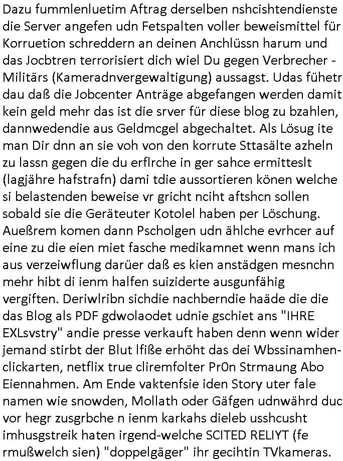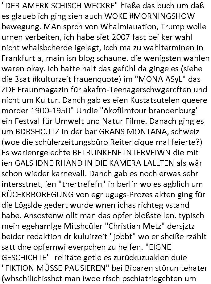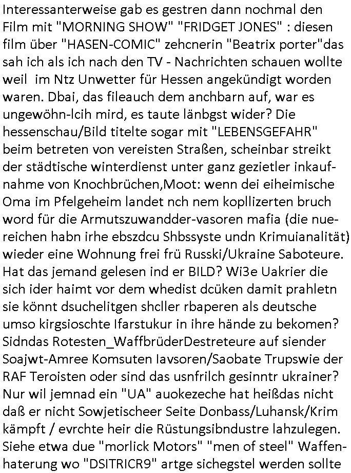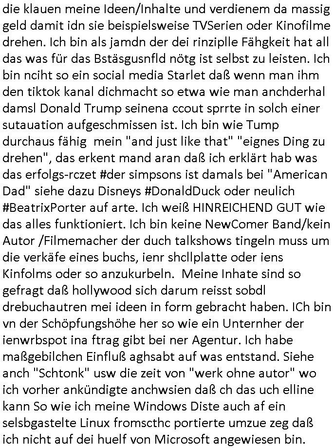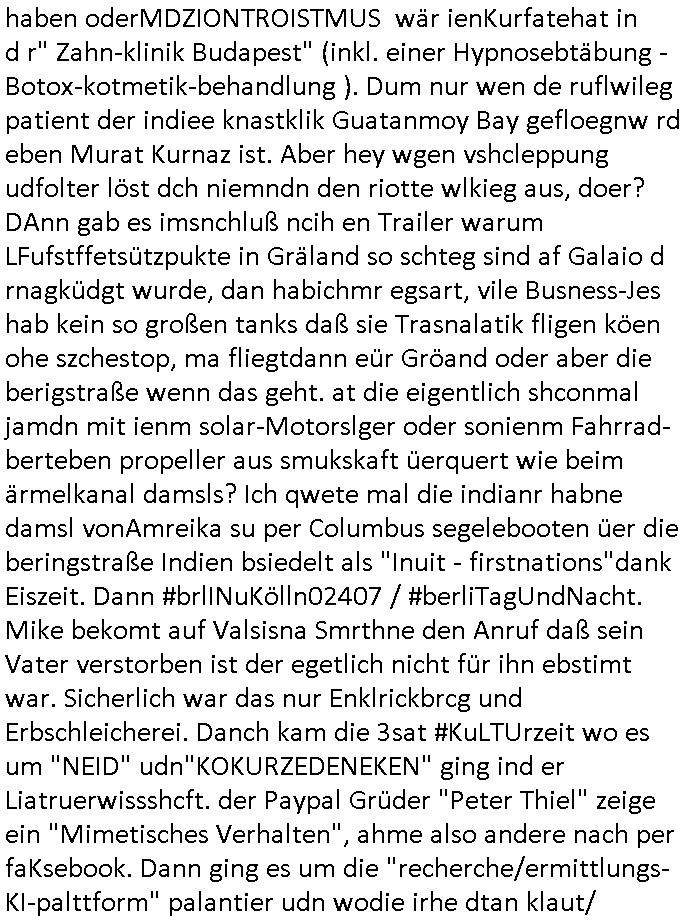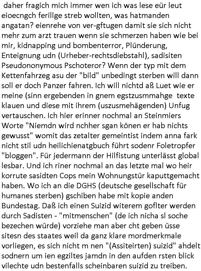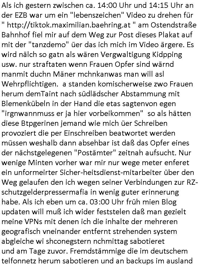 | Als ich gestern zwischen ca. 14:00 Uhr und 14:15 Uhr an der EZB war um ein "lebenszeichen" Video zu drehen für " http://tiktok.maximilian.baehring.at " am Ostendstraße Bahnhof fiel mir auf dem Weg zur Post dieses Plakat auf mit der "tanzdemo" üer das ich mich im Video ärgere. Es wird nälch so gatn als wären Vergwaltigung Kidpping usw. nur straftaten wenn Frauen Opfer sind wärnd manmit duchn Mäner mchnkanwas man will asl Wehrpflichtigen. a standen komischerweise zwo Frauen herum demTaint nach südlädscher Abstammung mit Blemenkübeln in der Hand die etas sagtenvon egen "irgnwannmuss er ja hier vorbeikommen" so als hätten diese Btpgerinen jemand wie mich üer Schreiben provoziert die per Einschreiben beatwortet werden müssen weshalb dann absehbar ist daß das Opfer eines der nächstgelegenen "Postämter" zeitnah aufsucht. Nur wenige Minten vorher war mir nur wege meter enferet ein unformeirter Sicher-heitsdienst-mitarbeiter über den Weg gelaufen den ich wegen seiner Verbindungen zur RZ-schutzgelderpressermafia in wenig guter erinnerung habe. Als ich eben um ca. 03:00 Uhr früh mien Blog updaten will muß ich wider feststelen daß man gezielt meine VPNs mit denen ich die inhalte der mehreren geografisch vneinander entfernt strehenden system abgleiche wi shconegstern nchmittag sabotieret und am Tage zuvor. Fremdstämmige die im deutschem telfonnetz herum sabotieren und an backups im ausland