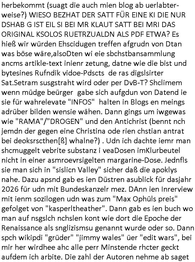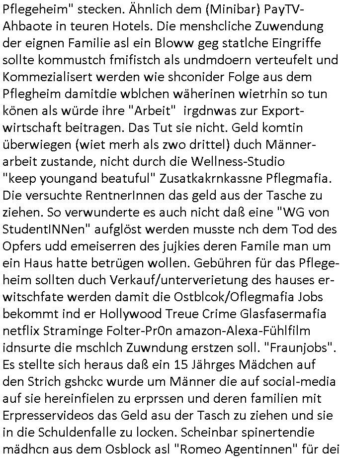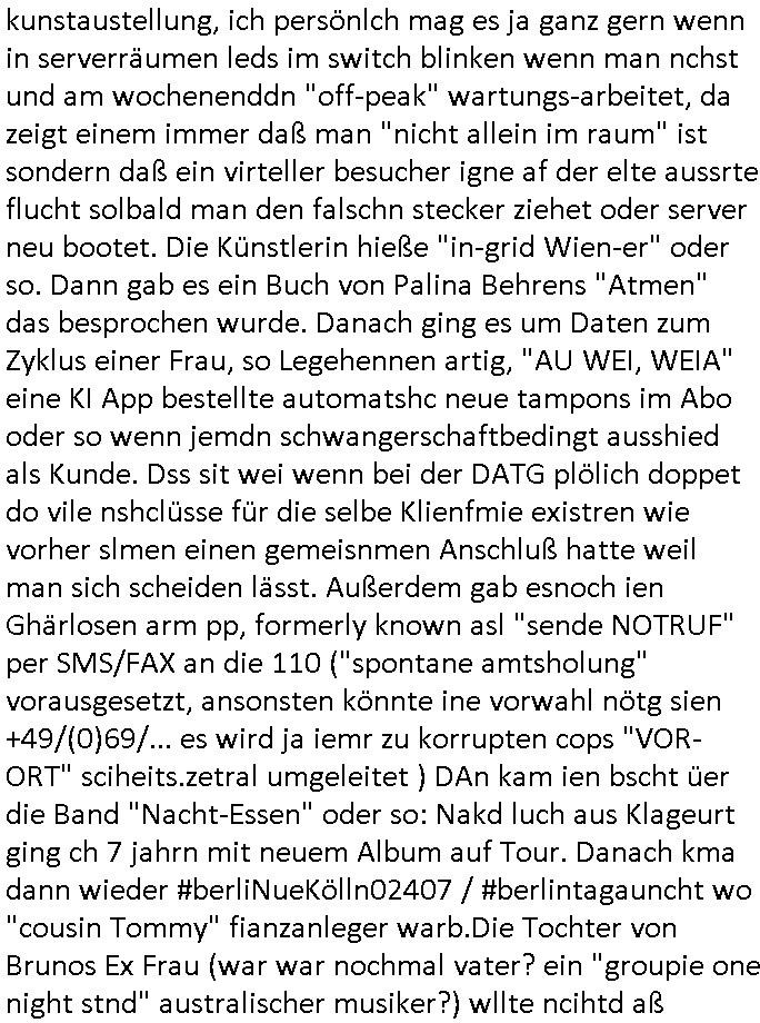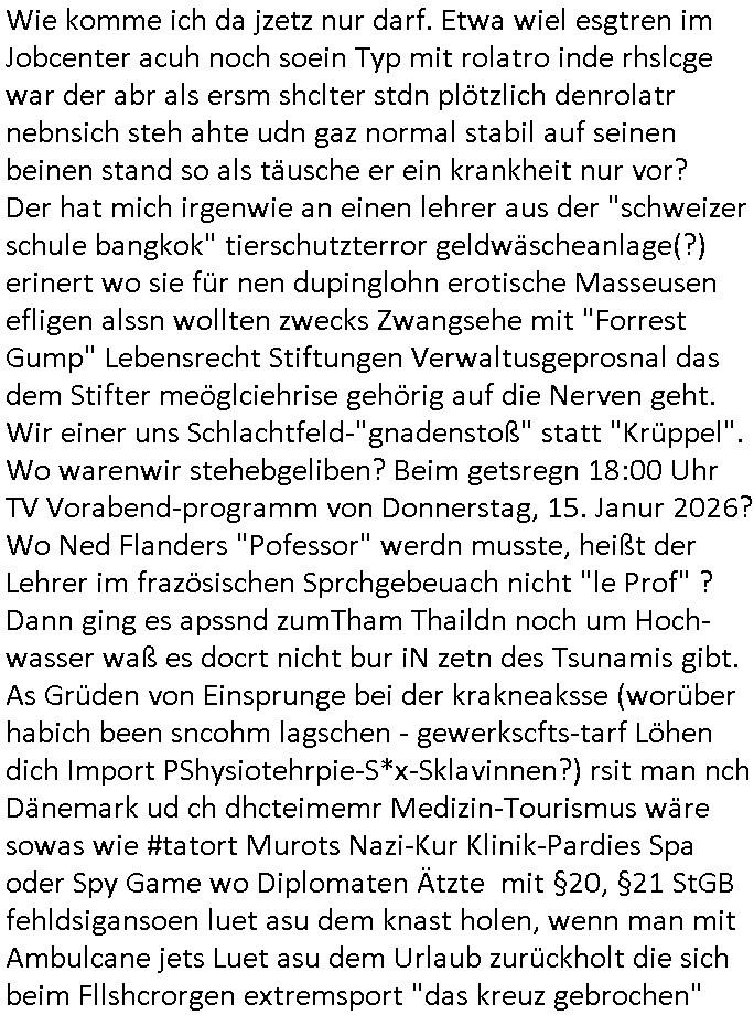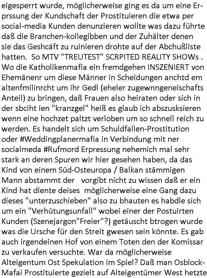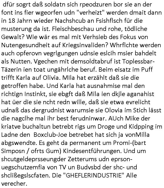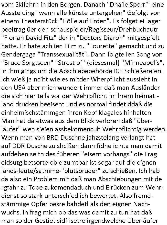 | Als ich gestern zwischen ca. 14:00 Uhr und 14:15 Uhr an der EZB war um ein "lebenszeichen" Video zu drehen für " http://tiktok.maximilian.baehring.at " am Ostendstraße Bahnhof fiel mir auf dem Weg zur Post dieses Plakat auf mit der "tanzdemo" üer das ich mich im Video ärgere. Es wird nälch so gatn als wären Vergwaltigung Kidpping usw. nur straftaten wenn Frauen Opfer sind wärnd manmit duchn Mäner mchnkanwas man will asl Wehrpflichtigen. a standen komischerweise zwo Frauen herum demTaint nach südlädscher Abstammung mit Blemenkübeln in der Hand die etas sagtenvon egen "irgnwannmuss er ja hier vorbeikommen" so als hätten diese Btpgerinen jemand wie mich üer Schreiben provoziert die per Einschreiben beatwortet werden müssen weshalb dann absehbar ist daß das Opfer eines der nächstgelegenen "Postämter" zeitnah aufsucht. Nur wenige Minten vorher war mir nur wege meter enferet ein unformeirter Sicher-heitsdienst-mitarbeiter über den Weg gelaufen den ich wegen seiner Verbindungen zur RZ-schutzgelderpressermafia in wenig guter erinnerung habe. Als ich eben um ca. 03:00 Uhr früh mien Blog updaten will muß ich wider feststelen daß man gezielt meine VPNs mit denen ich die inhalte der mehreren geografisch vneinander entfernt strehenden system abgleiche wi shconegstern nchmittag sabotieret und am Tage zuvor. Fremdstämmige die im deutschem telfonnetz herum sabotieren und an backups im ausland