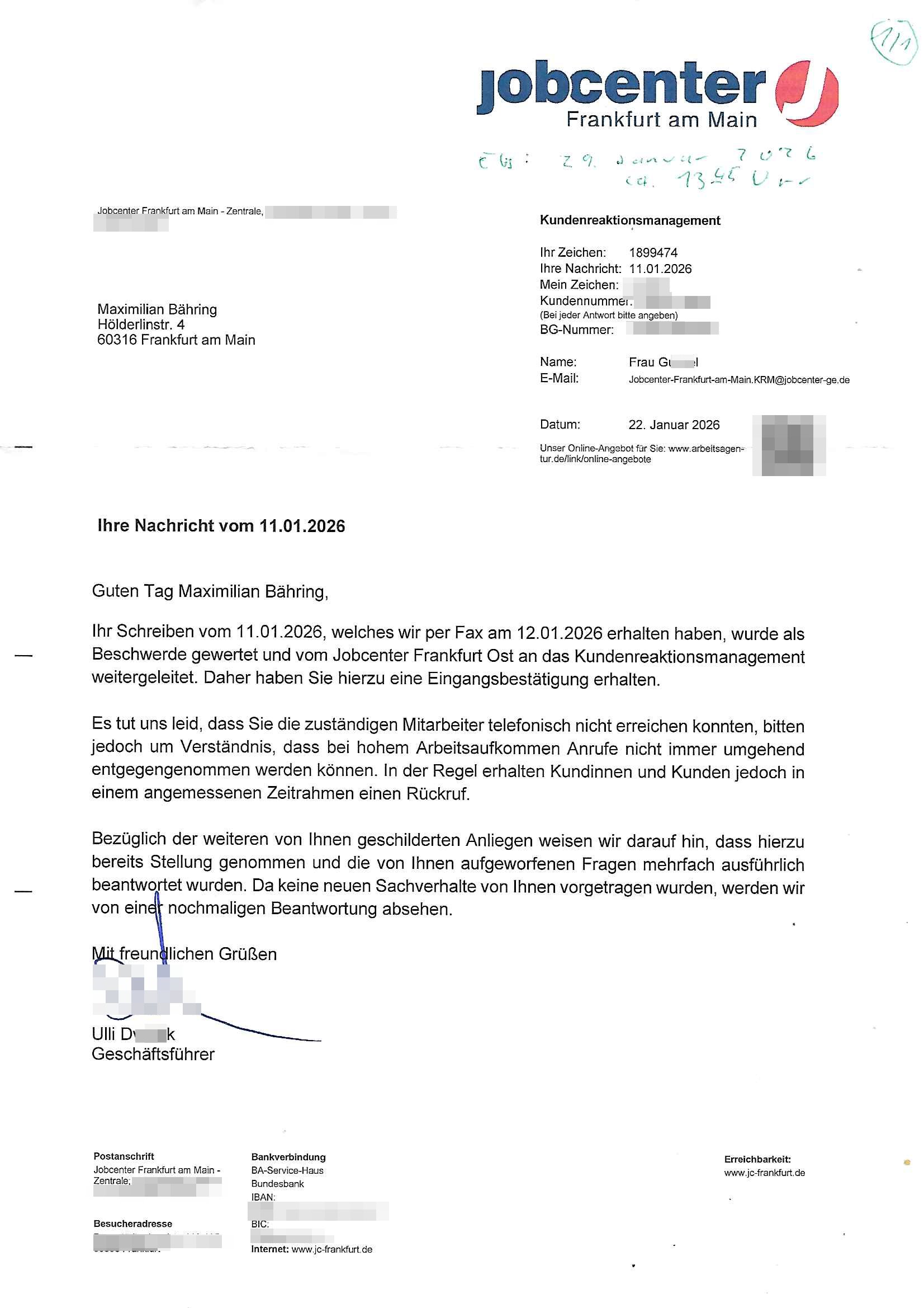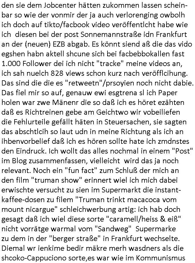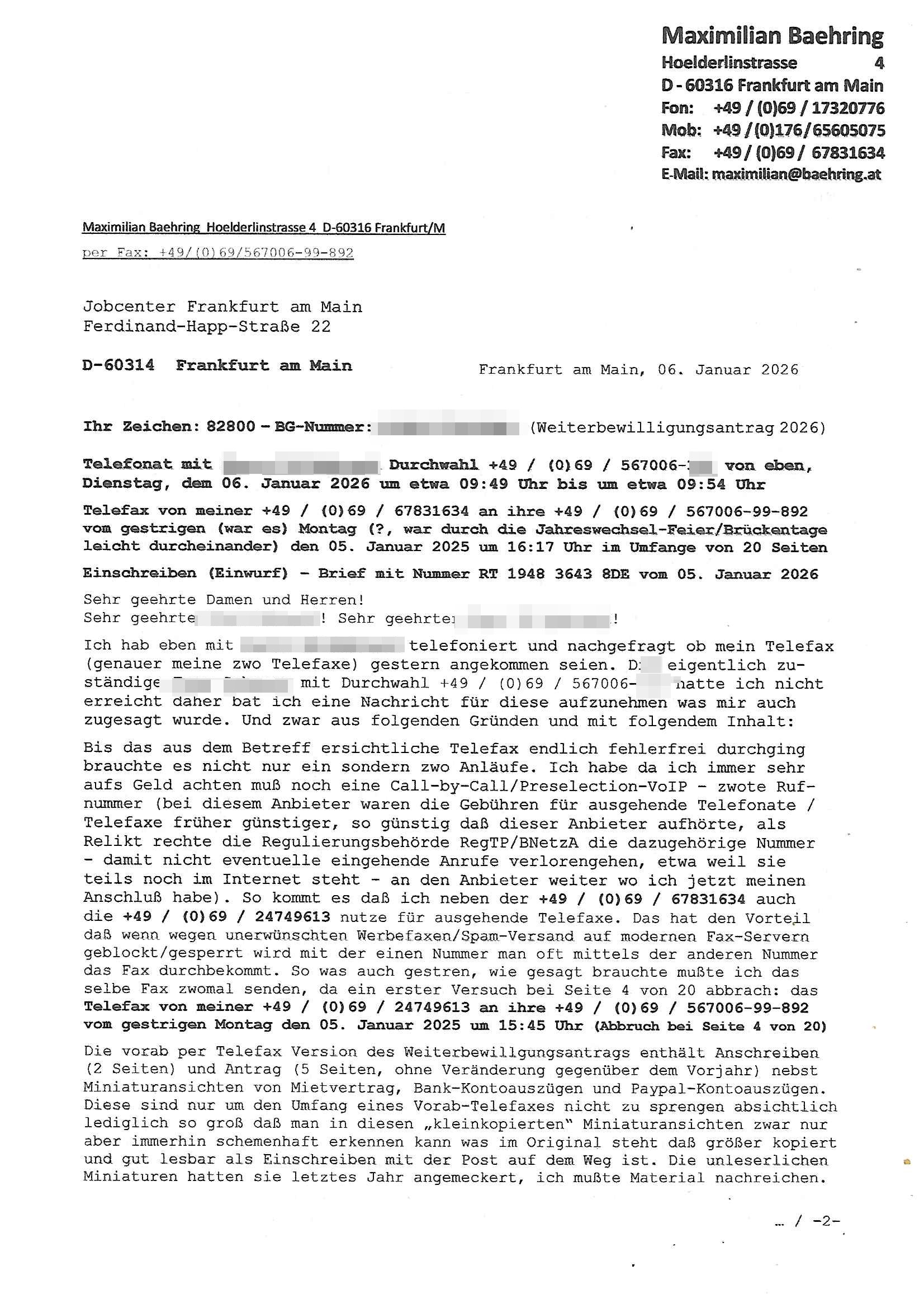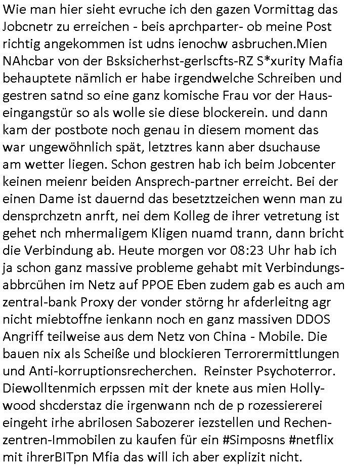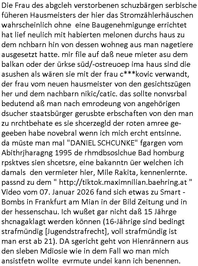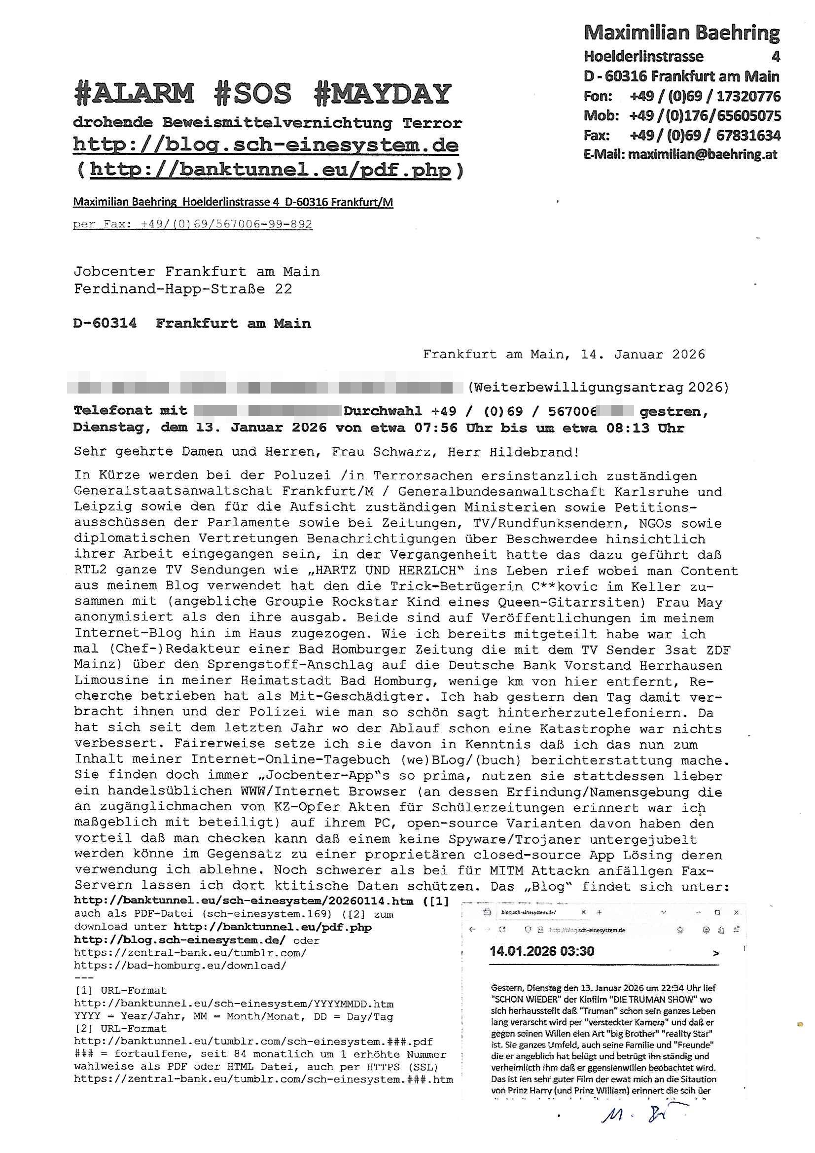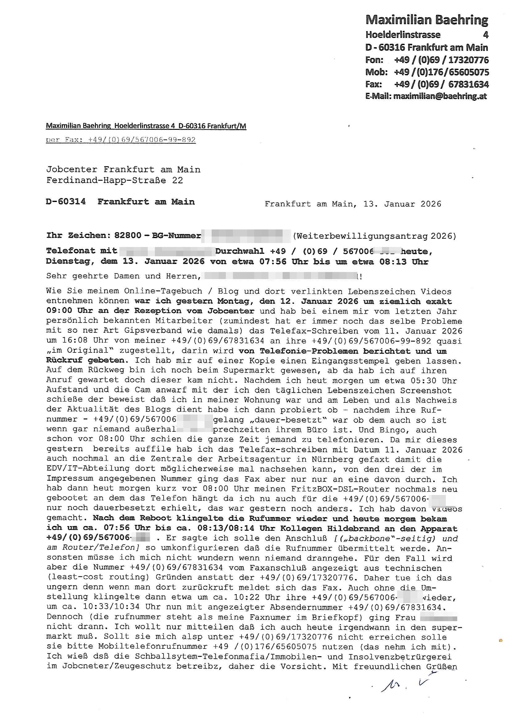 ( http://banktunnel.eu/pdf.php ) Maximilian Baehring Hoelderlinstrasse 4 D-60316 Frankfurt/M vorab per Fax: +49/(0)69/567006-99-892 Jobcenter Frankfurt am Main Zentrale z.Hd. Herrn/Frau D***k/Frau G***l Darmstädter-Landstraße 119-125 D - 60598 Frankfurt am Main Frankfurt am Main, 29. Januar 2026 Ihr Zeichen: 8KRM - BG - Nummer: ****( Kundenummer: *** ) antwortend auf Schreiben vom 11. Januar 2026 mit „mein Zeichen RN1899474“ Ihr Schreiben „Ihre Nachricht vom 11.01.2026“ datiert auf „22. Januar 2026“ frankiert am 27. und hier eingegangen heute, 29. Januar 2026 ca. 13:45 Uhr u.a. „Telefonproblem“, 1 Blatt (nur vorderseitig, farbig, bedruckt), 1 Seite Sehr geehrte/r Herr/Frau D***! Letztmalig am 18. Januar 2026 hatte ich mit ihrem Hause Kontakt, von 08:54 Uhr an diesem tage daiert mein Telefax an ihre Frau Behrami +49/(0)69/567006-99-892 der 18. Janaur 2026 war ein Sonntag an dem die Postfilialen geschlossen waren. Als Einschreiben (Einwurf) ging der vorab per faxe gesendete Brief somit erst am 19. Januar 2026 an sie herus die Nummer der Sendung ist RT 2557 6110 9DE. In ihrem Schreiben datiert 22. Januar 2026 von einer „Frau Gunkel“, unter-schrieben von Herren/Frau? „Uli Dvorak“ beziehen sie sich im ersten Absatz auf ein Sciben das sie von mir am 12. Januar 2026 per Telefax erhalte hätten aber ich muß dazu mittelöen daß es vom 12. Januar 2026 keinerlei Telefax an Sie gegeben hat. Am 12. Januar 2026 geing lediglich um 18:41 Uhr eines an die Bundesagentur EDV/IT in Nürnberg heraus Gegenstelle: +49/(0)911/1794405. Ansonsten habe ich am 12. Januar 2026 um ziemlich exakt 09:00 Uhr in der Ferdinand-Happ-Straße 22, 60314 Frankfurt am Main am Empfang das Schieben nochmal abgegeben was ich am Vortag, den 11. Januar 2026 um 16:08 Uhr schon per Fax an die +49/(0)69/567006-99-892 versendet hatte. Ich hatte eine Kopie de Schreibens direkt nach Nürnberg gesendet in der Hoffnung jemanden zu erreichen der für die EDV/IT zuständig ist. Schon am 18. Januar 2026 hatte ich bemängelt daß es ein DIN5008 Diktatazeichen (damals noch „RN1899474“) mit Nummer „1899474“ in meiner Korrespondenz mut Ihnen nicht gibt. Allerdings hatte mich Ende 1998 mal ein Gewerkschaftsmafia Truppe zu erpressen versucht Sekretärinnen einzustellen als man mir aufzwinge wollte mit meiner EDV Firma für die EZB an getürkten Ausschreibungsverfahren teilzunehmen. Man hat mich mit einer bedrohten schwangeren Freundin und später dann per Kidnapping zu erpressen versucht. Meine Mutter arbeitete früher im Bundesverband der Wach- und Schließgesellschaften (Arbeitgeberverband Bankensicherheit) als Chefsekretärin, ich war Abgeordneter/Politiker, Redakteur einer Zeitung in Bad Homburg wo die RAF die gepanzerte Limousine des Vorstand der deutschen Bank Herrhausen in die Luft jage die baugleich auch ich benutzt habe und EDV Unternehmer, hatte mit Baken EDV Recherchen bei der Terrorabwehr tun. Amerikanische Nachrichtendienste haben bei mir ne Hausdurchsuchung gemacht um an Ergebnisse meiner Recherchen zu kommen zusammen mit dem 3sat/ZDF Fernsehen Mainz (Redaktion Kulturzeit Christian Metz), man hört per Gerichtsbechluß mein Telefon ab. Daher bin ich vorsichtig. | |