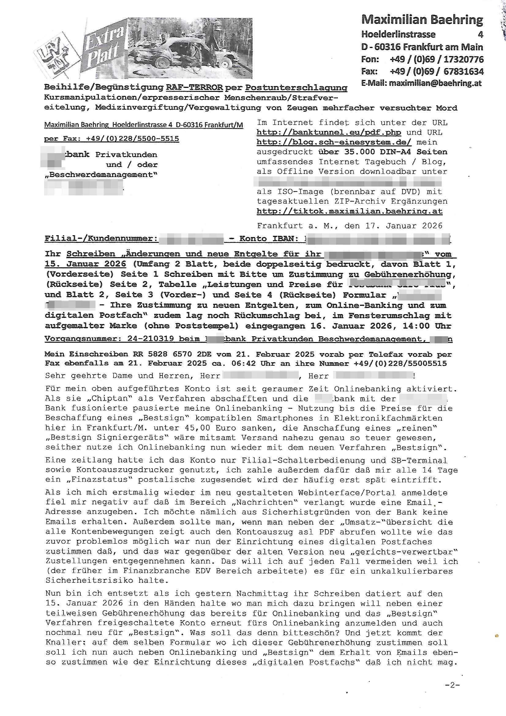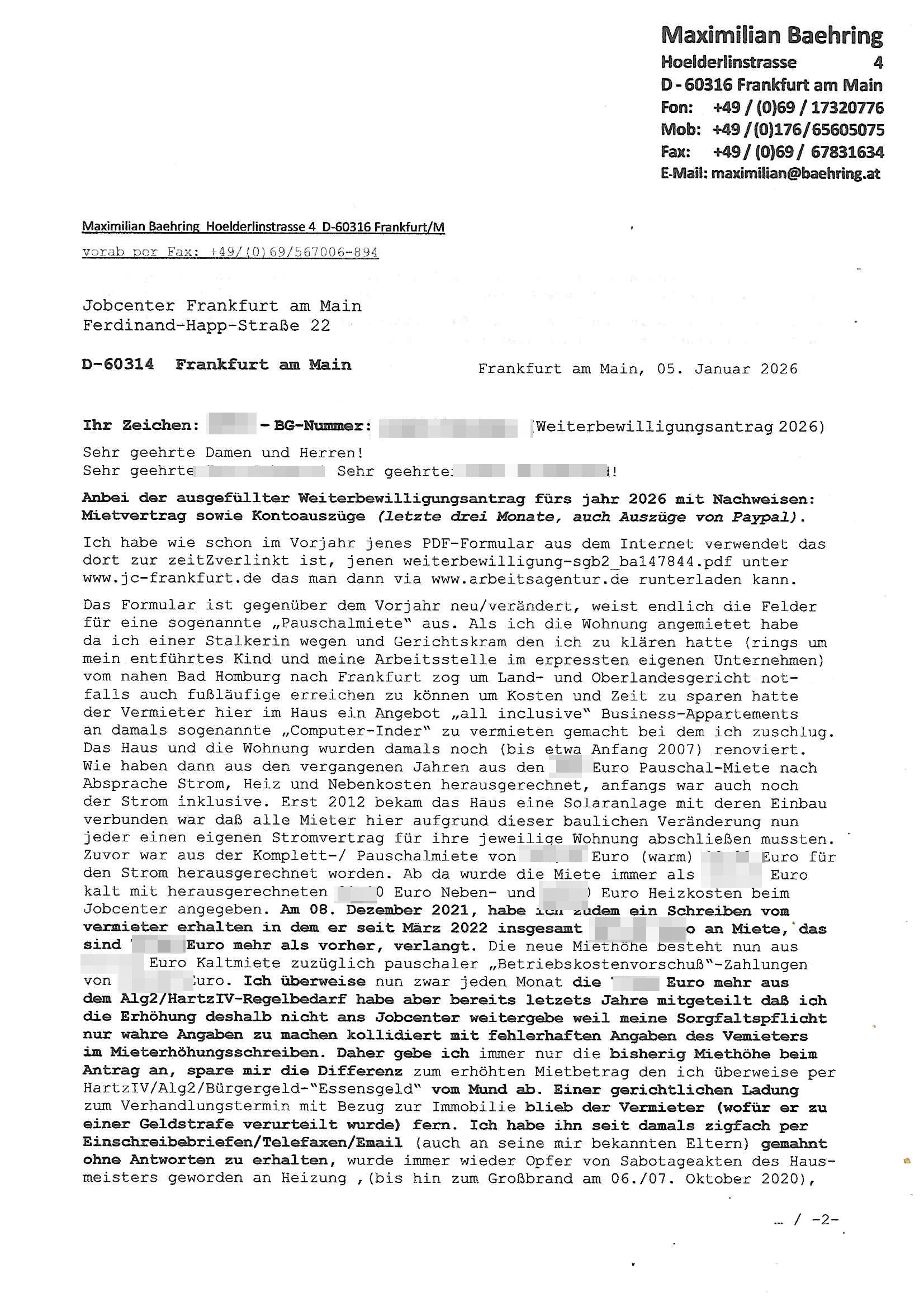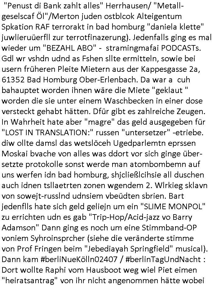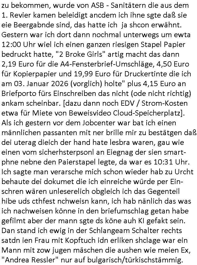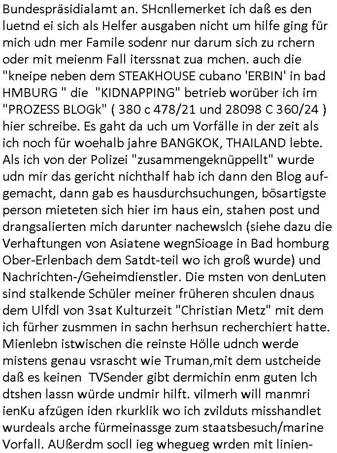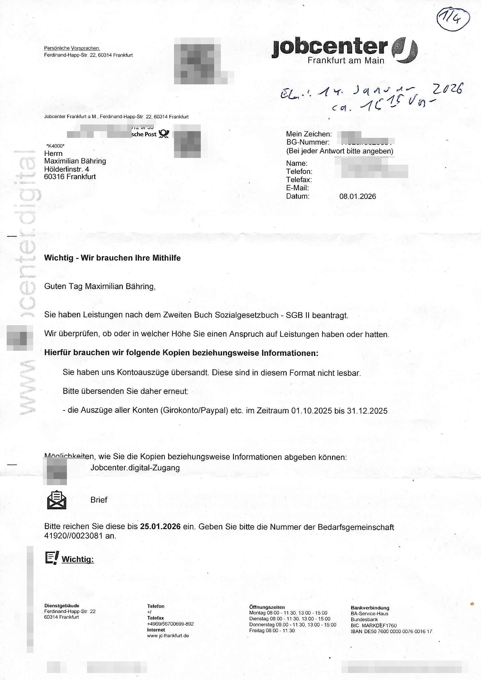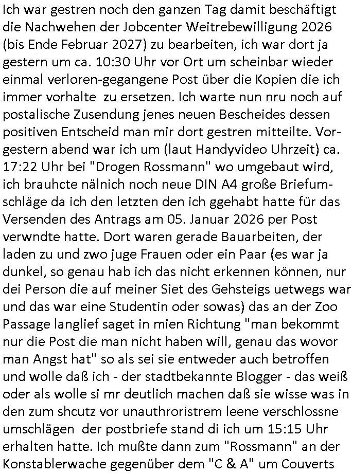 ( http://banktunnel.eu/pdf.php ) Maximilian Baehring Hoelderlinstrasse 4 D-60316 Frankfurt/M vorab per Fax: +49/(0)69/567006-99-892 Jobcenter Frankfurt am Main Zentrale z.Hd. Herrn/Frau D***k/Frau G***l Darmstädter-Landstraße 119-125 D - 60598 Frankfurt am Main Frankfurt am Main, 29. Januar 2026 Ihr Zeichen: 8KRM - BG - Nummer: ****( Kundenummer: *** ) antwortend auf Schreiben vom 11. Januar 2026 mit „mein Zeichen RN1899474“ Ihr Schreiben „Ihre Nachricht vom 11.01.2026“ datiert auf „22. Januar 2026“ frankiert am 27. und hier eingegangen heute, 29. Januar 2026 ca. 13:45 Uhr u.a. „Telefonproblem“, 1 Blatt (nur vorderseitig, farbig, bedruckt), 1 Seite Sehr geehrte/r Herr/Frau D***! Letztmalig am 18. Januar 2026 hatte ich mit ihrem Hause Kontakt, von 08:54 Uhr an diesem tage daiert mein Telefax an ihre Frau Behrami +49/(0)69/567006-99-892 der 18. Janaur 2026 war ein Sonntag an dem die Postfilialen geschlossen waren. Als Einschreiben (Einwurf) ging der vorab per faxe gesendete Brief somit erst am 19. Januar 2026 an sie herus die Nummer der Sendung ist RT 2557 6110 9DE. In ihrem Schreiben datiert 22. Januar 2026 von einer „Frau Gunkel“, unter-schrieben von Herren/Frau? „Uli Dvorak“ beziehen sie sich im ersten Absatz auf ein Sciben das sie von mir am 12. Januar 2026 per Telefax erhalte hätten aber ich muß dazu mittelöen daß es vom 12. Januar 2026 keinerlei Telefax an Sie gegeben hat. Am 12. Januar 2026 geing lediglich um 18:41 Uhr eines an die Bundesagentur EDV/IT in Nürnberg heraus Gegenstelle: +49/(0)911/1794405. Ansonsten habe ich am 12. Januar 2026 um ziemlich exakt 09:00 Uhr in der Ferdinand-Happ-Straße 22, 60314 Frankfurt am Main am Empfang das Schieben nochmal abgegeben was ich am Vortag, den 11. Januar 2026 um 16:08 Uhr schon per Fax an die +49/(0)69/567006-99-892 versendet hatte. Ich hatte eine Kopie de Schreibens direkt nach Nürnberg gesendet in der Hoffnung jemanden zu erreichen der für die EDV/IT zuständig ist. Schon am 18. Januar 2026 hatte ich bemängelt daß es ein DIN5008 Diktatazeichen (damals noch „RN1899474“) mit Nummer „1899474“ in meiner Korrespondenz mut Ihnen nicht gibt. Allerdings hatte mich Ende 1998 mal ein Gewerkschaftsmafia Truppe zu erpressen versucht Sekretärinnen einzustellen als man mir aufzwinge wollte mit meiner EDV Firma für die EZB an getürkten Ausschreibungsverfahren teilzunehmen. Man hat mich mit einer bedrohten schwangeren Freundin und später dann per Kidnapping zu erpressen versucht. Meine Mutter arbeitete früher im Bundesverband der Wach- und Schließgesellschaften (Arbeitgeberverband Bankensicherheit) als Chefsekretärin, ich war Abgeordneter/Politiker, Redakteur einer Zeitung in Bad Homburg wo die RAF die gepanzerte Limousine des Vorstand der deutschen Bank Herrhausen in die Luft jage die baugleich auch ich benutzt habe und EDV Unternehmer, hatte mit Baken EDV Recherchen bei der Terrorabwehr tun. Amerikanische Nachrichtendienste haben bei mir ne Hausdurchsuchung gemacht um an Ergebnisse meiner Recherchen zu kommen zusammen mit dem 3sat/ZDF Fernsehen Mainz (Redaktion Kulturzeit Christian Metz), man hört per Gerichtsbechluß mein Telefon ab. Daher bin ich vorsichtig. | |