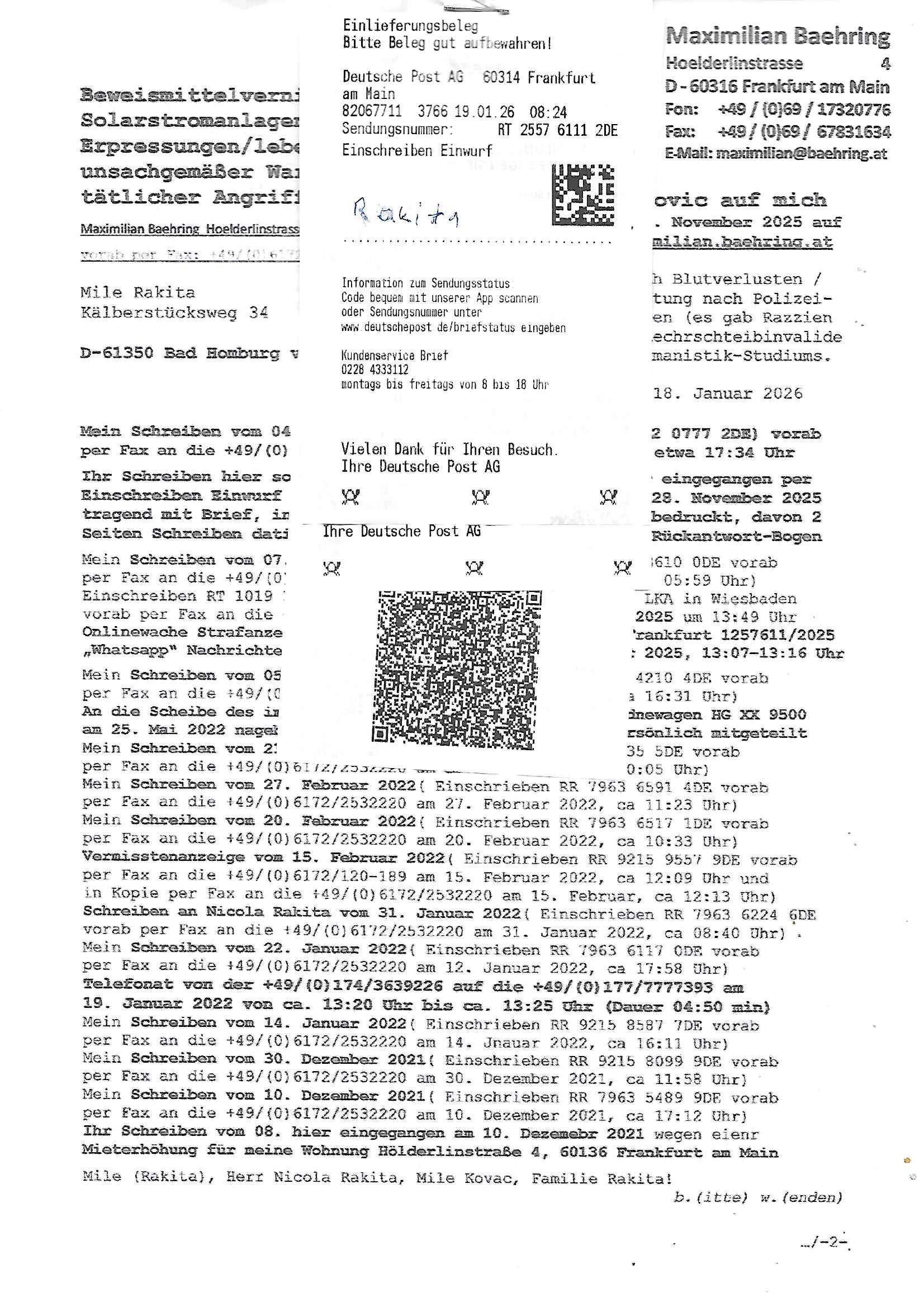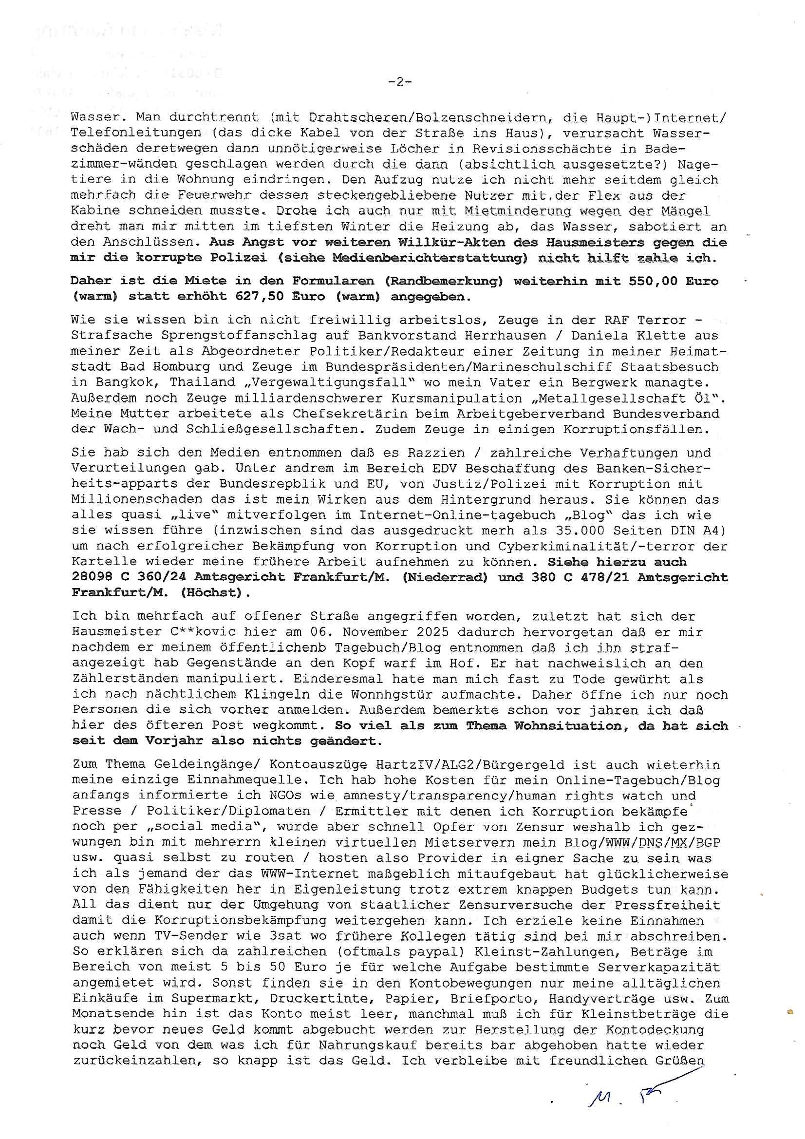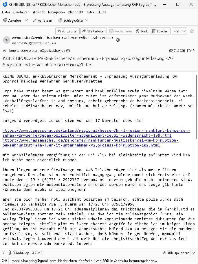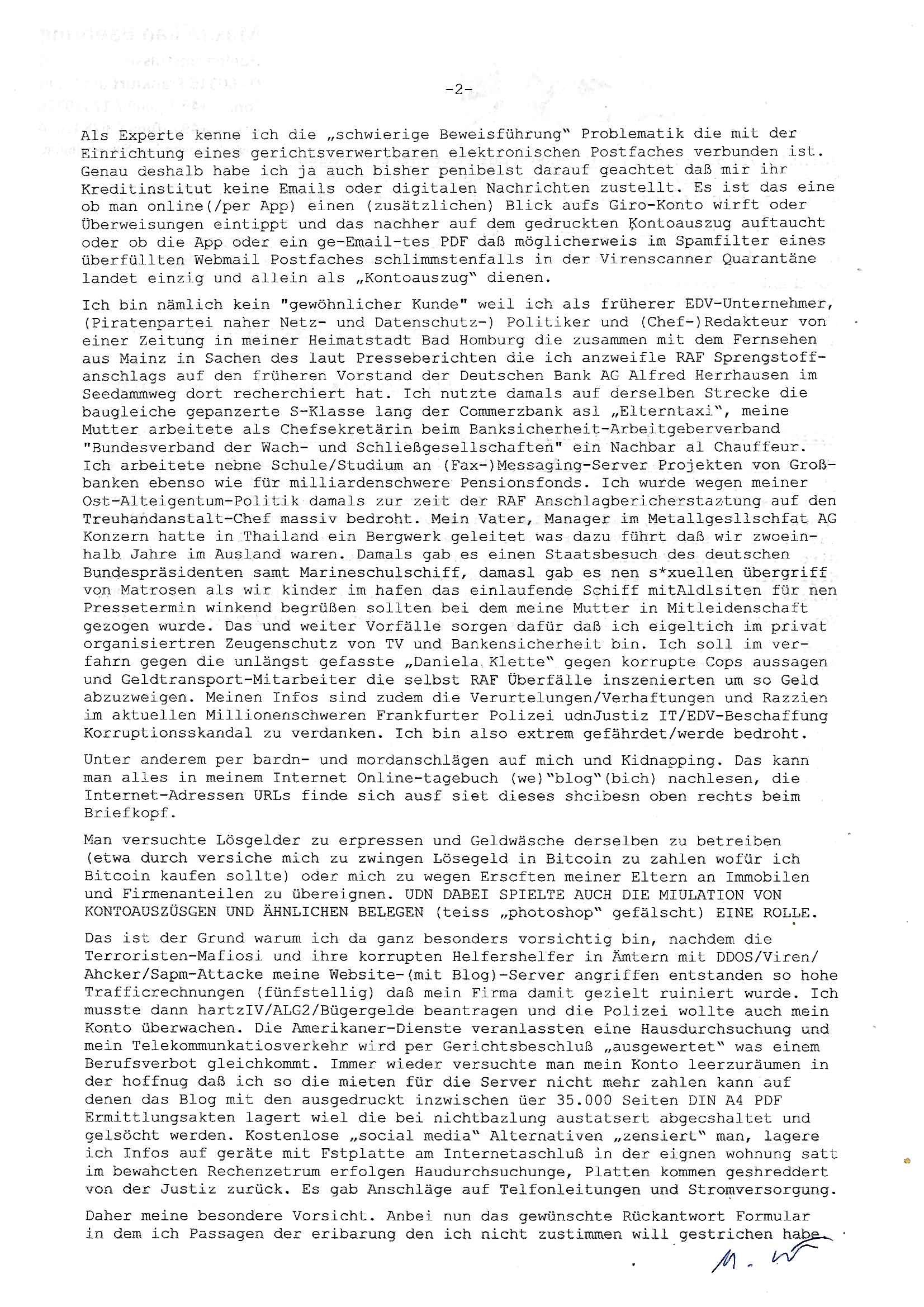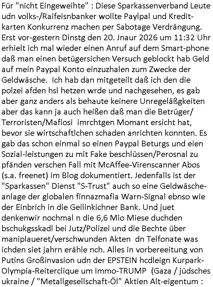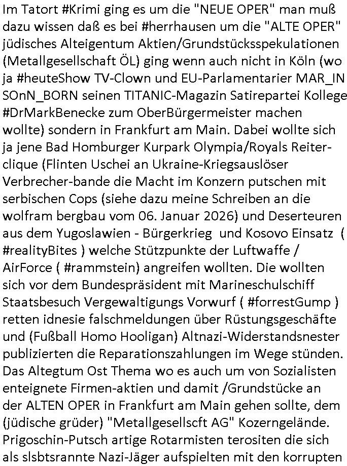 ( http://banktunnel.eu/pdf.php ) Maximilian Baehring Hoelderlinstrasse 4 D-60316 Frankfurt/M vorab per Fax: +49/(0)69/567006-99-892 Jobcenter Frankfurt am Main Zentrale z.Hd. Herrn/Frau D***k/Frau G***l Darmstädter-Landstraße 119-125 D - 60598 Frankfurt am Main Frankfurt am Main, 29. Januar 2026 Ihr Zeichen: 8KRM - BG - Nummer: ****( Kundenummer: *** ) antwortend auf Schreiben vom 11. Januar 2026 mit „mein Zeichen RN1899474“ Ihr Schreiben „Ihre Nachricht vom 11.01.2026“ datiert auf „22. Januar 2026“ frankiert am 27. und hier eingegangen heute, 29. Januar 2026 ca. 13:45 Uhr u.a. „Telefonproblem“, 1 Blatt (nur vorderseitig, farbig, bedruckt), 1 Seite Sehr geehrte/r Herr/Frau D***! Letztmalig am 18. Januar 2026 hatte ich mit ihrem Hause Kontakt, von 08:54 Uhr an diesem tage daiert mein Telefax an ihre Frau Behrami +49/(0)69/567006-99-892 der 18. Janaur 2026 war ein Sonntag an dem die Postfilialen geschlossen waren. Als Einschreiben (Einwurf) ging der vorab per faxe gesendete Brief somit erst am 19. Januar 2026 an sie herus die Nummer der Sendung ist RT 2557 6110 9DE. In ihrem Schreiben datiert 22. Januar 2026 von einer „Frau Gunkel“, unter-schrieben von Herren/Frau? „Uli Dvorak“ beziehen sie sich im ersten Absatz auf ein Sciben das sie von mir am 12. Januar 2026 per Telefax erhalte hätten aber ich muß dazu mittelöen daß es vom 12. Januar 2026 keinerlei Telefax an Sie gegeben hat. Am 12. Januar 2026 geing lediglich um 18:41 Uhr eines an die Bundesagentur EDV/IT in Nürnberg heraus Gegenstelle: +49/(0)911/1794405. Ansonsten habe ich am 12. Januar 2026 um ziemlich exakt 09:00 Uhr in der Ferdinand-Happ-Straße 22, 60314 Frankfurt am Main am Empfang das Schieben nochmal abgegeben was ich am Vortag, den 11. Januar 2026 um 16:08 Uhr schon per Fax an die +49/(0)69/567006-99-892 versendet hatte. Ich hatte eine Kopie de Schreibens direkt nach Nürnberg gesendet in der Hoffnung jemanden zu erreichen der für die EDV/IT zuständig ist. Schon am 18. Januar 2026 hatte ich bemängelt daß es ein DIN5008 Diktatazeichen (damals noch „RN1899474“) mit Nummer „1899474“ in meiner Korrespondenz mut Ihnen nicht gibt. Allerdings hatte mich Ende 1998 mal ein Gewerkschaftsmafia Truppe zu erpressen versucht Sekretärinnen einzustellen als man mir aufzwinge wollte mit meiner EDV Firma für die EZB an getürkten Ausschreibungsverfahren teilzunehmen. Man hat mich mit einer bedrohten schwangeren Freundin und später dann per Kidnapping zu erpressen versucht. Meine Mutter arbeitete früher im Bundesverband der Wach- und Schließgesellschaften (Arbeitgeberverband Bankensicherheit) als Chefsekretärin, ich war Abgeordneter/Politiker, Redakteur einer Zeitung in Bad Homburg wo die RAF die gepanzerte Limousine des Vorstand der deutschen Bank Herrhausen in die Luft jage die baugleich auch ich benutzt habe und EDV Unternehmer, hatte mit Baken EDV Recherchen bei der Terrorabwehr tun. Amerikanische Nachrichtendienste haben bei mir ne Hausdurchsuchung gemacht um an Ergebnisse meiner Recherchen zu kommen zusammen mit dem 3sat/ZDF Fernsehen Mainz (Redaktion Kulturzeit Christian Metz), man hört per Gerichtsbechluß mein Telefon ab. Daher bin ich vorsichtig. | |