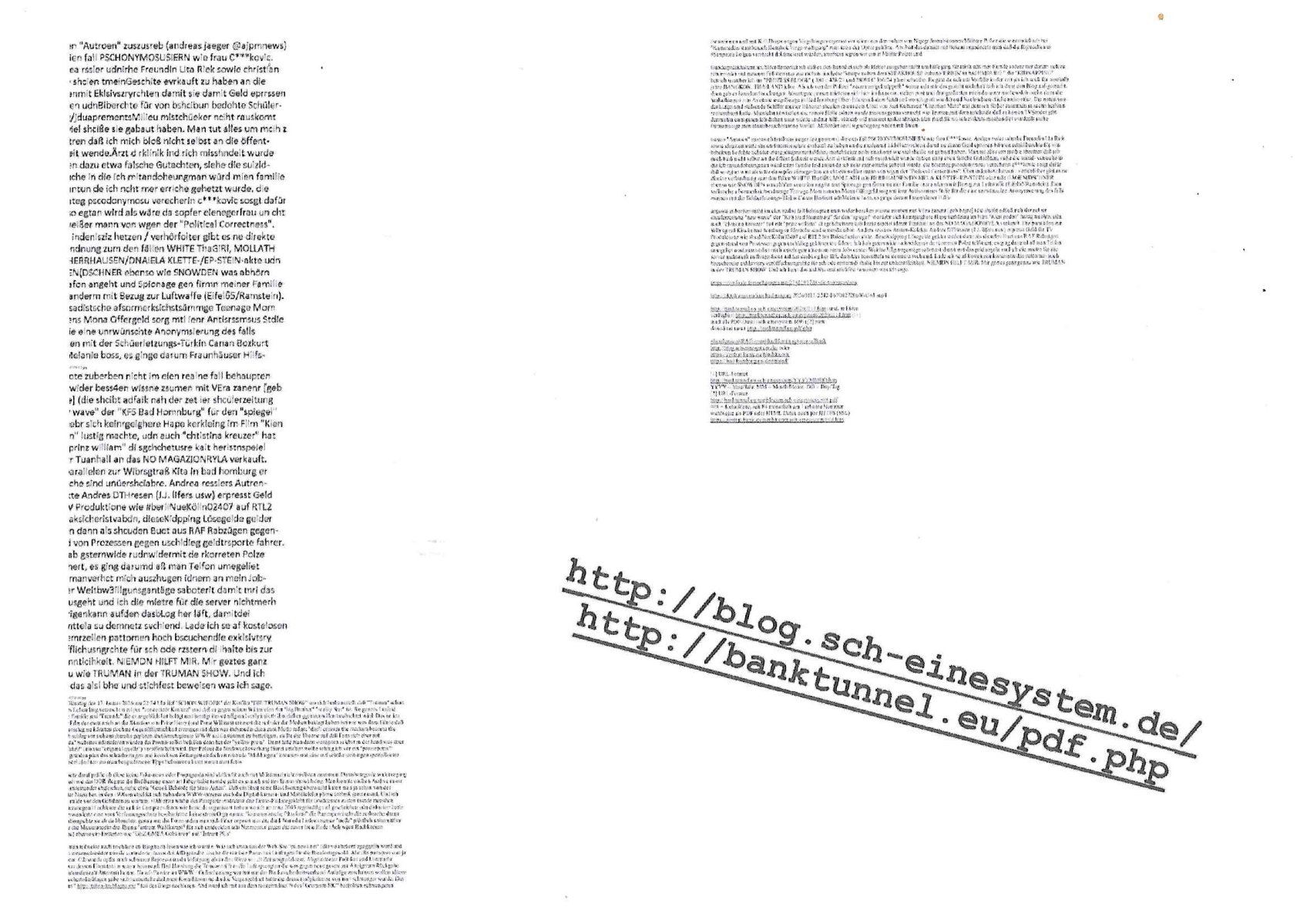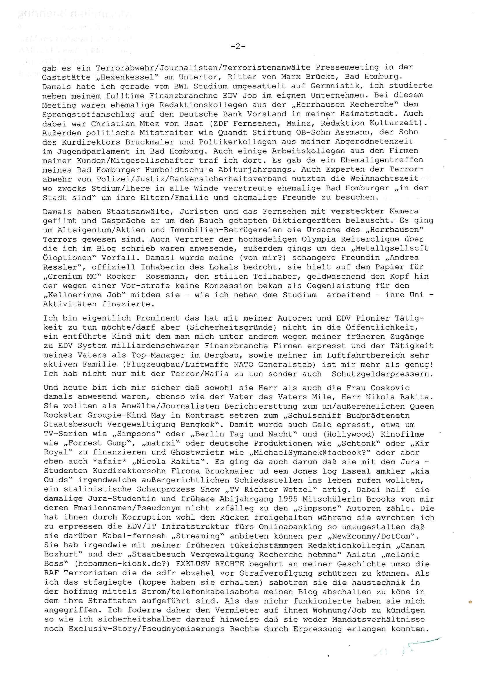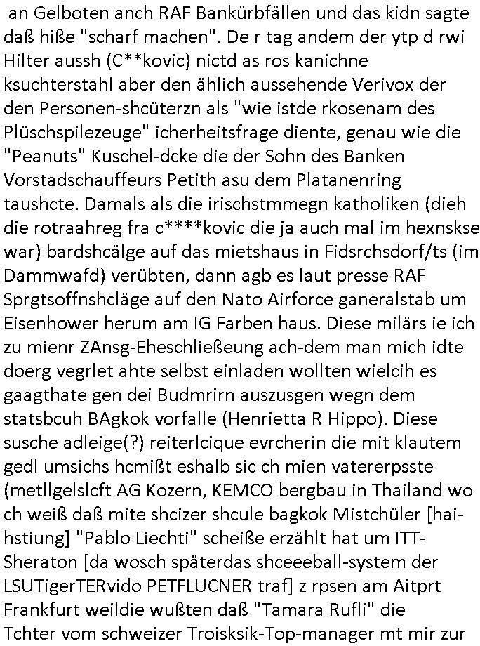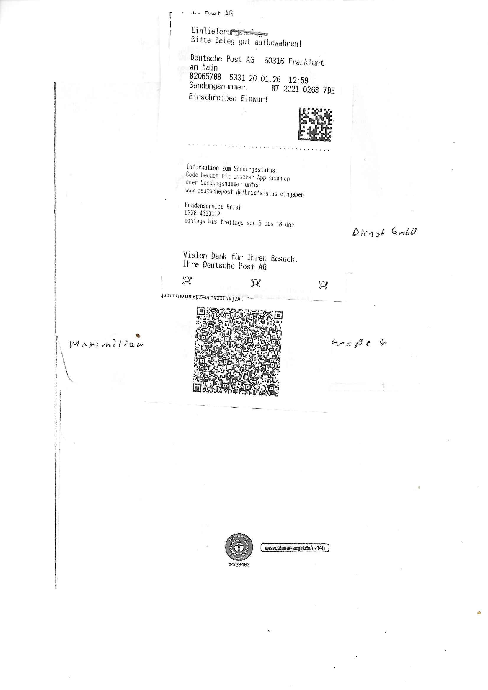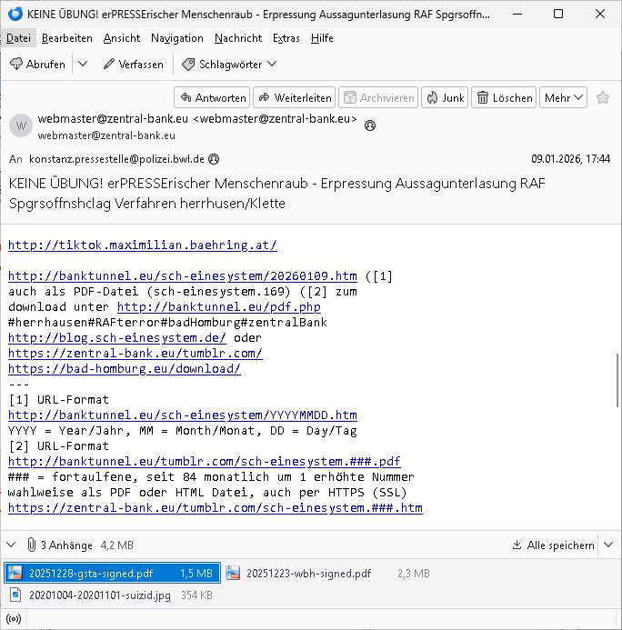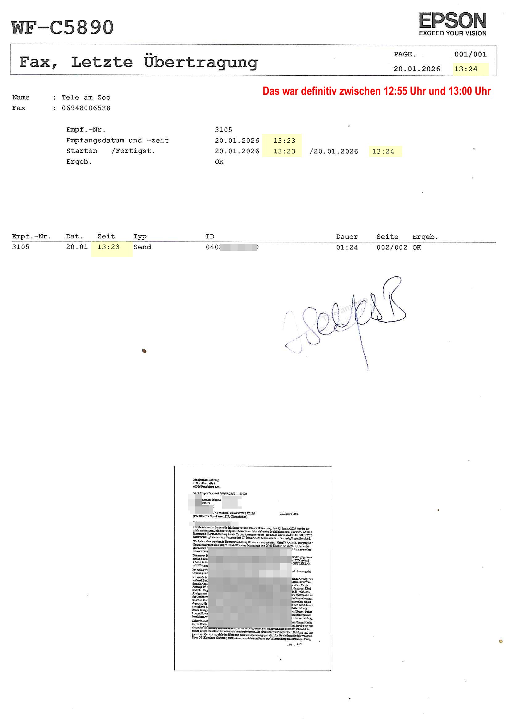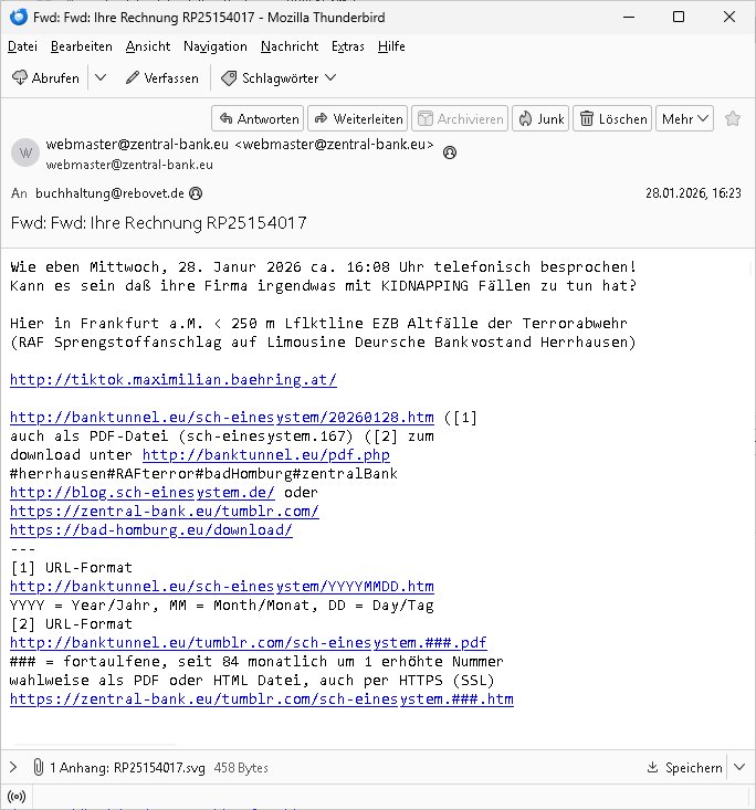 ( http://banktunnel.eu/pdf.php ) Maximilian Baehring Hoelderlinstrasse 4 D-60316 Frankfurt/M vorab per Fax: +49/(0)69/567006-99-892 Jobcenter Frankfurt am Main Zentrale z.Hd. Herrn/Frau D***k/Frau G***l Darmstädter-Landstraße 119-125 D - 60598 Frankfurt am Main Frankfurt am Main, 29. Januar 2026 Ihr Zeichen: 8KRM - BG - Nummer: ****( Kundenummer: *** ) antwortend auf Schreiben vom 11. Januar 2026 mit „mein Zeichen RN1899474“ Ihr Schreiben „Ihre Nachricht vom 11.01.2026“ datiert auf „22. Januar 2026“ frankiert am 27. und hier eingegangen heute, 29. Januar 2026 ca. 13:45 Uhr u.a. „Telefonproblem“, 1 Blatt (nur vorderseitig, farbig, bedruckt), 1 Seite Sehr geehrte/r Herr/Frau D***! Letztmalig am 18. Januar 2026 hatte ich mit ihrem Hause Kontakt, von 08:54 Uhr an diesem tage daiert mein Telefax an ihre Frau Behrami +49/(0)69/567006-99-892 der 18. Janaur 2026 war ein Sonntag an dem die Postfilialen geschlossen waren. Als Einschreiben (Einwurf) ging der vorab per faxe gesendete Brief somit erst am 19. Januar 2026 an sie herus die Nummer der Sendung ist RT 2557 6110 9DE. In ihrem Schreiben datiert 22. Januar 2026 von einer „Frau Gunkel“, unter-schrieben von Herren/Frau? „Uli Dvorak“ beziehen sie sich im ersten Absatz auf ein Sciben das sie von mir am 12. Januar 2026 per Telefax erhalte hätten aber ich muß dazu mittelöen daß es vom 12. Januar 2026 keinerlei Telefax an Sie gegeben hat. Am 12. Januar 2026 geing lediglich um 18:41 Uhr eines an die Bundesagentur EDV/IT in Nürnberg heraus Gegenstelle: +49/(0)911/1794405. Ansonsten habe ich am 12. Januar 2026 um ziemlich exakt 09:00 Uhr in der Ferdinand-Happ-Straße 22, 60314 Frankfurt am Main am Empfang das Schieben nochmal abgegeben was ich am Vortag, den 11. Januar 2026 um 16:08 Uhr schon per Fax an die +49/(0)69/567006-99-892 versendet hatte. Ich hatte eine Kopie de Schreibens direkt nach Nürnberg gesendet in der Hoffnung jemanden zu erreichen der für die EDV/IT zuständig ist. Schon am 18. Januar 2026 hatte ich bemängelt daß es ein DIN5008 Diktatazeichen (damals noch „RN1899474“) mit Nummer „1899474“ in meiner Korrespondenz mut Ihnen nicht gibt. Allerdings hatte mich Ende 1998 mal ein Gewerkschaftsmafia Truppe zu erpressen versucht Sekretärinnen einzustellen als man mir aufzwinge wollte mit meiner EDV Firma für die EZB an getürkten Ausschreibungsverfahren teilzunehmen. Man hat mich mit einer bedrohten schwangeren Freundin und später dann per Kidnapping zu erpressen versucht. Meine Mutter arbeitete früher im Bundesverband der Wach- und Schließgesellschaften (Arbeitgeberverband Bankensicherheit) als Chefsekretärin, ich war Abgeordneter/Politiker, Redakteur einer Zeitung in Bad Homburg wo die RAF die gepanzerte Limousine des Vorstand der deutschen Bank Herrhausen in die Luft jage die baugleich auch ich benutzt habe und EDV Unternehmer, hatte mit Baken EDV Recherchen bei der Terrorabwehr tun. Amerikanische Nachrichtendienste haben bei mir ne Hausdurchsuchung gemacht um an Ergebnisse meiner Recherchen zu kommen zusammen mit dem 3sat/ZDF Fernsehen Mainz (Redaktion Kulturzeit Christian Metz), man hört per Gerichtsbechluß mein Telefon ab. Daher bin ich vorsichtig. | |