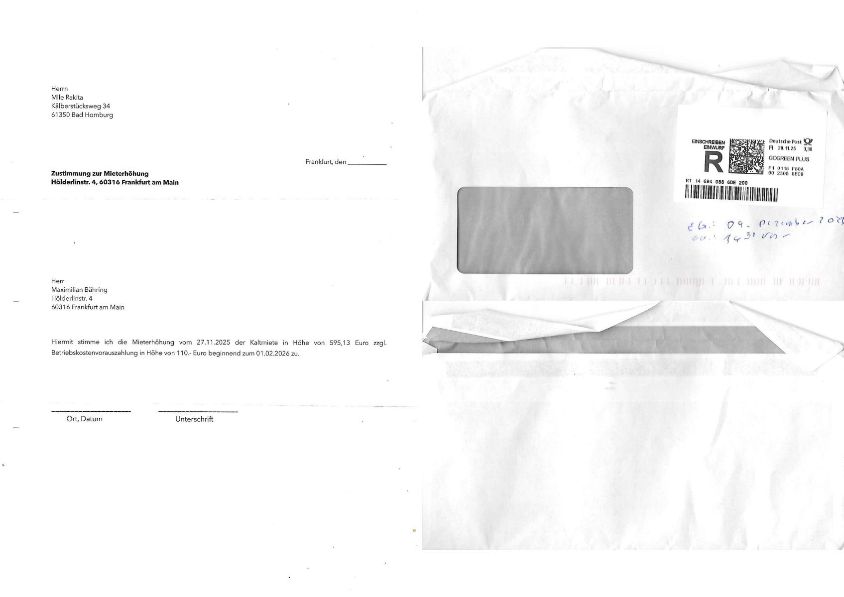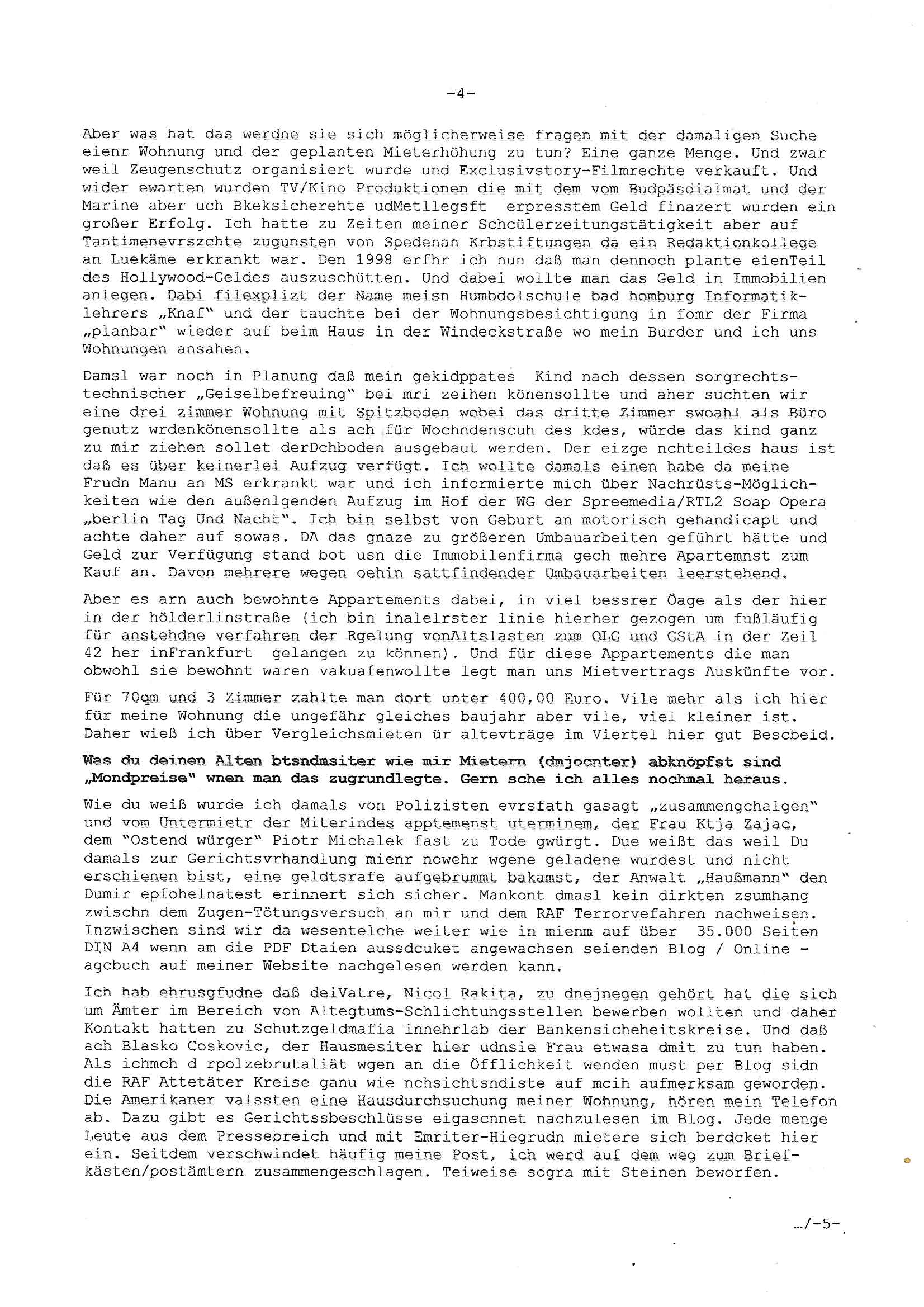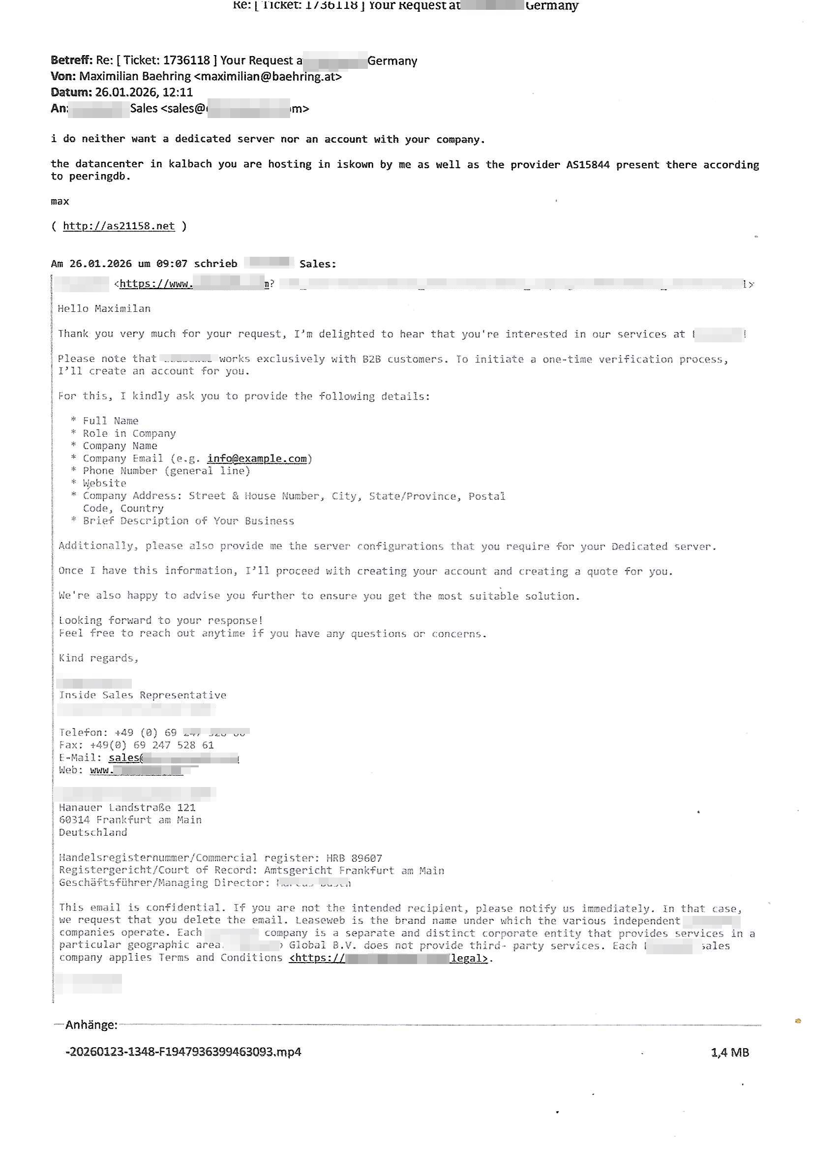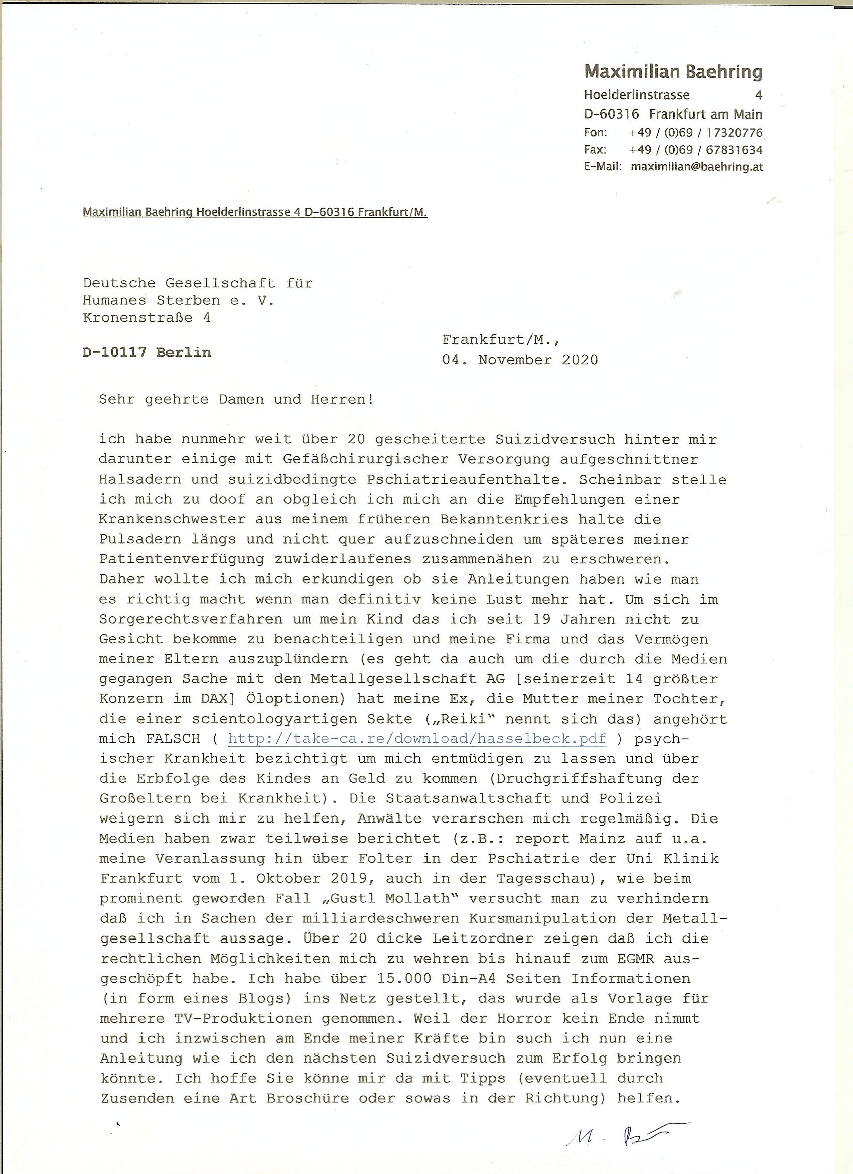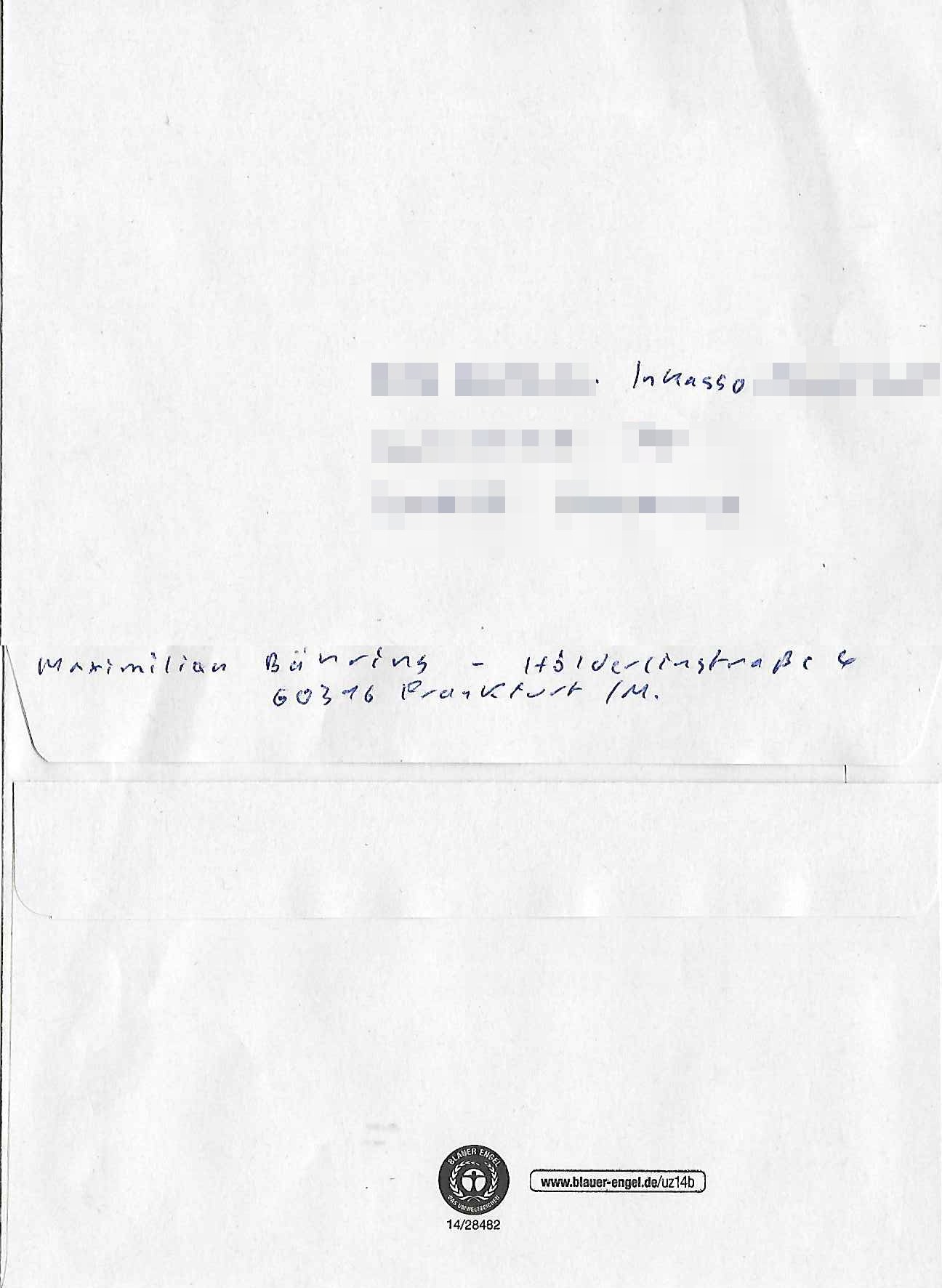 ( http://banktunnel.eu/pdf.php ) Maximilian Baehring Hoelderlinstrasse 4 D-60316 Frankfurt/M vorab per Fax: +49/(0)69/567006-99-892 Jobcenter Frankfurt am Main Zentrale z.Hd. Herrn/Frau D***k/Frau G***l Darmstädter-Landstraße 119-125 D - 60598 Frankfurt am Main Frankfurt am Main, 29. Januar 2026 Ihr Zeichen: 8KRM - BG - Nummer: ****( Kundenummer: *** ) antwortend auf Schreiben vom 11. Januar 2026 mit „mein Zeichen RN1899474“ Ihr Schreiben „Ihre Nachricht vom 11.01.2026“ datiert auf „22. Januar 2026“ frankiert am 27. und hier eingegangen heute, 29. Januar 2026 ca. 13:45 Uhr u.a. „Telefonproblem“, 1 Blatt (nur vorderseitig, farbig, bedruckt), 1 Seite Sehr geehrte/r Herr/Frau D***! Letztmalig am 18. Januar 2026 hatte ich mit ihrem Hause Kontakt, von 08:54 Uhr an diesem tage daiert mein Telefax an ihre Frau Behrami +49/(0)69/567006-99-892 der 18. Janaur 2026 war ein Sonntag an dem die Postfilialen geschlossen waren. Als Einschreiben (Einwurf) ging der vorab per faxe gesendete Brief somit erst am 19. Januar 2026 an sie herus die Nummer der Sendung ist RT 2557 6110 9DE. In ihrem Schreiben datiert 22. Januar 2026 von einer „Frau Gunkel“, unter-schrieben von Herren/Frau? „Uli Dvorak“ beziehen sie sich im ersten Absatz auf ein Sciben das sie von mir am 12. Januar 2026 per Telefax erhalte hätten aber ich muß dazu mittelöen daß es vom 12. Januar 2026 keinerlei Telefax an Sie gegeben hat. Am 12. Januar 2026 geing lediglich um 18:41 Uhr eines an die Bundesagentur EDV/IT in Nürnberg heraus Gegenstelle: +49/(0)911/1794405. Ansonsten habe ich am 12. Januar 2026 um ziemlich exakt 09:00 Uhr in der Ferdinand-Happ-Straße 22, 60314 Frankfurt am Main am Empfang das Schieben nochmal abgegeben was ich am Vortag, den 11. Januar 2026 um 16:08 Uhr schon per Fax an die +49/(0)69/567006-99-892 versendet hatte. Ich hatte eine Kopie de Schreibens direkt nach Nürnberg gesendet in der Hoffnung jemanden zu erreichen der für die EDV/IT zuständig ist. Schon am 18. Januar 2026 hatte ich bemängelt daß es ein DIN5008 Diktatazeichen (damals noch „RN1899474“) mit Nummer „1899474“ in meiner Korrespondenz mut Ihnen nicht gibt. Allerdings hatte mich Ende 1998 mal ein Gewerkschaftsmafia Truppe zu erpressen versucht Sekretärinnen einzustellen als man mir aufzwinge wollte mit meiner EDV Firma für die EZB an getürkten Ausschreibungsverfahren teilzunehmen. Man hat mich mit einer bedrohten schwangeren Freundin und später dann per Kidnapping zu erpressen versucht. Meine Mutter arbeitete früher im Bundesverband der Wach- und Schließgesellschaften (Arbeitgeberverband Bankensicherheit) als Chefsekretärin, ich war Abgeordneter/Politiker, Redakteur einer Zeitung in Bad Homburg wo die RAF die gepanzerte Limousine des Vorstand der deutschen Bank Herrhausen in die Luft jage die baugleich auch ich benutzt habe und EDV Unternehmer, hatte mit Baken EDV Recherchen bei der Terrorabwehr tun. Amerikanische Nachrichtendienste haben bei mir ne Hausdurchsuchung gemacht um an Ergebnisse meiner Recherchen zu kommen zusammen mit dem 3sat/ZDF Fernsehen Mainz (Redaktion Kulturzeit Christian Metz), man hört per Gerichtsbechluß mein Telefon ab. Daher bin ich vorsichtig. | |