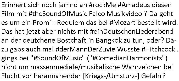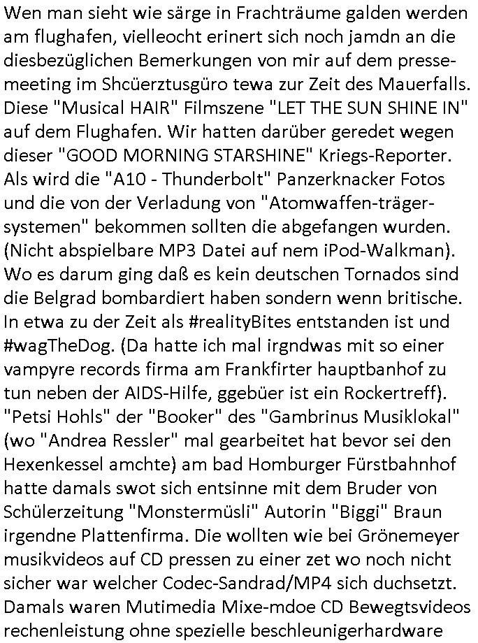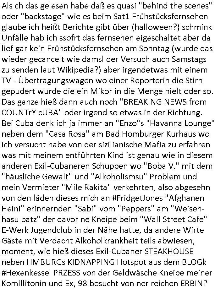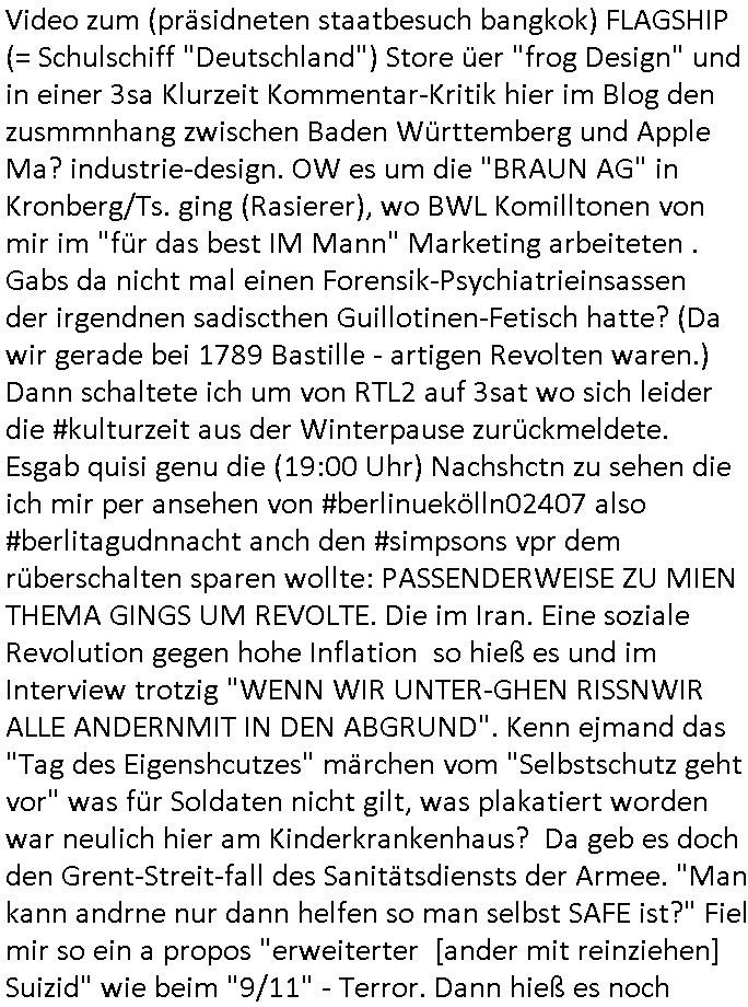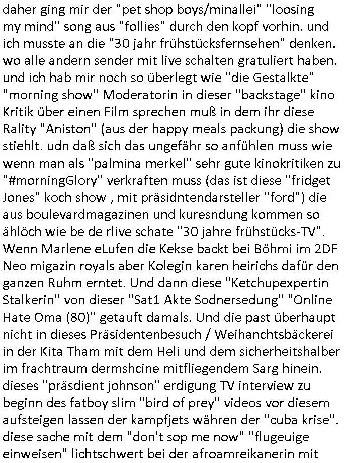 Herstellern WWW Flugunfalluntersuchungsdatenbanken. (Sitzen die noch an der Alten Oper Frankfurt am Main?) Daran daß mir "Mile" mal von kaputten Helis erzählt hat und dem Heliflugschien den "Felix" machte als wir uns über "Rotorways Exec" Bausätze unterhalten haben. Und das Thema mit der Umwandlung des Sportplatzes unter-halb der Erlöserkirche in Bad Homburg in ein Baugebiet. Wohin die U2 aus Gonzeheim verlängert werden sollte. Und dann wieder Botscaft Bangkok, Thailand. Deutscher Liederabend (siehe heinz rudolf kunze posting) oder so. Analog zu Alfrd Hitchcoks "der mann der zuviel wusste". Wo es um diesen "Amadeus" Kinofilm geht wo Mozart sein eigens Requiem schreibt und sein Kokurrent Salieri im Irrenhaus erzählt wie er dort gelandet ist. Und dann wieder die #Simpsons der Podcast vom Tode kennedys. Ich hatte ja angefragt warum der dsuche bundpräsident in Bangkok im Krankenhaus war beim marineschulschiff Besuch. Das hab ich jezt qausi als Plardois/post-It's an die Pinn-wand geklebt die dann mit rotem wollfaden mit-einander verwobe werden zu einem "bewegt Bild". So wie wnn man bei fukionaler magtresonaztomgrahie im CT menshcn "live" beim denken zusieht (ienguste bidl steht im Kopf zitierte die "kluager kopf" faz glaube ich mal kino-filmer "broccolli"?). die meisten dieser bilder udn tetxfragment hab ich im Kopf gehabt bei der Frage an die ZDF/3sat "Final Cut" Redaktion für Nachrufe wie sie in so kurzer Zeit nachdem jemand gestorben ist beim Spgrstffanschg inabd homburg einen Beitrag für dei TV Abendnachrichten produzieren können. "wenn man stirbt dann sieht man das gesamte leben nochmal als film an einem vorbei-ziehen" heißt es ja. un ich w llte wissen ob die da irgndwecleh "Bipic"/"dossier"s auf vorrat herum-ligen haben vorproduziert quasi, atrial das die schüler-zeitungen per geplantem WWW mitbenutzen könnten. Materialsammlungen zu eosn wie ein Wikipedia artikel. der Rgeriunsgchef/"hitler als mensch" (aus der Sicht seines Leibarztes) um es mit "hermann Ville (mit Accent auf dem E)" zu formuliern. wie komme ich jetzt darauf wegen diesem "20 tage" mit "Melania Trump" Film und diese "Cuba Krise" / "venezuela Öltanker Embargo". der "air foce one: hijacked" "friedrich merz - privatflugzeug" themathik ("george bush" als "stuhlkris kinderbuch vorleser" "mission accomplished") und "Bettina Wulff ud dIhr bodygard" Artikeln über die ich sprach? ich hab die security luete gefragt damals beim "sprengrsfftnschlag auf die bakvostand limousine in bad homburg" wie das denn aussieht, ob sie "jamand prominentes wird bald streben" mozart/salieri artig vorbereitungen treffen für den fall daß es "in the line of fire" artig mal schiefgeht mit dem personenschutz udnien Attentat nicht vereitelt werden kann. im blog irgendwo bei "they fade to grey" abagalget. cihw lt ja egslch heuet morgn mal in diesen "backstage" bereich beim sat1 fühstcülsfsrehn schauen ob es schon kritiken gibt zum "MELANIA (trump)" film. daher ging mir der "pet shop boys/minallei" "loosing my mind" song aus "follies" durch den kopf vorhin. und ich musste an die "30 jahr frühstücksfernsehen" denken. wo alle andern sender mit live schalten gratuliert haben. und ich hab mir noch so überlegt wie "die Gestalkte" "morning show" Moderatorin in dieser "backstage" kino Kritik über einen Film sprechen muß in dem ihr diese Rality "Aniston" (aus der happy meals packung) die show stiehlt. udn daß sich das ungefähr so anfühlen muss wie wenn man als "palmina merkel" sehr gute kinokritiken zu "#morningGlory" verkraften muss (das ist diese "fridget Jones" koch show , mit präsidntendarsteller "ford") die aus boulevardmagazinen und kuresndung kommen so ählöch wie be de rlive schate "30 jahre frühstücks-TV". Wenn Marlene eLufen die Kekse backt bei Böhmi im 2DF Neo migazin royals aber Kolegin karen heirichs dafür den ganzen Ruhm erntet. Und dann diese "Ketchupexpertin Stalkerin" von dieser "Sat1 Akte Sodnersedung" "Online Hate Oma (80)" getauft damals. Und die past überhaupt nicht in dieses Präsidentenbesuch / Weihanchtsbäckerei in der Kita Tham mit dem Heli und dem sicherheitshalber im frachtraum dermshcine mitfliegendem Sarg hinein. dieses "präsdient johnson" erdigung TV interview zu beginn des fatboy slim "bird of prey" videos vor diesem aufsteigen lassen der kampfjets währen der "cuba krise". diese sache mit dem "don't sop me now" "flugeuige einweisen" lichtschwert bei der afroamreikanerin mit #Simpsons Fatsby "diss rap" "rammstein" ritterrüstung. ich mienwiepackt mansowas um ien webrpause für den "mc donalds" chili-fastfoode das so scharf ist daß die (medizinisch begleiteten) testesser davon diese "es ist wirk-lich war" tränen in den augen haben? und jetzt ZDF TV Autorinnen bleistifte angespitzt: wie macht der Hund? https://www.mcdonalds.com/de/de-de/GermanyNewsroom/article/mcspicy.html https://decl-war.tumblr.com/post/143224309678/german-electronic-resist-ances-nuclear-football | |