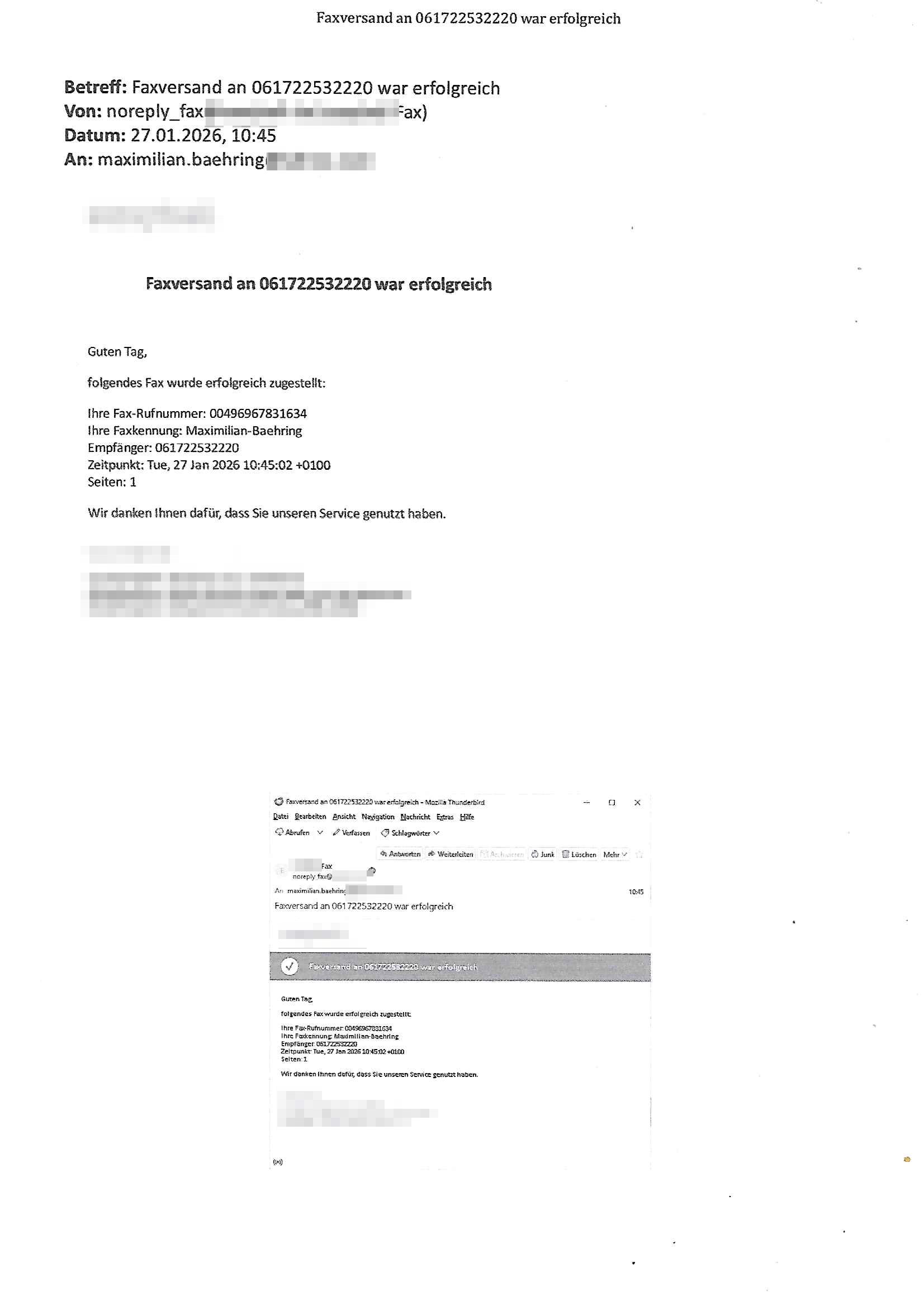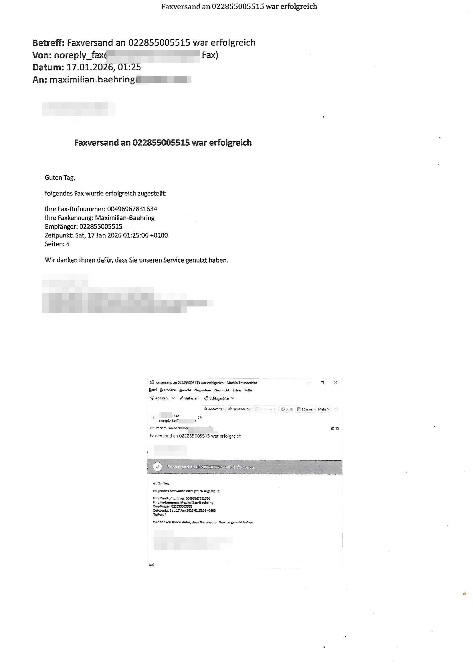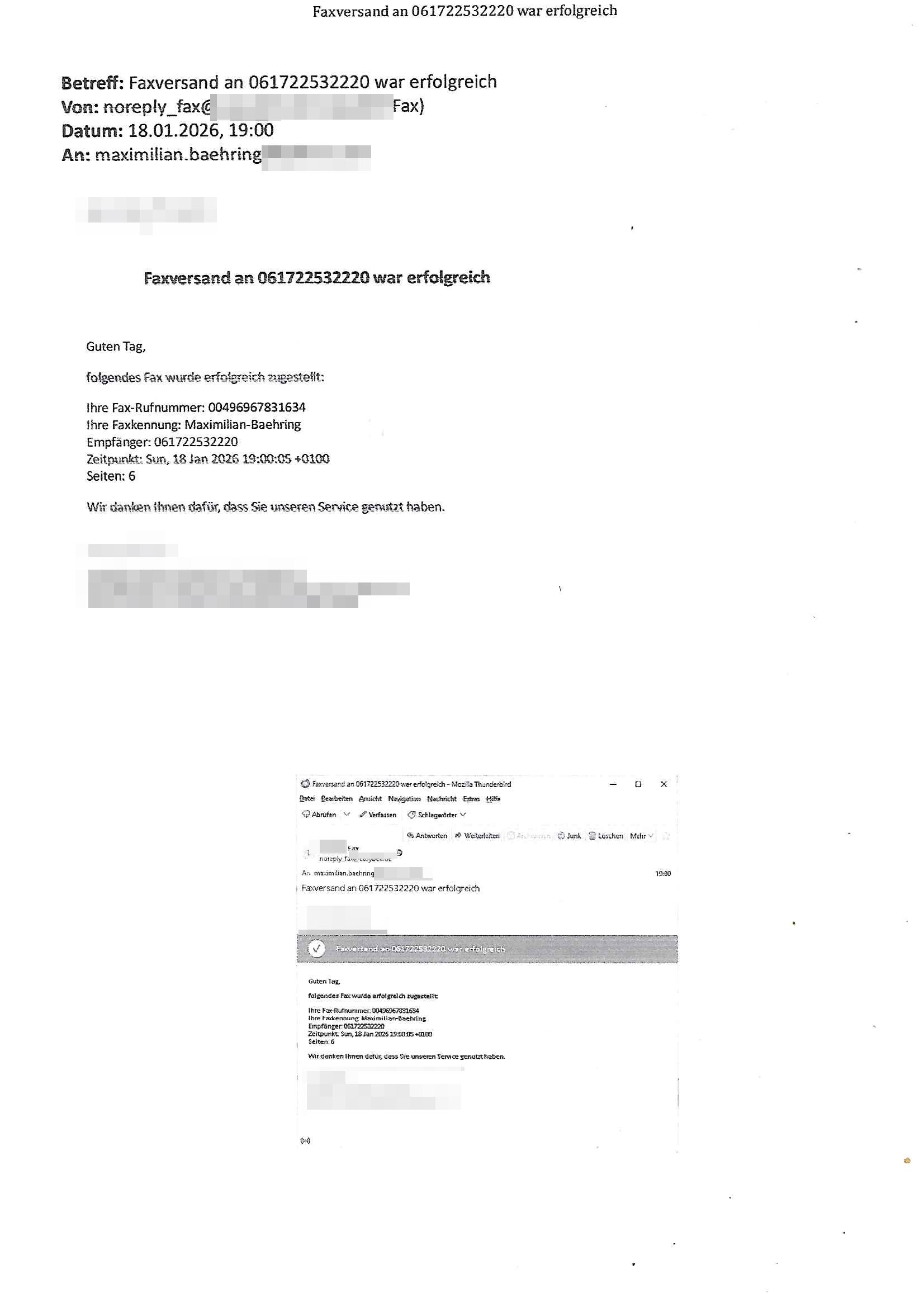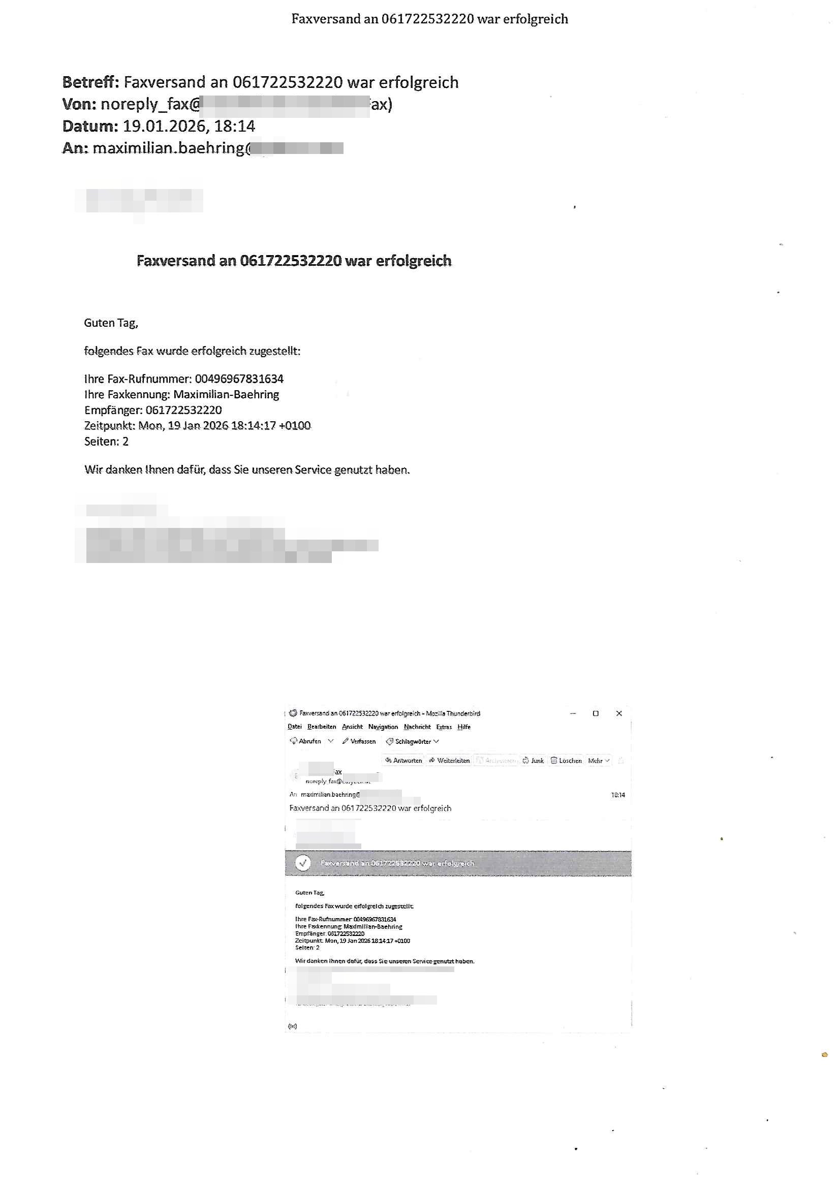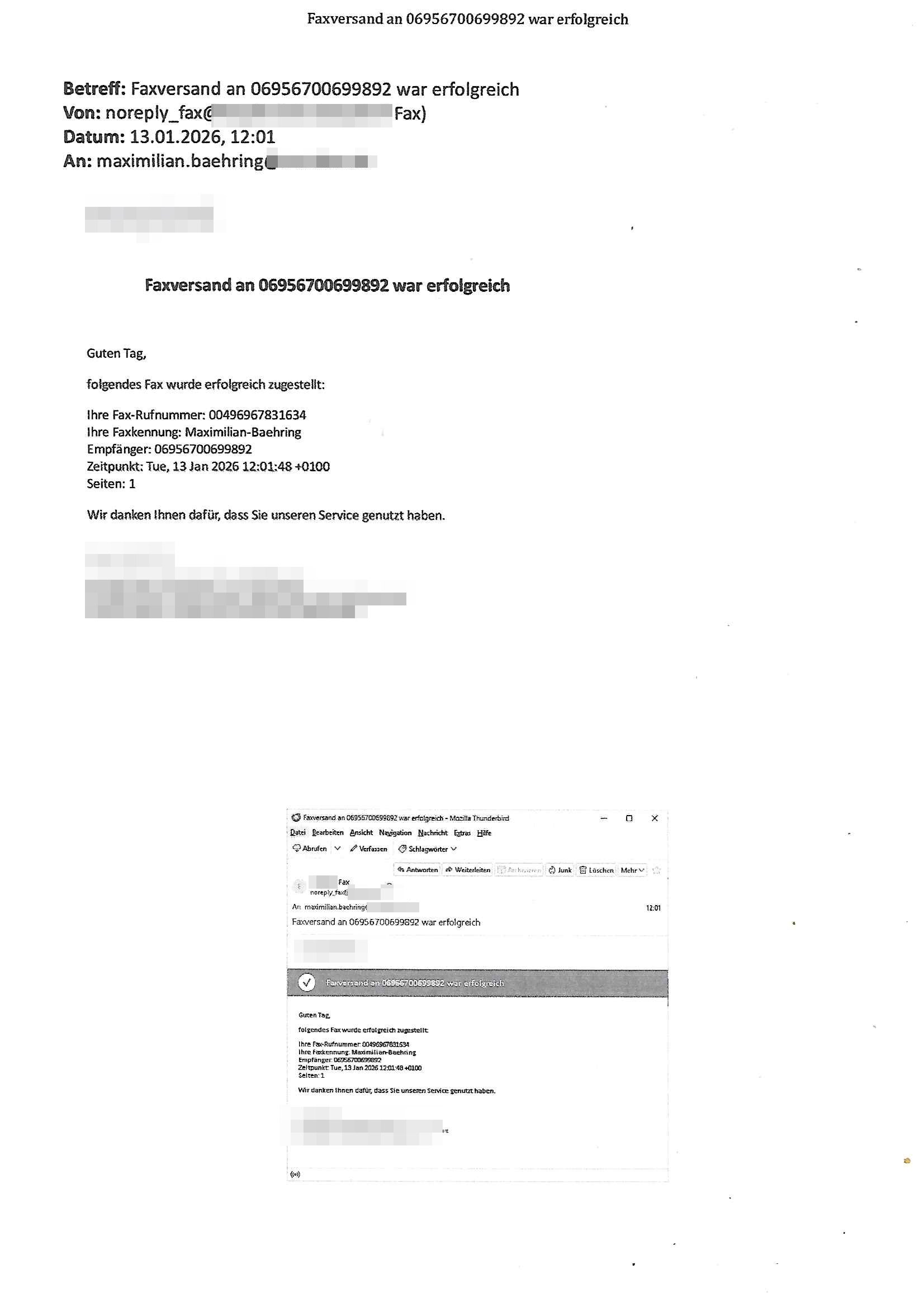 Betreff: Faxversand an 06956700699892 war erfolgreich Datum: Thu, 29 Jan 2026 17:25:53 +0000 (UTC) Von: Fax <noreply_fax@> An: maximilian.baehring@ Web2Fax Faxversand an 06956700699892 war erfolgreich Guten Tag, folgendes Fax wurde erfolgreich zugestellt: Ihre Fax-Rufnummer: 00496924749613 Ihre Faxkennung: Maximilian-Baehring Empfänger: 06956700699892 Zeitpunkt: Thu, 29 Jan 2026 18:25:53 +0100 Seiten: 1 Wir danken Ihnen dafür, dass Sie unseren Service genutzt haben. | |