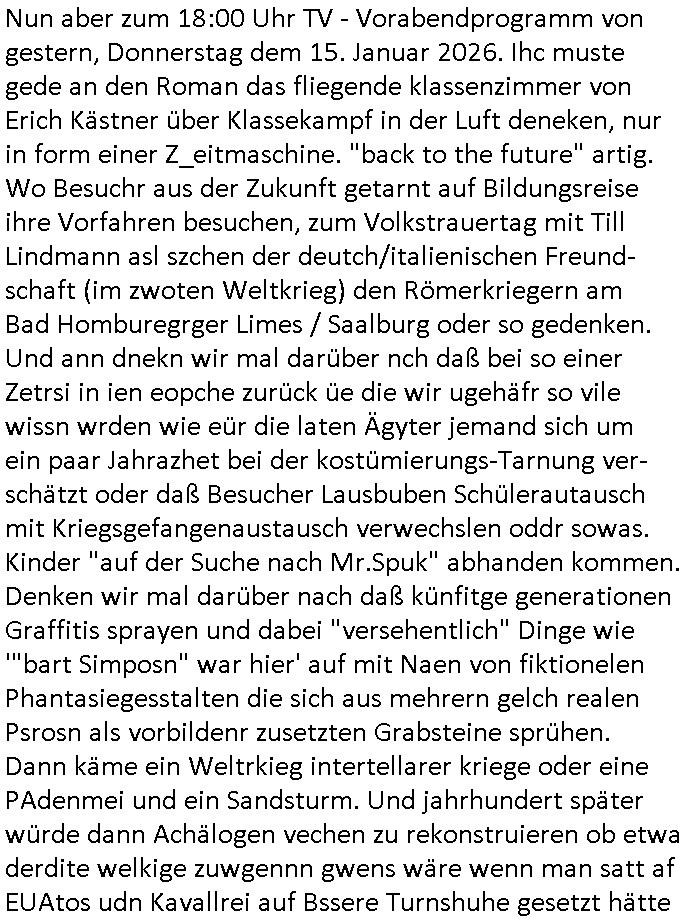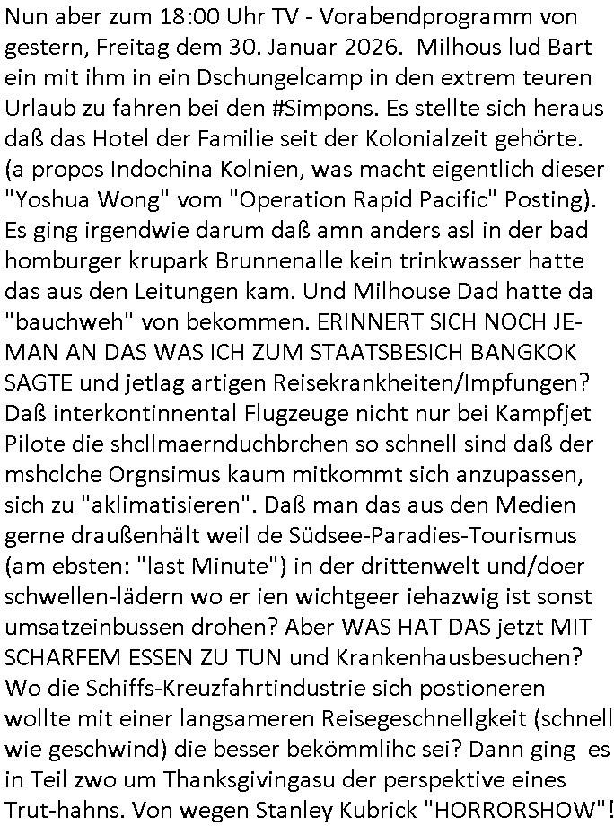 | Nun aber zum 18:00 Uhr TV - Vorabendprogramm von gestern, Freitag dem 30. Januar 2026. Milhous lud Bart ein mit ihm in ein Dschungelcamp in den extrem teuren Urlaub zu fahren bei den #Simpons. Es stellte sich heraus daß das Hotel der Familie seit der Kolonialzeit gehörte. (a propos Indochina Kolnien, was macht eigentlich dieser "Yoshua Wong" vom "Operation Rapid Pacific" Posting). Es ging irgendwie darum daß amn anders asl in der bad homburger krupark Brunnenalle kein trinkwasser hatte das aus den Leitungen kam. Und Milhouse Dad hatte da "bauchweh" von bekommen. ERINNERT SICH NOCH JE-MAN AN DAS WAS ICH ZUM STAATSBESICH BANGKOK SAGTE und jetlag artigen Reisekrankheiten/Impfungen? Daß interkontinnental Flugzeuge nicht nur bei Kampfjet Pilote die shcllmaernduchbrchen so schnell sind daß der mshclche Orgnsimus kaum mitkommt sich anzupassen, sich zu "aklimatisieren". Daß man das aus den Medien gerne draußenhält weil de Südsee-Paradies-Tourismus (am ebsten: "last Minute") in der drittenwelt und/doer schwellen-lädern wo er ien wichtgeer iehazwig ist sonst umsatzeinbussen drohen? Aber WAS HAT DAS jetzt MIT SCHARFEM ESSEN ZU TUN und Krankenhausbesuchen? Wo die Schiffs-Kreuzfahrtindustrie sich postioneren wollte mit einer langsameren Reisegeschnellgkeit (schnell wie geschwind) die besser bekömmlihc sei? Dann ging es in Teil zwo um Thanksgivingasu der perspektive eines Trut-hahns. Von wegen Stanley Kubrick "HORRORSHOW"!