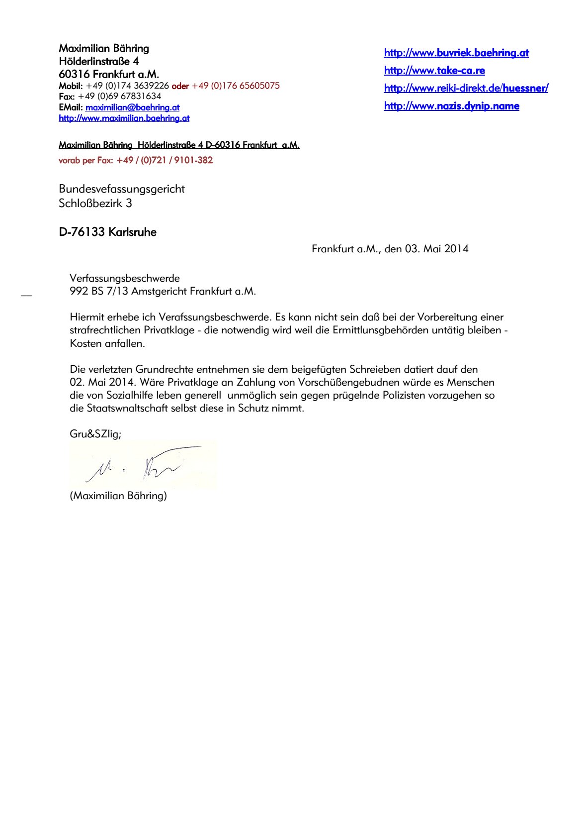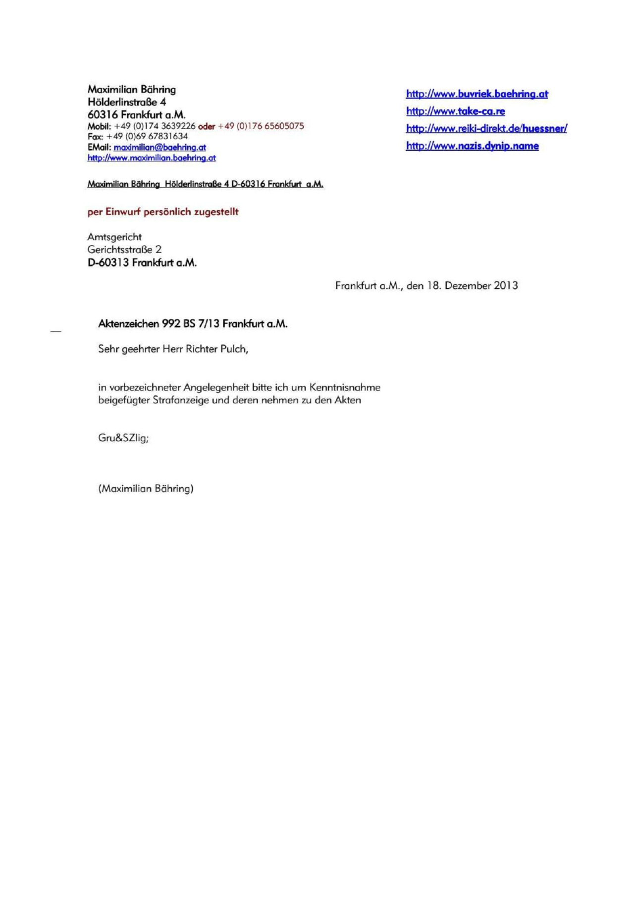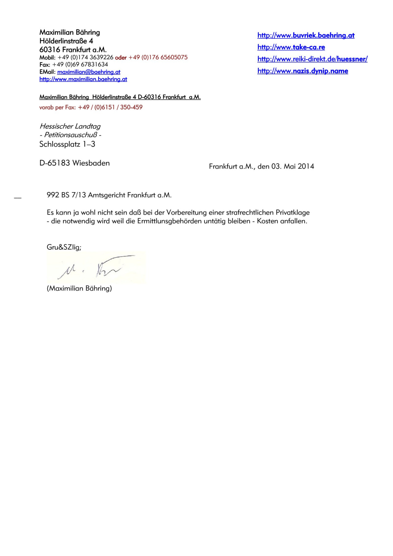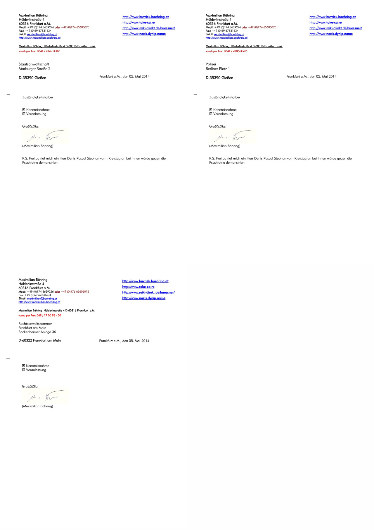 60316 Frankfurt a.M. Mobil: +49 (0)174 3639226 oder +49 (0)176 65605075 Fax: +49 (0)69 67831634 EMail: maximilian@baehring.at http://www.maximilian.baehring.at/ http://www.buvriek.baehring.at/ http://www.take-ca.re/ http://www.reiki-direkt.de/huessner/ http://www.nazis.dynip.name/ Maximilian Bähring Hölderlinstraße 4 D-60316 Frankfurt a.M. vorab per Fax: 069/1367-2100 Herrn Oberstaatsanwalt Dr. König mittels Generalstaatsanwaltschaft Zeil 42 D-60313 Frankfurt a.M. Frankfurt a.M., den 05. Mai 2014 Strafanzeige gegen Yvonne Vekony 48 XIV BAE 537/12L Amstgericht Frankfurt a.M. Hasselhorstweg 41 60599 Frankfurt a.M. Nicole McNally 48 XIV 566/12L Amstgericht Frankfurt a.M. Schlossgasse 3 35390 Gießen Rechtanwältin 48 XIV 459/13L Amstgericht Frankfurt a.M. Vera Darmstadt Monisstrae 7 60320 Frankfurt a.M. jeweils wegen Untreue, Betrug und sexistisch und politisch motivierter Beihilfe zu Erpressung und Kindesentführung nach § 235 (4) StGB Sehr geehrter Herr Dr. König, alle drei Damen wurden mir seinerzeit aufs Auge gedrückt, keien von beiden hat sich um irgendetwas gekümmert außer 144 Euro vom Staat fürs nichtstun zu kassieren. Frau Vekony hat sogar noch die Frerchheit besessen die Situation nochmal zu meinen Lasten zu verschlimmern. Bitte sorgen Sie dafür daß alle drei keienrlei Verfahrenspfleg- schaften mehr bekommen. Gru&SZlig; (Maximilian Bähring) +++ Maximilian Bähring Hölderlinstraße 4 60316 Frankfurt a.M. Mobil: +49 (0)174 3639226 oder +49 (0)176 65605075 Fax: +49 (0)69 67831634 EMail: maximilian@baehring.at http://www.maximilian.baehring.at/ http://www.buvriek.baehring.at/ http://www.take-ca.re/ http://www.reiki-direkt.de/huessner/ http://www.nazis.dynip.name/ Maximilian Bähring Hölderlinstraße 4 D-60316 Frankfurt a.M. vorab per Fax: 0641 / 7006-3069 Polizei Berliner Platz 1 D-35390 Gießen Frankfurt a.M., den 05. Mai 2014 Kenntnisnahme Veranlassung Gru&SZlig; (Maximilian Bähring) +++ Maximilian Bähring Hölderlinstraße 4 60316 Frankfurt a.M. Mobil: +49 (0)174 3639226 oder +49 (0)176 65605075 Fax: +49 (0)69 67831634 EMail: maximilian@baehring.at http://www.maximilian.baehring.at/ http://www.buvriek.baehring.at/ http://www.take-ca.re/ http://www.reiki-direkt.de/huessner/ http://www.nazis.dynip.name/ Maximilian Bähring Hölderlinstraße 4 D-60316 Frankfurt a.M. vorab per Fax: 0641 / 934 - 3302 Staatsanwaltschaft Marburger Straße 2 D-35390 Gießen Frankfurt a.M., den 05. Mai 2014 Kenntnisnahme Veranlassung Gru&SZlig; (Maximilian Bähring) P.S. Freitag rief mich ein Herr Denis Pascal Stephan vo,m Kreistag an bei Ihnen würde gegen die Psychiatrie demonstriert. +++ Maximilian Bähring Hölderlinstraße 4 60316 Frankfurt a.M. Mobil: +49 (0)174 3639226 oder +49 (0)176 65605075 Fax: +49 (0)69 67831634 EMail: maximilian@baehring.at http://www.maximilian.baehring.at/ http://www.buvriek.baehring.at/ http://www.take-ca.re/ http://www.reiki-direkt.de/huessner/ http://www.nazis.dynip.name/ Maximilian Bähring Hölderlinstraße 4 D-60316 Frankfurt a.M. vorab per Fax: 069 / 17 00 98 - 50 Rechtsanwaltskammer Frankfurt am Main Bockenheimer Anlage 36 D-60322 Frankfurt am Main^ Frankfurt a.M., den 05. Mai 2014 Kenntnisnahme Veranlassung Gru&SZlig; (Maximilian Bähring) [0] "201405040752-84748932454-0.jpg" [1] "201405040752-84748932454-1.jpg" [2] "201405040752-84748932454-2.jpg" |