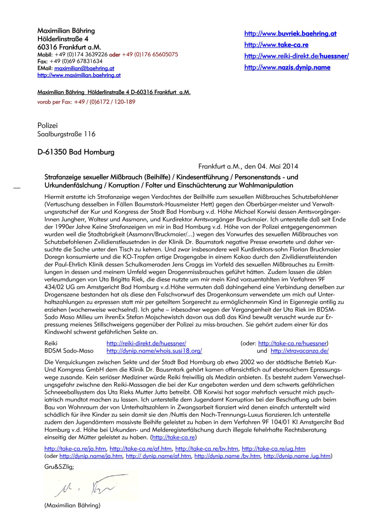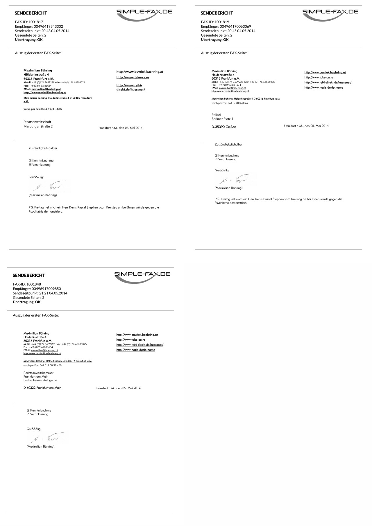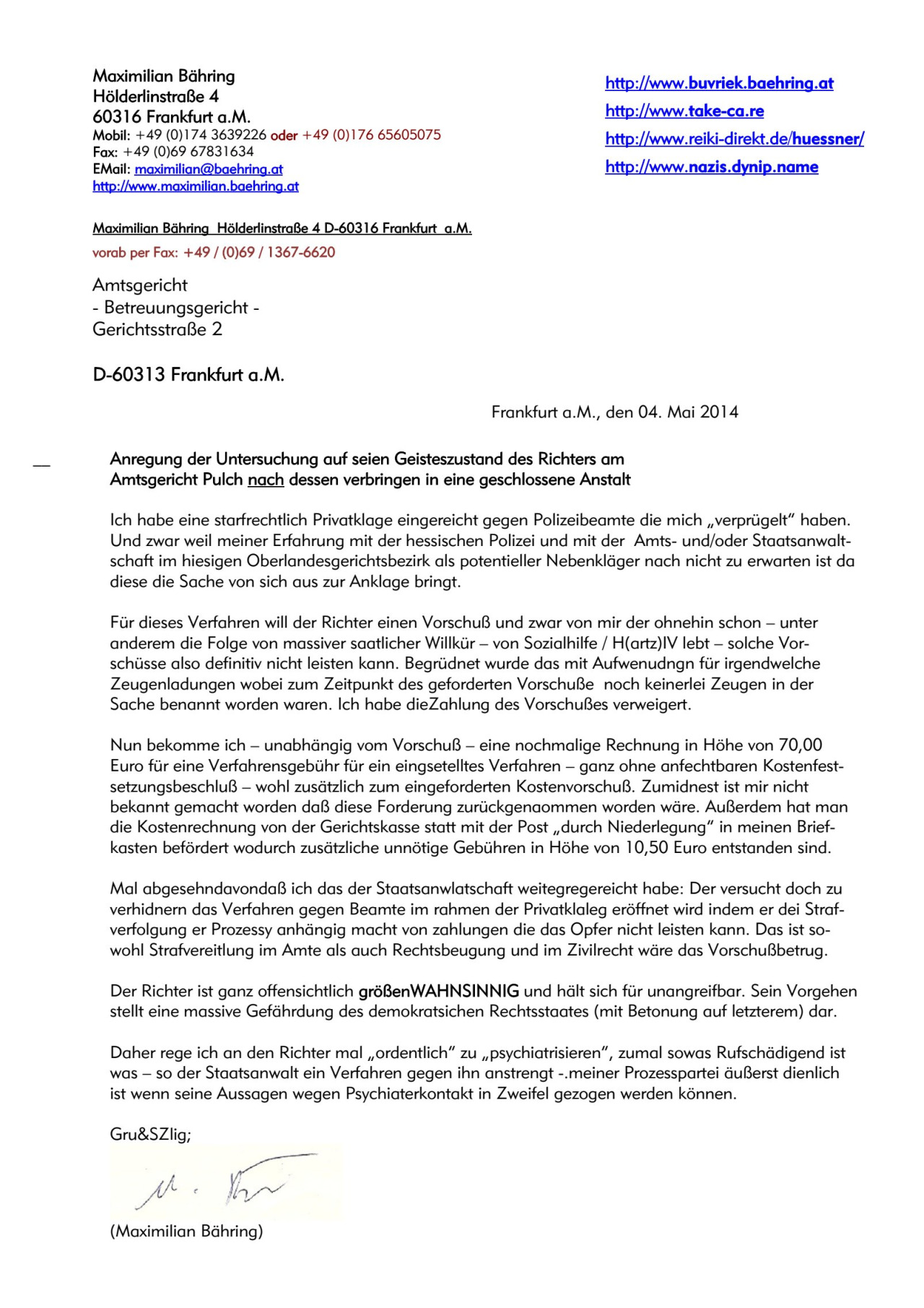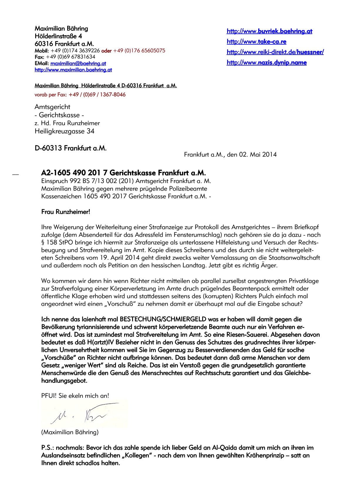 60316 Frankfurt a.M. Mobil: +49 (0)174 3639226 oder +49 (0)176 65605075 Fax: +49 (0)69 67831634 EMail: maximilian@baehring.at http://www.maximilian.baehring.at/ http://www.buvriek.baehring.at/ http://www.take-ca.re/ http://www.reiki-direkt.de/huessner/ http://www.nazis.dynip.name/ Maximilian Bähring Hölderlinstraße 4 D-60316 Frankfurt a.M. vorab per Fax: 069/1367-2100 Herrn Oberstaatsanwalt Dr. König mittels Generalstaatsanwaltschaft Zeil 42 D-60313 Frankfurt a.M. Frankfurt a.M., den 05. Mai 2014 Strafanzeige gegen Yvonne Vekony 48 XIV BAE 537/12L Amstgericht Frankfurt a.M. Hasselhorstweg 41 60599 Frankfurt a.M. Nicole McNally 48 XIV 566/12L Amstgericht Frankfurt a.M. Schlossgasse 3 35390 Gießen Rechtanwältin 48 XIV 459/13L Amstgericht Frankfurt a.M. Vera Darmstadt Monisstrae 7 60320 Frankfurt a.M. jeweils wegen Untreue, Betrug und sexistisch und politisch motivierter Beihilfe zu Erpressung und Kindesentführung nach § 235 (4) StGB Sehr geehrter Herr Dr. König, alle drei Damen wurden mir seinerzeit aufs Auge gedrückt, keien von beiden hat sich um irgendetwas gekümmert außer 144 Euro vom Staat fürs nichtstun zu kassieren. Frau Vekony hat sogar noch die Frerchheit besessen die Situation nochmal zu meinen Lasten zu verschlimmern. Bitte sorgen Sie dafür daß alle drei keienrlei Verfahrenspfleg- schaften mehr bekommen. Gru&SZlig; (Maximilian Bähring) +++ Maximilian Bähring Hölderlinstraße 4 60316 Frankfurt a.M. Mobil: +49 (0)174 3639226 oder +49 (0)176 65605075 Fax: +49 (0)69 67831634 EMail: maximilian@baehring.at http://www.maximilian.baehring.at/ http://www.buvriek.baehring.at/ http://www.take-ca.re/ http://www.reiki-direkt.de/huessner/ http://www.nazis.dynip.name/ Maximilian Bähring Hölderlinstraße 4 D-60316 Frankfurt a.M. vorab per Fax: 0641 / 7006-3069 Polizei Berliner Platz 1 D-35390 Gießen Frankfurt a.M., den 05. Mai 2014 Kenntnisnahme Veranlassung Gru&SZlig; (Maximilian Bähring) +++ Maximilian Bähring Hölderlinstraße 4 60316 Frankfurt a.M. Mobil: +49 (0)174 3639226 oder +49 (0)176 65605075 Fax: +49 (0)69 67831634 EMail: maximilian@baehring.at http://www.maximilian.baehring.at/ http://www.buvriek.baehring.at/ http://www.take-ca.re/ http://www.reiki-direkt.de/huessner/ http://www.nazis.dynip.name/ Maximilian Bähring Hölderlinstraße 4 D-60316 Frankfurt a.M. vorab per Fax: 0641 / 934 - 3302 Staatsanwaltschaft Marburger Straße 2 D-35390 Gießen Frankfurt a.M., den 05. Mai 2014 Kenntnisnahme Veranlassung Gru&SZlig; (Maximilian Bähring) P.S. Freitag rief mich ein Herr Denis Pascal Stephan vo,m Kreistag an bei Ihnen würde gegen die Psychiatrie demonstriert. +++ Maximilian Bähring Hölderlinstraße 4 60316 Frankfurt a.M. Mobil: +49 (0)174 3639226 oder +49 (0)176 65605075 Fax: +49 (0)69 67831634 EMail: maximilian@baehring.at http://www.maximilian.baehring.at/ http://www.buvriek.baehring.at/ http://www.take-ca.re/ http://www.reiki-direkt.de/huessner/ http://www.nazis.dynip.name/ Maximilian Bähring Hölderlinstraße 4 D-60316 Frankfurt a.M. vorab per Fax: 069 / 17 00 98 - 50 Rechtsanwaltskammer Frankfurt am Main Bockenheimer Anlage 36 D-60322 Frankfurt am Main^ Frankfurt a.M., den 05. Mai 2014 Kenntnisnahme Veranlassung Gru&SZlig; (Maximilian Bähring) [0] "201405040752-84748932454-0.jpg" [1] "201405040752-84748932454-1.jpg" [2] "201405040752-84748932454-2.jpg" |