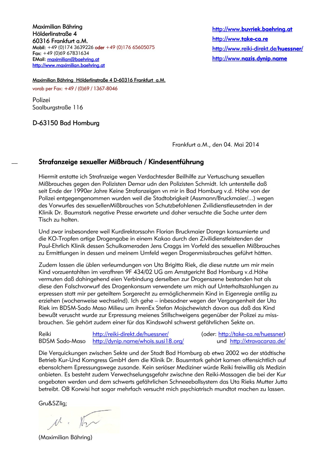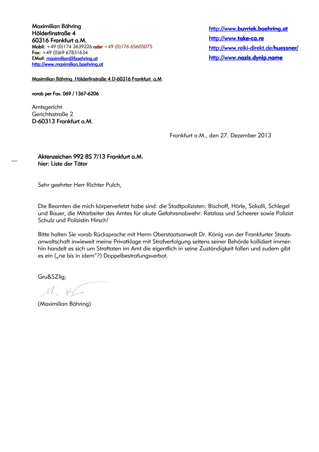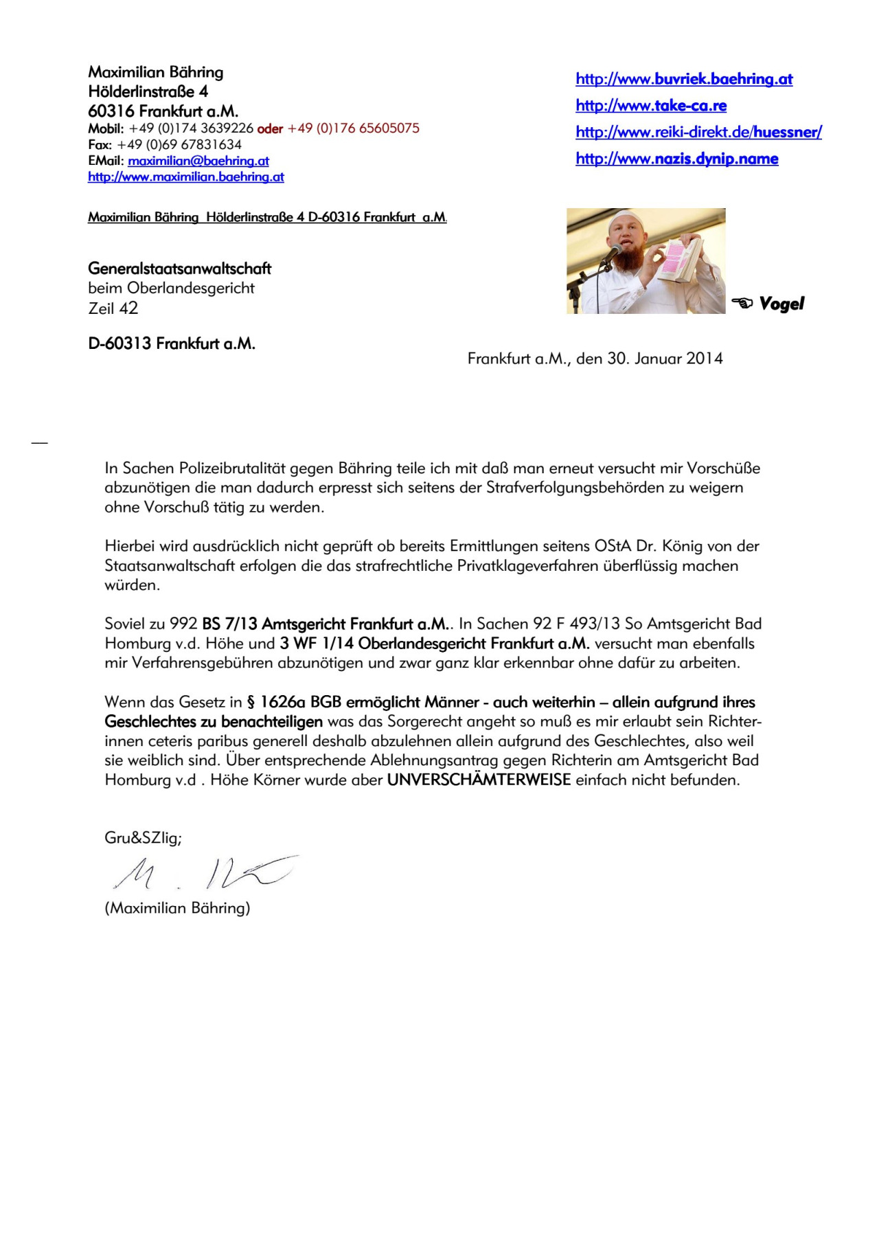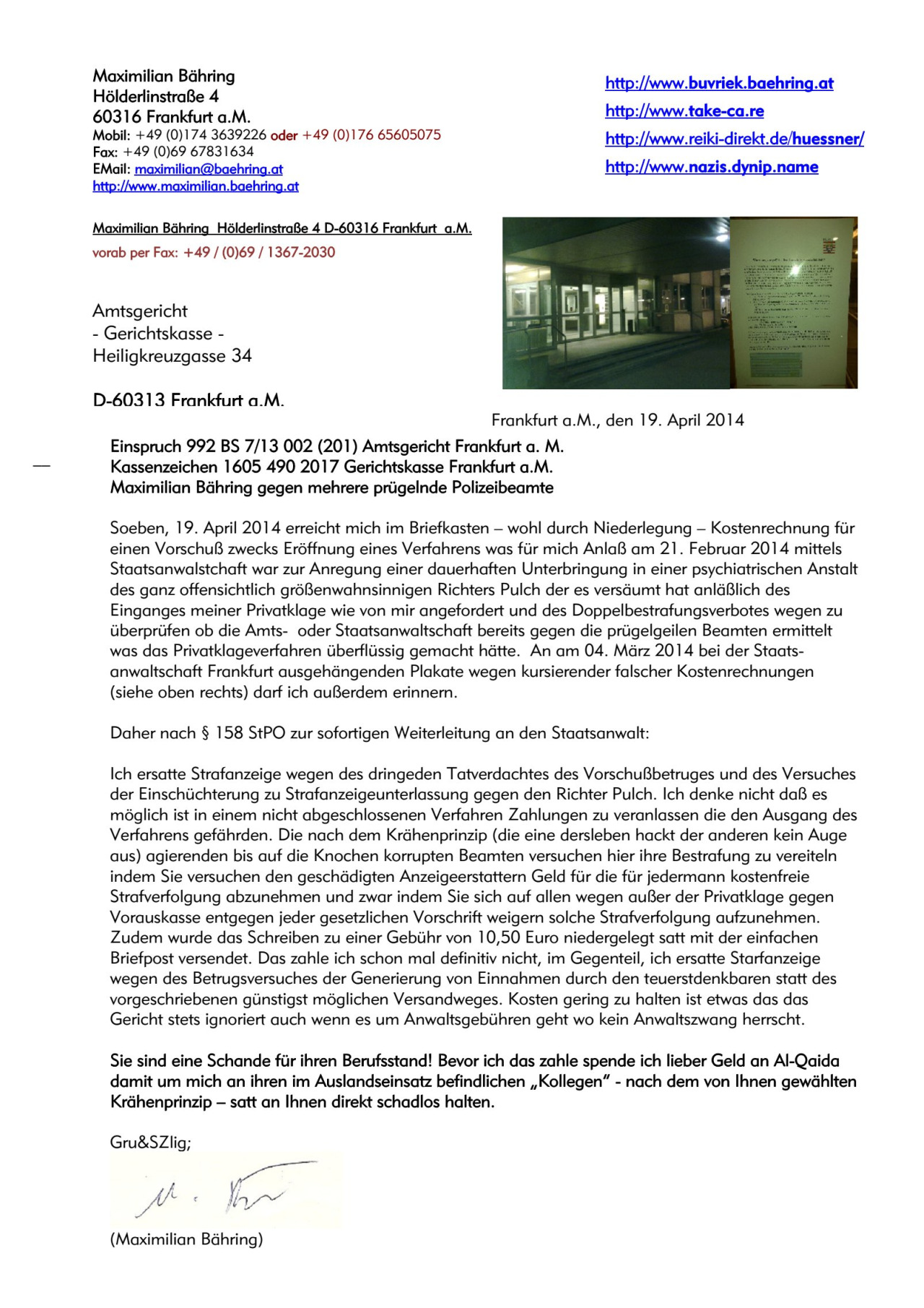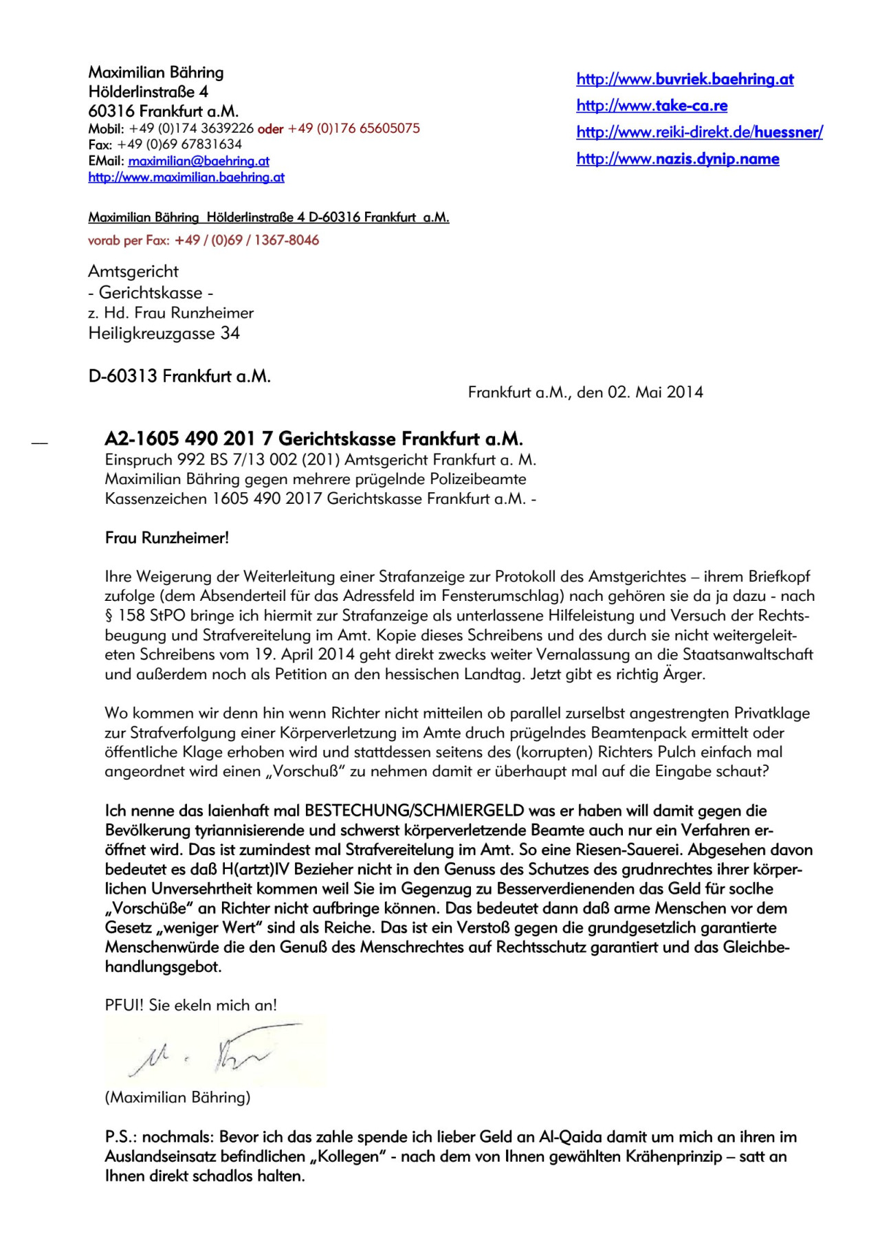 60316 Frankfurt a.M. Mobil: +49 (0)174 3639226 oder +49 (0)176 65605075 Fax: +49 (0)69 67831634 EMail: maximilian@baehring.at http://www.maximilian.baehring.at/ http://www.buvriek.baehring.at/ http://www.take-ca.re/ http://www.reiki-direkt.de/huessner/ http://www.nazis.dynip.name/ Maximilian Bähring Hölderlinstraße 4 D-60316 Frankfurt a.M. vorab per Fax: 069/1367-2100 Herrn Oberstaatsanwalt Dr. König mittels Generalstaatsanwaltschaft Zeil 42 D-60313 Frankfurt a.M. Frankfurt a.M., den 05. Mai 2014 Strafanzeige gegen Yvonne Vekony 48 XIV BAE 537/12L Amstgericht Frankfurt a.M. Hasselhorstweg 41 60599 Frankfurt a.M. Nicole McNally 48 XIV 566/12L Amstgericht Frankfurt a.M. Schlossgasse 3 35390 Gießen Rechtanwältin 48 XIV 459/13L Amstgericht Frankfurt a.M. Vera Darmstadt Monisstrae 7 60320 Frankfurt a.M. jeweils wegen Untreue, Betrug und sexistisch und politisch motivierter Beihilfe zu Erpressung und Kindesentführung nach § 235 (4) StGB Sehr geehrter Herr Dr. König, alle drei Damen wurden mir seinerzeit aufs Auge gedrückt, keien von beiden hat sich um irgendetwas gekümmert außer 144 Euro vom Staat fürs nichtstun zu kassieren. Frau Vekony hat sogar noch die Frerchheit besessen die Situation nochmal zu meinen Lasten zu verschlimmern. Bitte sorgen Sie dafür daß alle drei keienrlei Verfahrenspfleg- schaften mehr bekommen. Gru&SZlig; (Maximilian Bähring) +++ Maximilian Bähring Hölderlinstraße 4 60316 Frankfurt a.M. Mobil: +49 (0)174 3639226 oder +49 (0)176 65605075 Fax: +49 (0)69 67831634 EMail: maximilian@baehring.at http://www.maximilian.baehring.at/ http://www.buvriek.baehring.at/ http://www.take-ca.re/ http://www.reiki-direkt.de/huessner/ http://www.nazis.dynip.name/ Maximilian Bähring Hölderlinstraße 4 D-60316 Frankfurt a.M. vorab per Fax: 0641 / 7006-3069 Polizei Berliner Platz 1 D-35390 Gießen Frankfurt a.M., den 05. Mai 2014 Kenntnisnahme Veranlassung Gru&SZlig; (Maximilian Bähring) +++ Maximilian Bähring Hölderlinstraße 4 60316 Frankfurt a.M. Mobil: +49 (0)174 3639226 oder +49 (0)176 65605075 Fax: +49 (0)69 67831634 EMail: maximilian@baehring.at http://www.maximilian.baehring.at/ http://www.buvriek.baehring.at/ http://www.take-ca.re/ http://www.reiki-direkt.de/huessner/ http://www.nazis.dynip.name/ Maximilian Bähring Hölderlinstraße 4 D-60316 Frankfurt a.M. vorab per Fax: 0641 / 934 - 3302 Staatsanwaltschaft Marburger Straße 2 D-35390 Gießen Frankfurt a.M., den 05. Mai 2014 Kenntnisnahme Veranlassung Gru&SZlig; (Maximilian Bähring) P.S. Freitag rief mich ein Herr Denis Pascal Stephan vo,m Kreistag an bei Ihnen würde gegen die Psychiatrie demonstriert. +++ Maximilian Bähring Hölderlinstraße 4 60316 Frankfurt a.M. Mobil: +49 (0)174 3639226 oder +49 (0)176 65605075 Fax: +49 (0)69 67831634 EMail: maximilian@baehring.at http://www.maximilian.baehring.at/ http://www.buvriek.baehring.at/ http://www.take-ca.re/ http://www.reiki-direkt.de/huessner/ http://www.nazis.dynip.name/ Maximilian Bähring Hölderlinstraße 4 D-60316 Frankfurt a.M. vorab per Fax: 069 / 17 00 98 - 50 Rechtsanwaltskammer Frankfurt am Main Bockenheimer Anlage 36 D-60322 Frankfurt am Main^ Frankfurt a.M., den 05. Mai 2014 Kenntnisnahme Veranlassung Gru&SZlig; (Maximilian Bähring) [0] "201405040752-84748932454-0.jpg" [1] "201405040752-84748932454-1.jpg" [2] "201405040752-84748932454-2.jpg" |