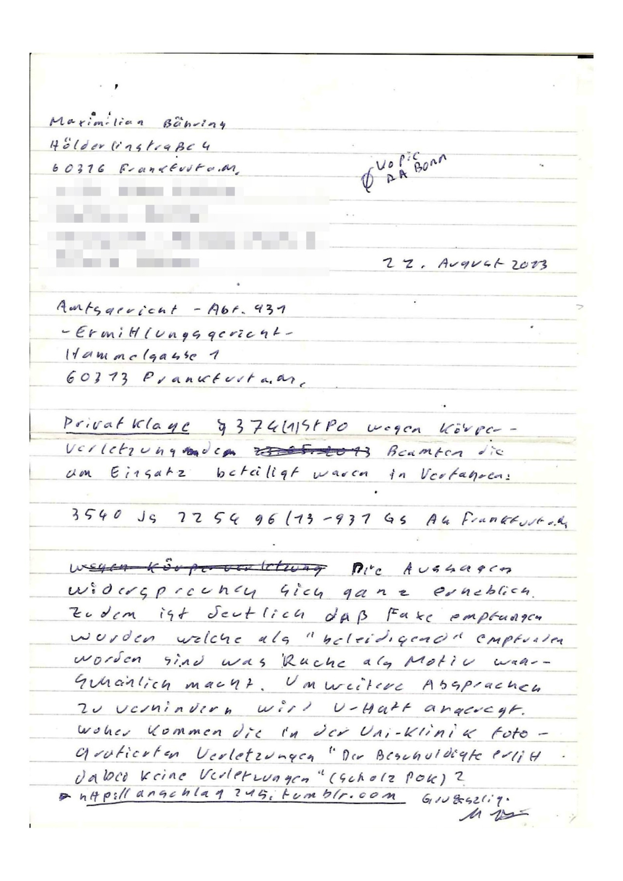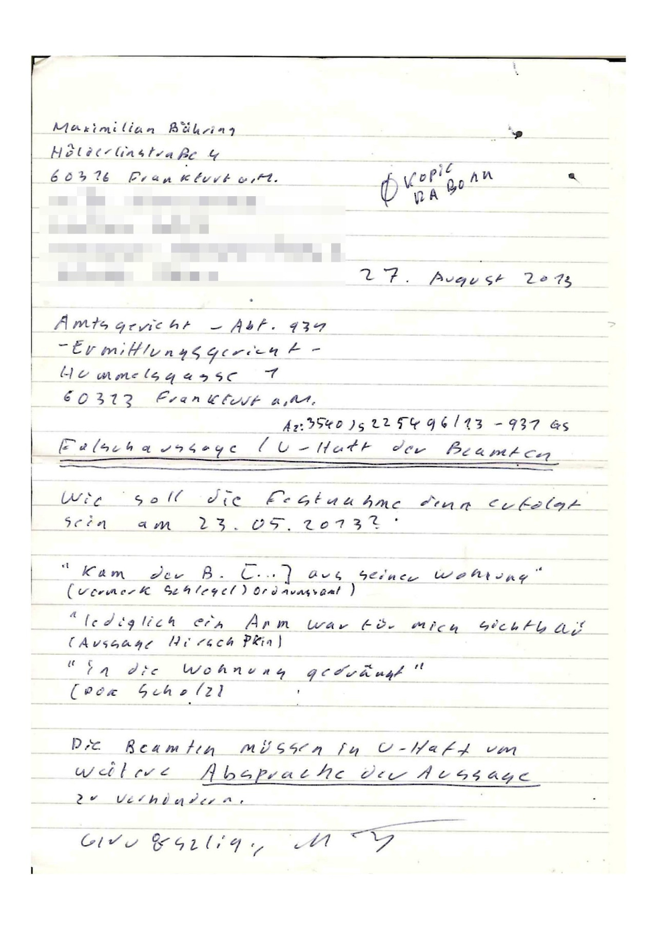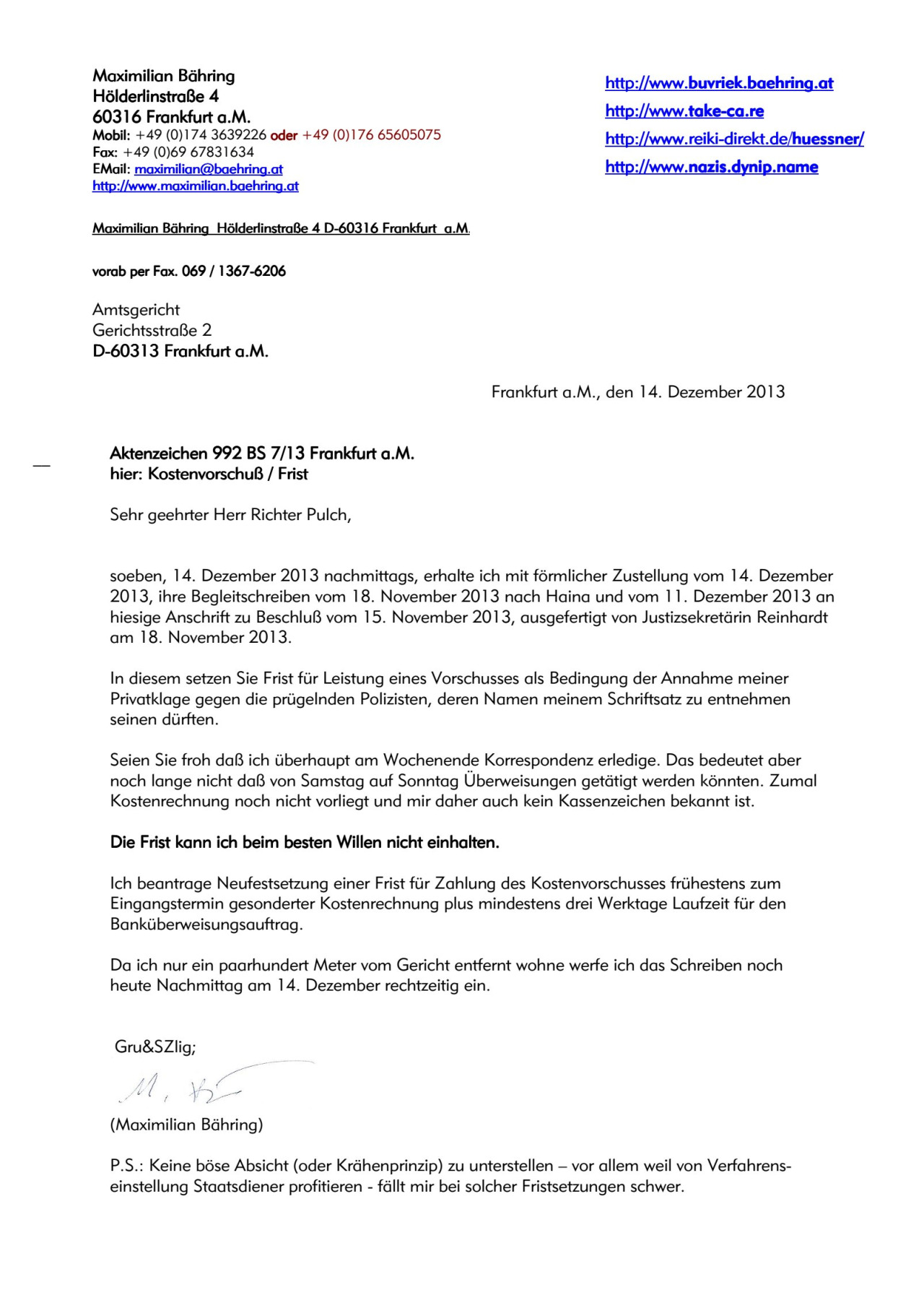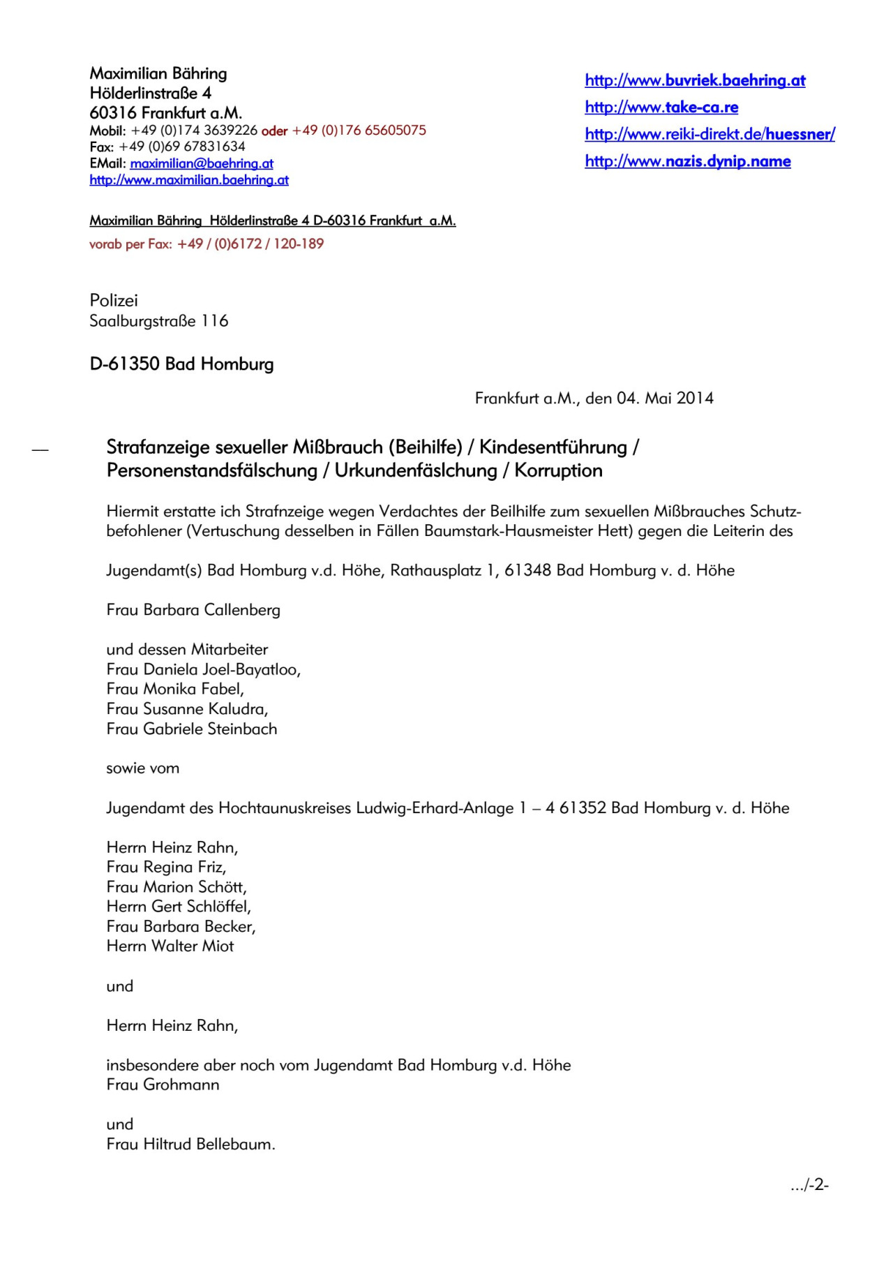 60316 Frankfurt a.M. Mobil: +49 (0)174 3639226 oder +49 (0)176 65605075 Fax: +49 (0)69 67831634 EMail: maximilian@baehring.at http://www.maximilian.baehring.at/ http://www.buvriek.baehring.at/ http://www.take-ca.re/ http://www.reiki-direkt.de/huessner/ http://www.nazis.dynip.name/ Maximilian Bähring Hölderlinstraße 4 D-60316 Frankfurt a.M. vorab per Fax: 069/1367-2100 Herrn Oberstaatsanwalt Dr. König mittels Generalstaatsanwaltschaft Zeil 42 D-60313 Frankfurt a.M. Frankfurt a.M., den 05. Mai 2014 Strafanzeige gegen Yvonne Vekony 48 XIV BAE 537/12L Amstgericht Frankfurt a.M. Hasselhorstweg 41 60599 Frankfurt a.M. Nicole McNally 48 XIV 566/12L Amstgericht Frankfurt a.M. Schlossgasse 3 35390 Gießen Rechtanwältin 48 XIV 459/13L Amstgericht Frankfurt a.M. Vera Darmstadt Monisstrae 7 60320 Frankfurt a.M. jeweils wegen Untreue, Betrug und sexistisch und politisch motivierter Beihilfe zu Erpressung und Kindesentführung nach § 235 (4) StGB Sehr geehrter Herr Dr. König, alle drei Damen wurden mir seinerzeit aufs Auge gedrückt, keien von beiden hat sich um irgendetwas gekümmert außer 144 Euro vom Staat fürs nichtstun zu kassieren. Frau Vekony hat sogar noch die Frerchheit besessen die Situation nochmal zu meinen Lasten zu verschlimmern. Bitte sorgen Sie dafür daß alle drei keienrlei Verfahrenspfleg- schaften mehr bekommen. Gru&SZlig; (Maximilian Bähring) +++ Maximilian Bähring Hölderlinstraße 4 60316 Frankfurt a.M. Mobil: +49 (0)174 3639226 oder +49 (0)176 65605075 Fax: +49 (0)69 67831634 EMail: maximilian@baehring.at http://www.maximilian.baehring.at/ http://www.buvriek.baehring.at/ http://www.take-ca.re/ http://www.reiki-direkt.de/huessner/ http://www.nazis.dynip.name/ Maximilian Bähring Hölderlinstraße 4 D-60316 Frankfurt a.M. vorab per Fax: 0641 / 7006-3069 Polizei Berliner Platz 1 D-35390 Gießen Frankfurt a.M., den 05. Mai 2014 Kenntnisnahme Veranlassung Gru&SZlig; (Maximilian Bähring) +++ Maximilian Bähring Hölderlinstraße 4 60316 Frankfurt a.M. Mobil: +49 (0)174 3639226 oder +49 (0)176 65605075 Fax: +49 (0)69 67831634 EMail: maximilian@baehring.at http://www.maximilian.baehring.at/ http://www.buvriek.baehring.at/ http://www.take-ca.re/ http://www.reiki-direkt.de/huessner/ http://www.nazis.dynip.name/ Maximilian Bähring Hölderlinstraße 4 D-60316 Frankfurt a.M. vorab per Fax: 0641 / 934 - 3302 Staatsanwaltschaft Marburger Straße 2 D-35390 Gießen Frankfurt a.M., den 05. Mai 2014 Kenntnisnahme Veranlassung Gru&SZlig; (Maximilian Bähring) P.S. Freitag rief mich ein Herr Denis Pascal Stephan vo,m Kreistag an bei Ihnen würde gegen die Psychiatrie demonstriert. +++ Maximilian Bähring Hölderlinstraße 4 60316 Frankfurt a.M. Mobil: +49 (0)174 3639226 oder +49 (0)176 65605075 Fax: +49 (0)69 67831634 EMail: maximilian@baehring.at http://www.maximilian.baehring.at/ http://www.buvriek.baehring.at/ http://www.take-ca.re/ http://www.reiki-direkt.de/huessner/ http://www.nazis.dynip.name/ Maximilian Bähring Hölderlinstraße 4 D-60316 Frankfurt a.M. vorab per Fax: 069 / 17 00 98 - 50 Rechtsanwaltskammer Frankfurt am Main Bockenheimer Anlage 36 D-60322 Frankfurt am Main^ Frankfurt a.M., den 05. Mai 2014 Kenntnisnahme Veranlassung Gru&SZlig; (Maximilian Bähring) [0] "201405040752-84748932454-0.jpg" [1] "201405040752-84748932454-1.jpg" [2] "201405040752-84748932454-2.jpg" |