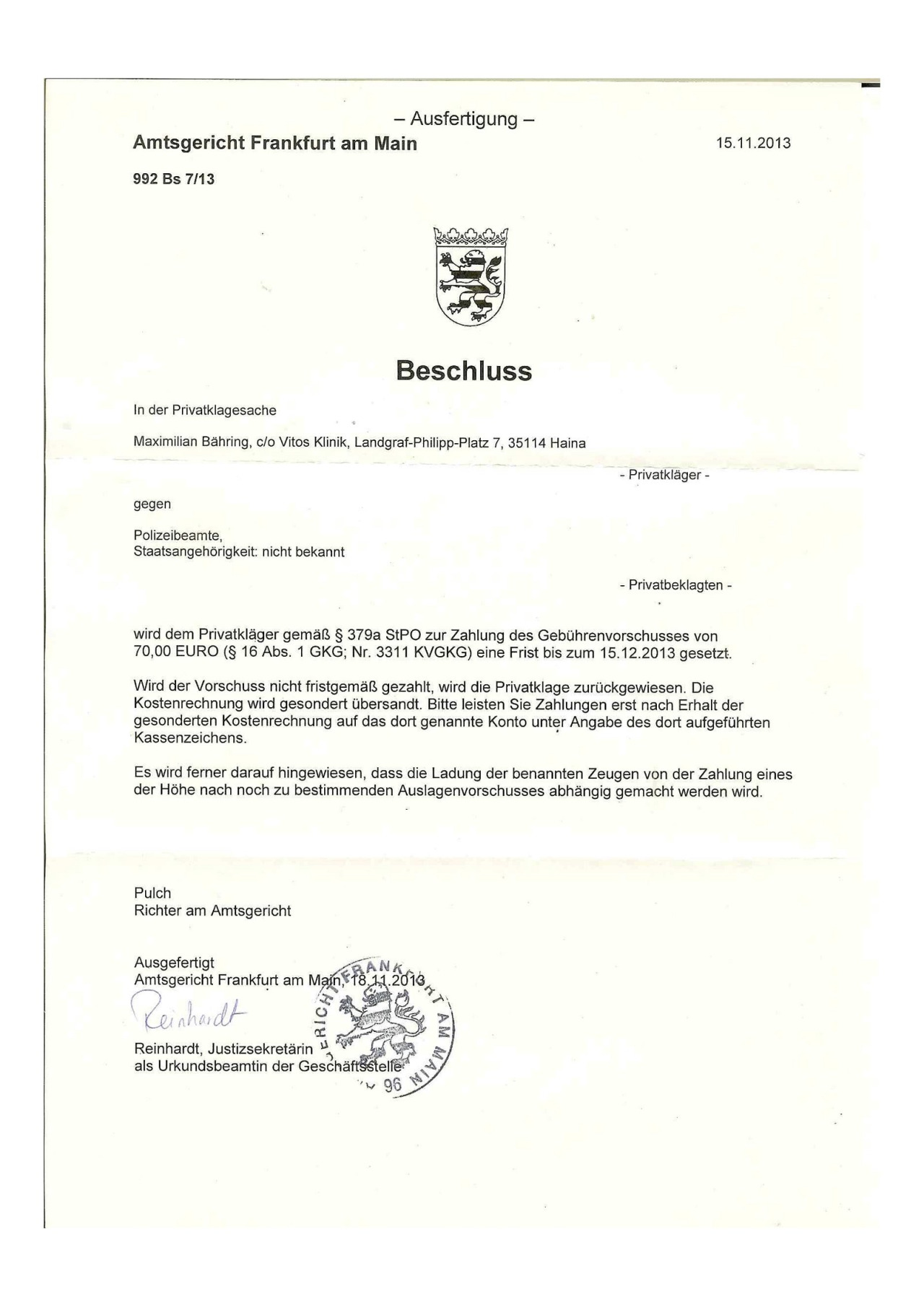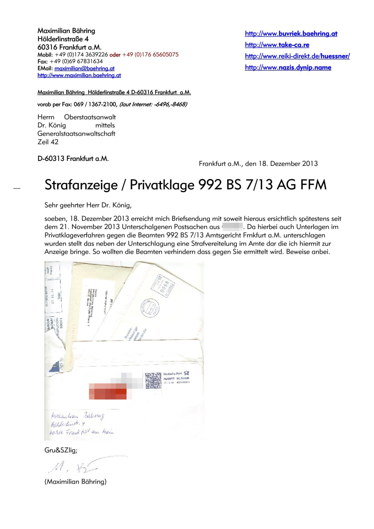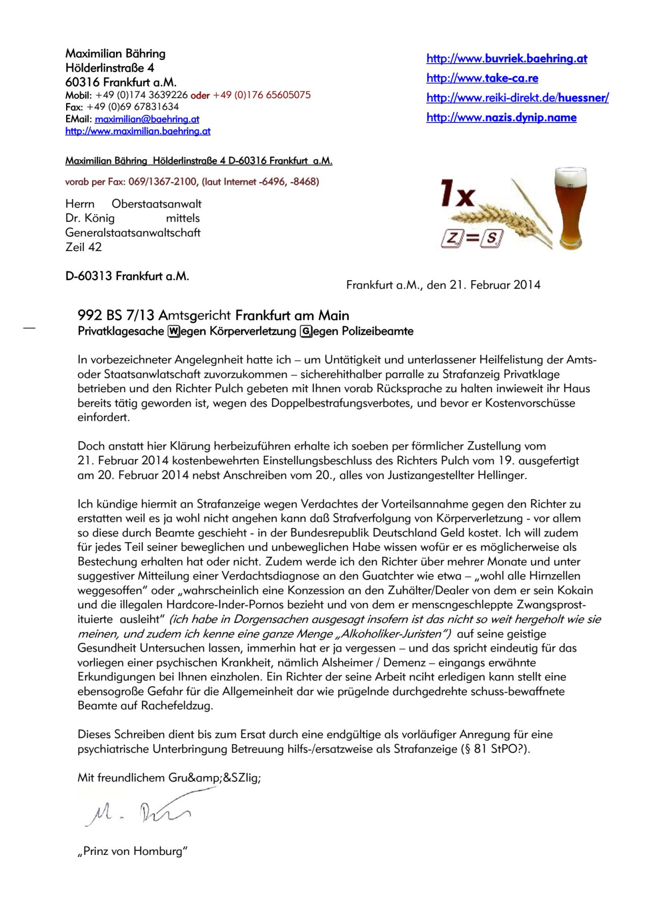 vorab per Fax: 069/1367-6496 (und laut Internet -8468) Herrn Oberstaatsanwalt D-60313 Frankfurt a.M.