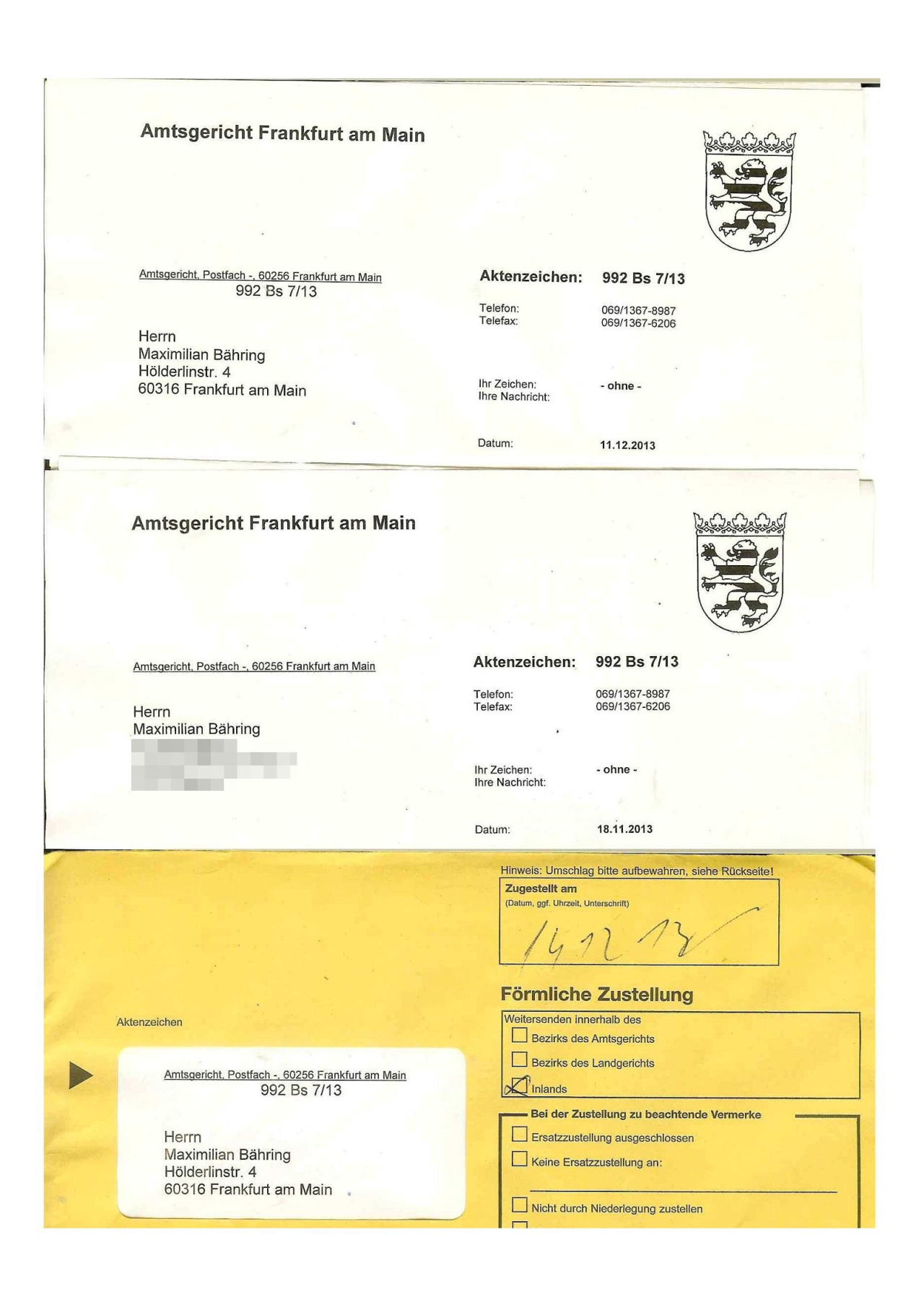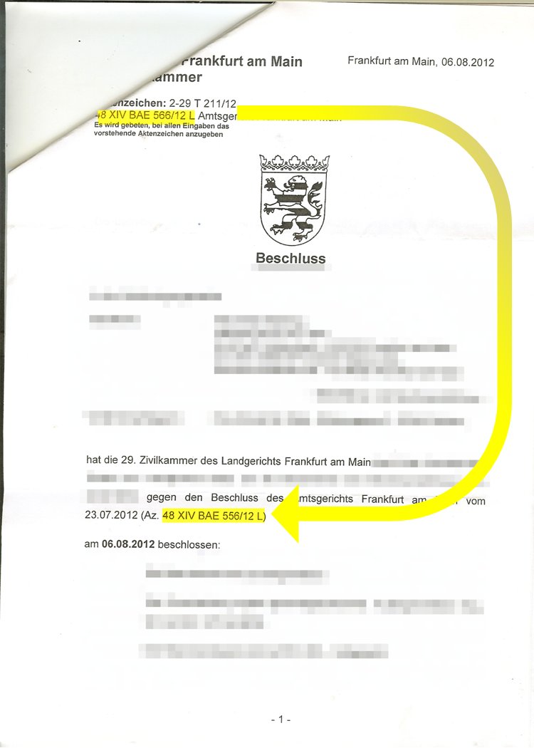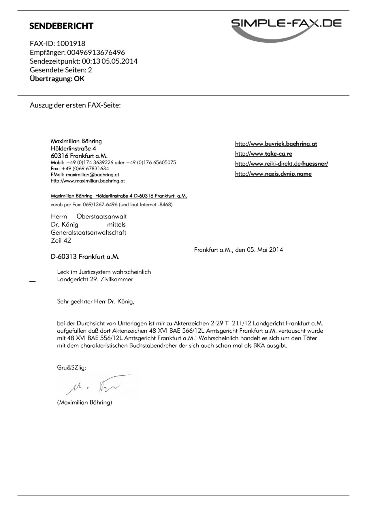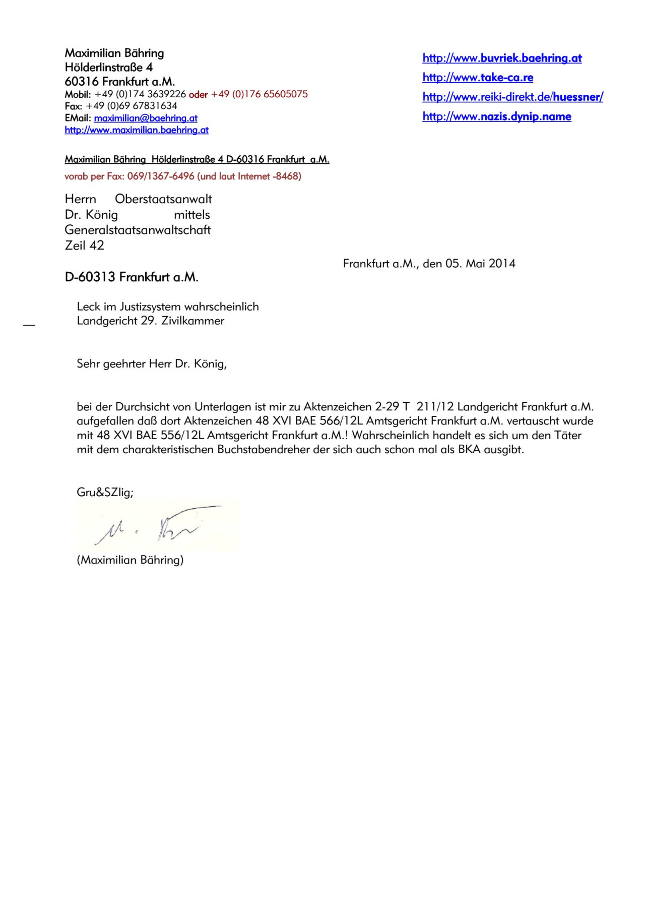 Frankfurt a.M., den 05. Mai 2014 Leck im Justizsystem wahrscheinlich Sehr geehrter Herr Dr. König, bei der Durchsicht von Unterlagen ist mir zu Aktenzeichen 2-29 T 211/12 Landgericht Frankfurt a.M. aufgefallen daß dort Aktenzeichen 48 XVI BAE 566/12L Amtsgericht Frankfurt a.M. vertauscht wurde mit 48 XVI BAE 556/12L Amtsgericht Frankfurt a.M.! Wahrscheinlich handelt es sich um den Täter mit dem charakteristischen Buchstabendreher der sich auch schon mal als BKA ausgibt.
