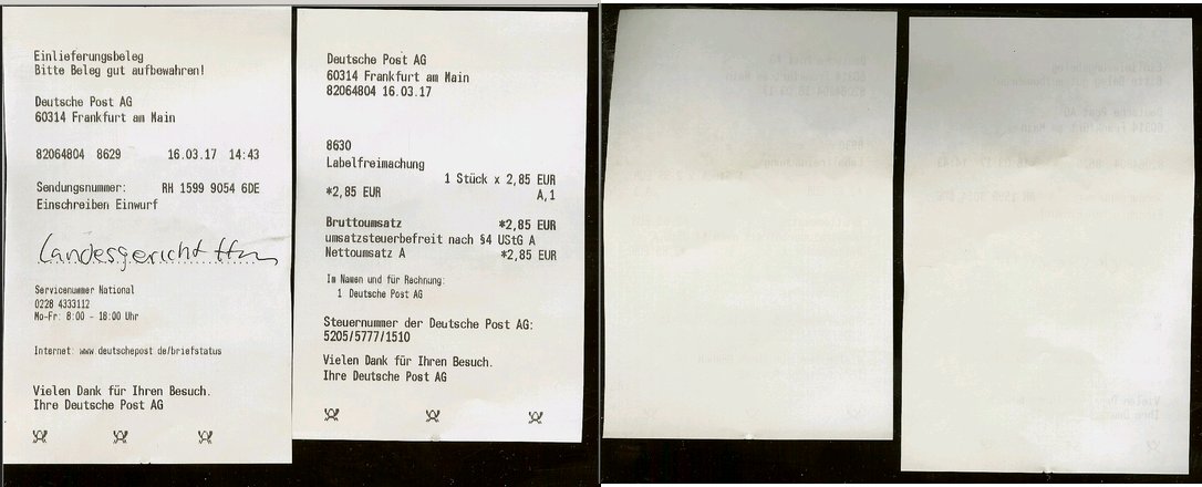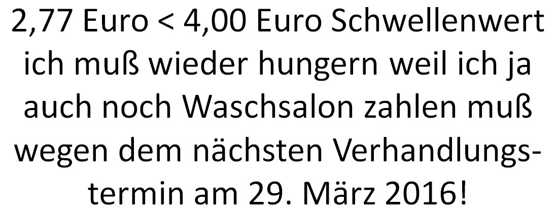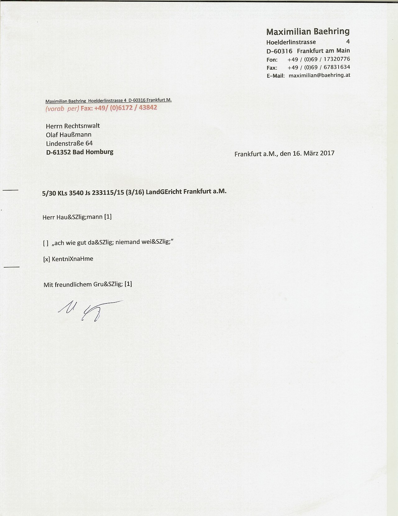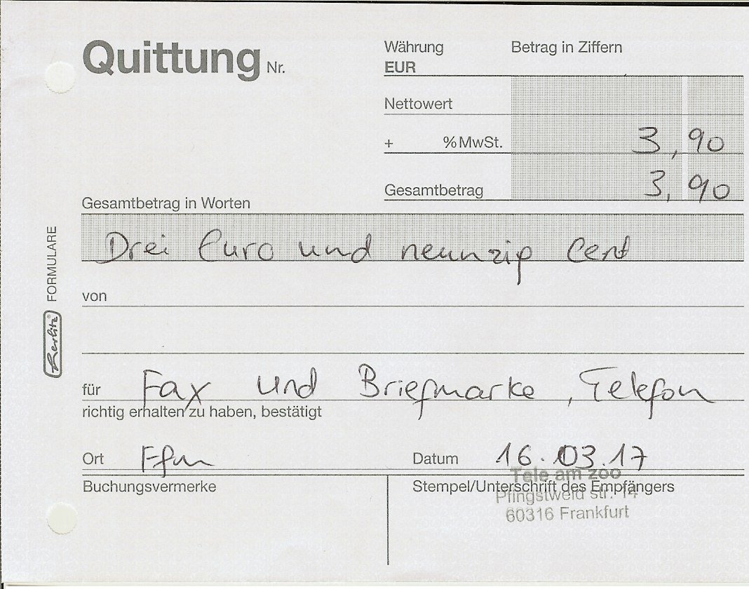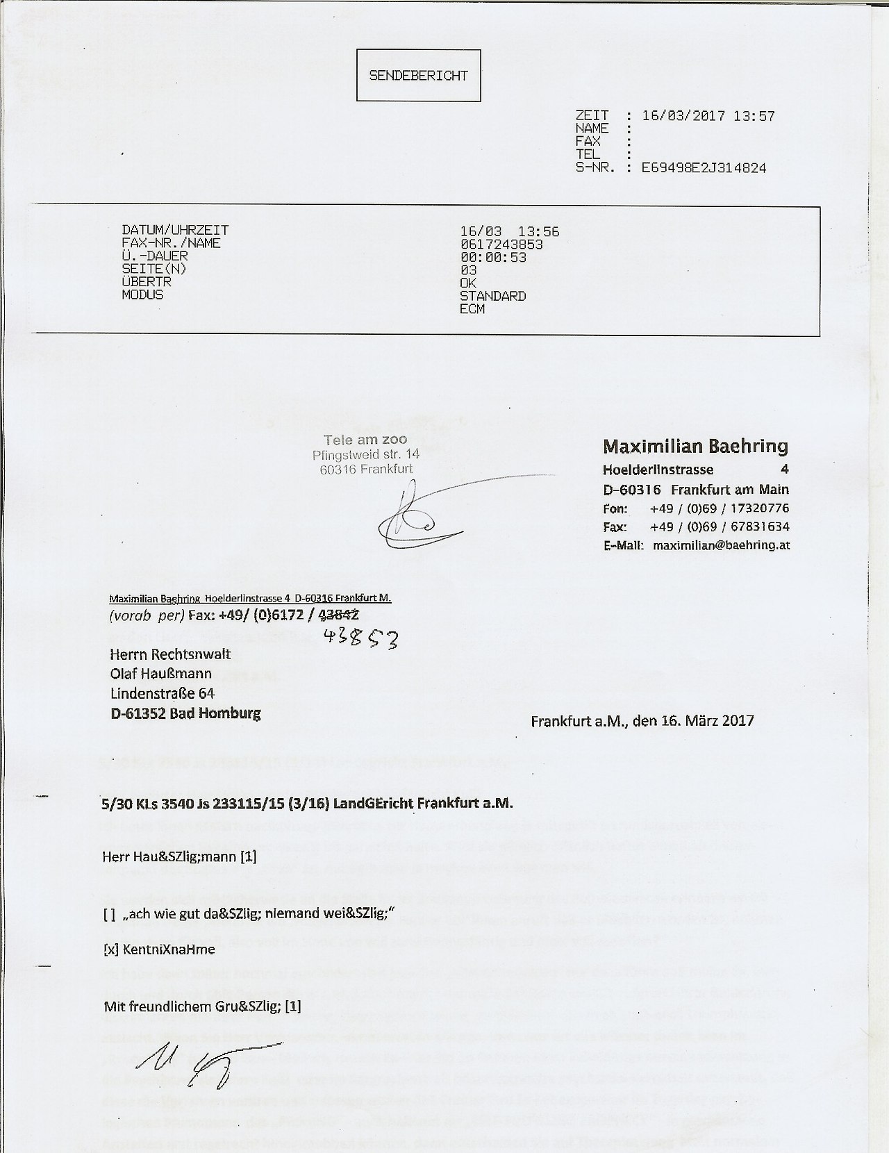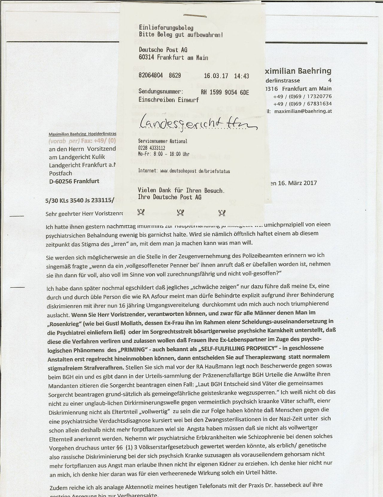 Ich hab Haussmann tefonnumemr aufegschriebn statt der Faxnumemr aber das it kein problem hab ihn agerufen undmri die richtige numemr besorgt. Bei ghasselbeck gan es von dr pfingsweidstraße aus dasProblem daß das Fax nicht durchging. Vom Copy cnetr zeil aus ginges allerdings druch obgleich zunächt der Anrufbeantworter antwortet mit eienr bndansage man könne unter dieser Numemr auch ien Fax senden. Das sind ie anderenTelfontae. Selstamerwiese ist in der Pfingsweidtsraße  angeblich das Compüuter-Terminal abgestürzt von dem aus die Einschreibebrirfe abgeschickt werden. Qutiitungen/Kosten: Da kommt noch 1 Euro obendrauf für das Fax vom coY Center Zeil aus. 4Wir din bereits jetztw irder bei über 5 Euro Portogebürhen noch ohne daß das eisnwurfeisnchriebn ans Gericht mit dabei ist dessen Versand man möglicherweise sogar absichtlich zu be-/verhindrn sucht.