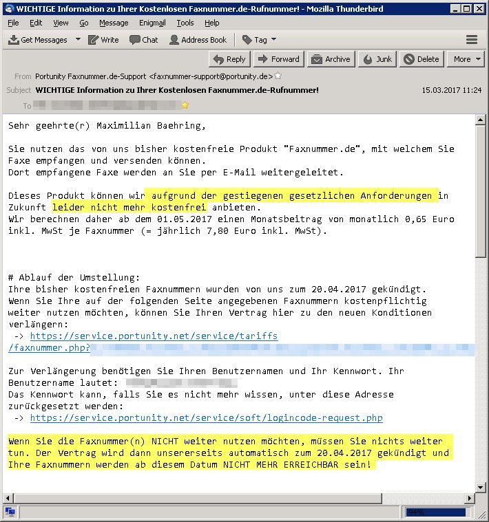 Ihre bisher kostenfreien Faxnummern wurden von uns zum 20.04.2017 gekündigt. Wenn Sie Ihre auf der folgenden Seite angegebenen Faxnummern kostenpflichtig weiter nutzen möchten, können Sie Ihren Vertrag hier zu den neuen Konditionen verlängern:  -> https://service.portunity.net/service/tariffs/faxnummer.php?