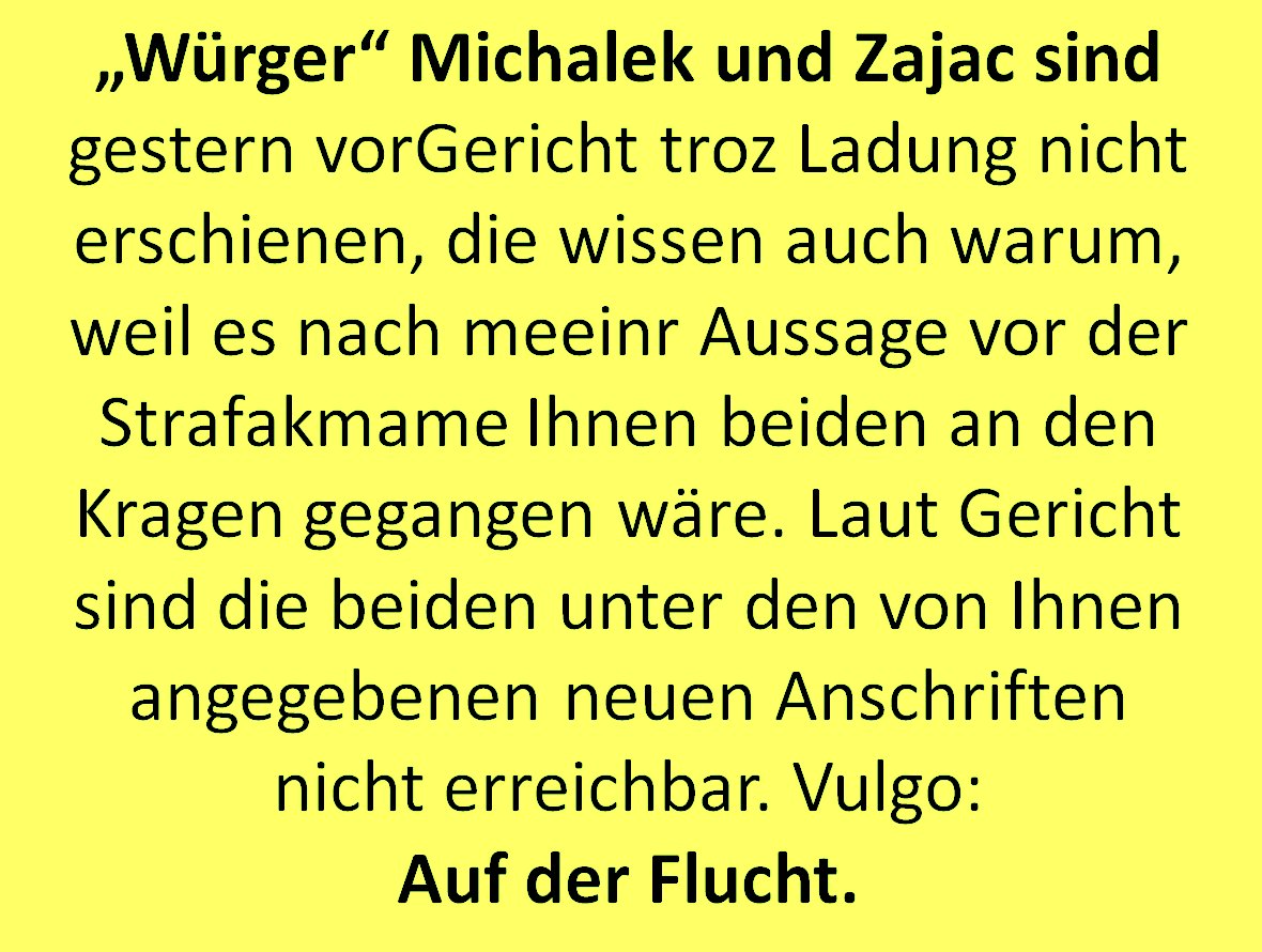 ?Würger? Michalek und Zajac sind gestern vorGericht troz Ladung nicht erschienen, die wissen auch warum, weil es nach meeinr Aussage vor der Strafakmame Ihnen beiden an den Kragen gegangen wäre. Laut Gericht sind die beiden unter den von Ihnen angegebenen neuen Anschriften nicht erreichbar. Vulgo:Auf der Flucht.