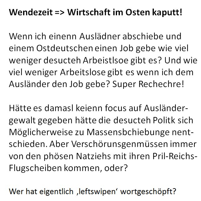 Hätte es damasl keienn focus auf Ausländer-gewalt gegeben hätte die desucteh Politk sich Möglicherweise zu Massensbchiebunge nent-schieden. Aber Verschörunsgenmüssen immer von den phösen Natziehs mit ihren Pril-Reichs-Flugscheiben kommen, oder?