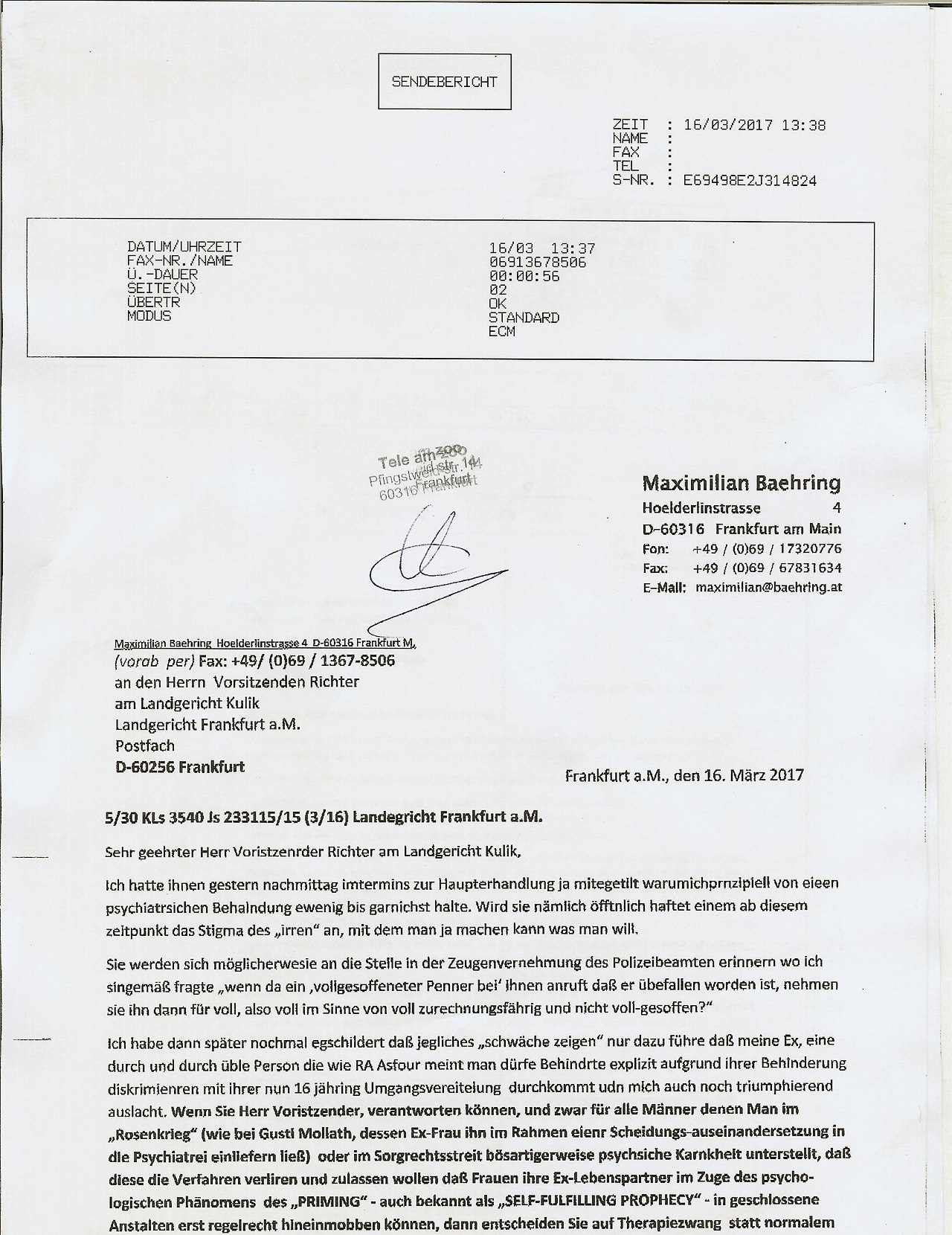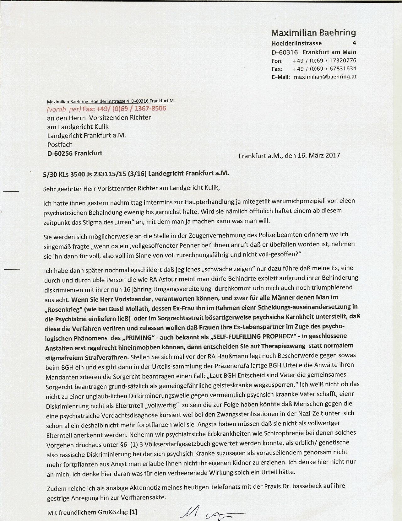 Ich habe dann später nochmal egschildert daß jegliches ?schwäche zeigen? nur dazu führe daß meine Ex, eine durch und durch üble Person die wie RA Asfour meint man dürfe Behindrte explizit aufgrund ihrer Behinderung diskrimienren mit ihrer nun 16 jähring Umgangsvereitelung  durchkommt udn mich auch noch triumphierend auslacht. Wenn Sie Herr Voristzender, verantworten können, und zwar für alle Männer denen Man im ?Rosenkrieg? (wie bei Gustl Mollath, dessen Ex-Frau ihn im Rahmen eienr Scheidungs-auseinandersetzung in die Psychiatrei einliefern ließ)  oder im Sorgrechtsstreit bösartigerweise psychsiche Karnkheit unterstellt, daß diese die Verfahren verliren und zulassen wollen daß Frauen ihre Ex-Lebenspartner im Zuge des psycho-logischen Phänomens  des ?PRIMING? - auch bekannt als ?SELF-FULFILLING PROPHECY? - in geschlossene Anstalten erst regelrecht hineinmobben können, dann entscheiden Sie auf Therapiezwang  statt normalem stigmafreiem Strafverafhren. Stellen Sie sich mal vor der RA Haußmann legt noch Bescherwerde gegen sowas beim BGH ein und es gibt dann in der Urteils-sammlung der Präzenenzfallartge BGH Urteile die Anwälte ihren Mandanten zitieren die Sorgercht beantragen einen Fall: ?Laut BGH Entscheid sind Väter die gemeinsames Sorgercht beantragen grund-sätzlich als gemeingefährliche geisteskranke wegzusperren.? Ich weiß nicht ob das nicht zu einer unglaub-lichen Dirkirminerungswelle gegen vermeintlich psychsich kraanke Väter schafft, eienr Diskrimienrung nicht als Eltertnteil ?vollwertig?  zu sein die zur Folge haben könhte daß Menschen gegen die  eine psychiatrsiche Verdachtsdisagnose kursiert wei bei den Zwangssterilisationen in der Nazi-Zeit unter  sich schon allein deshalb nicht mehr forptflanzen wiel sie  Angsta haben müssen daß sie nicht als vollwertger Elternteil anerkennt werden. Nehemn wir psychiatrsiche Erbkrankheiten wie Schizophrenie bei denen solches Vorgehen druchaus unter §6  (1) 3 Völkserstarfgesetzbuch gewertet werden könnte, als erblich/ genetische also rassische Diskriminierung bei der sich psychsich Kranke suzusagen als vorauseilendem gehorsam nicht mehr fortpflanzen aus Angst man erlaube Ihnen nicht ihr eigenen Kidner zu erziehen. Ich denke hier nicht nur an mich, ich denke hier daran was für eien verheerenede Wirkung solch ein Urteil hätte.