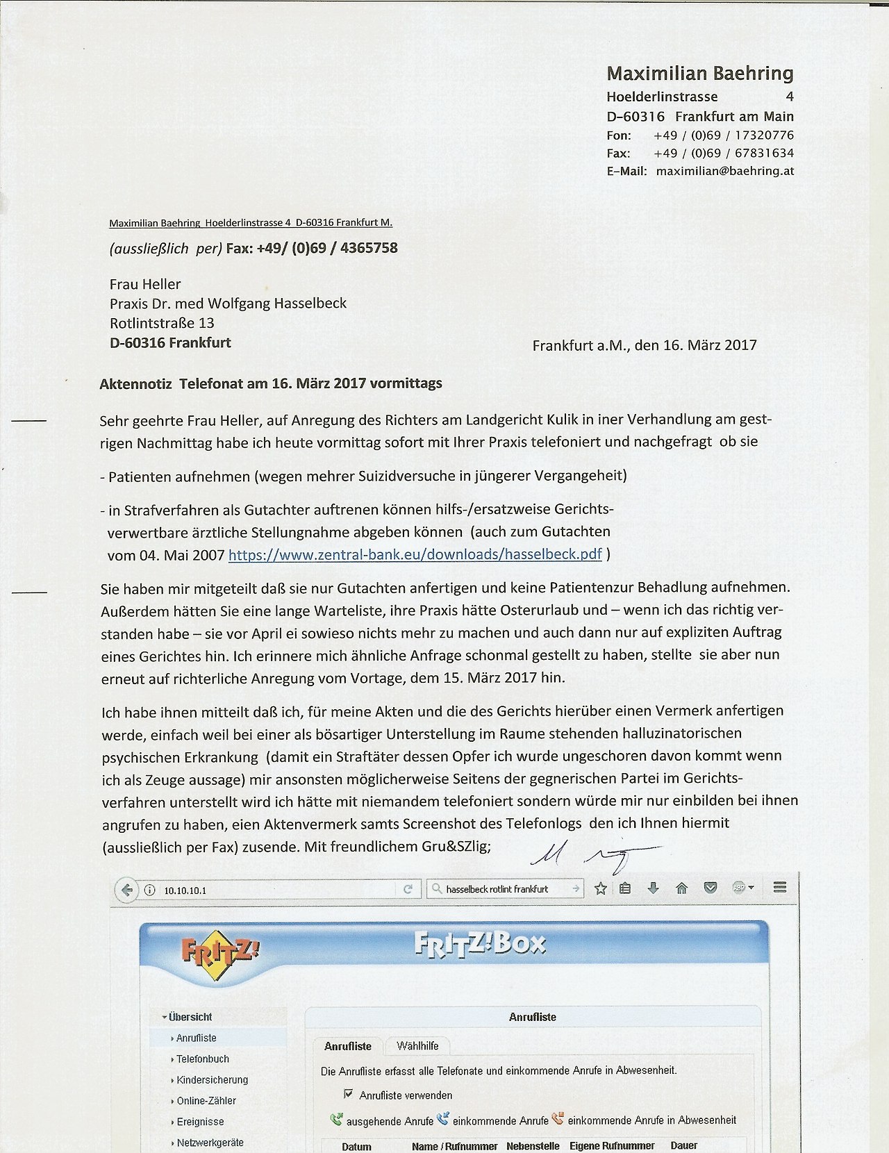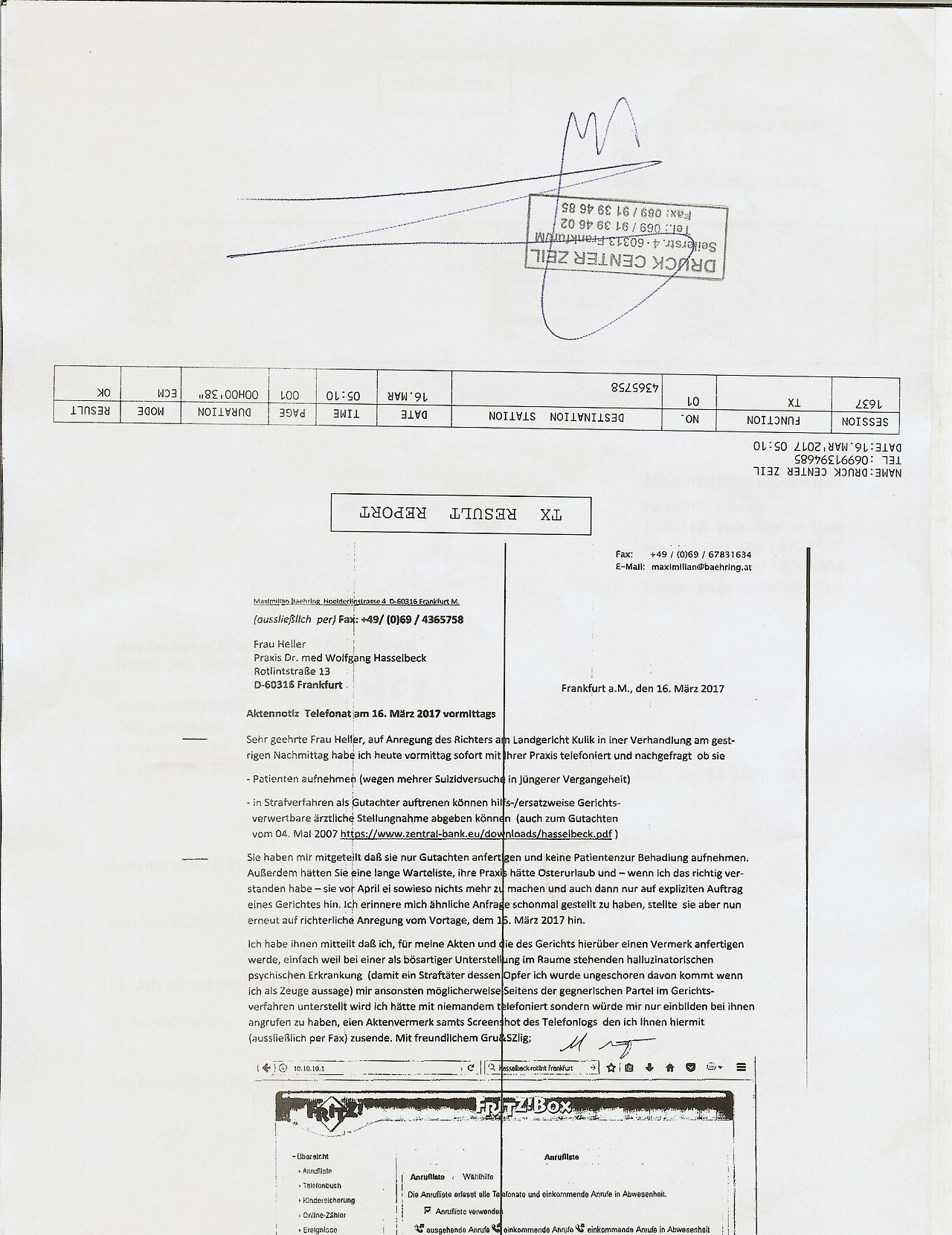 Ich habe ihnen mitteilt daß ich, für meienakten und die des Gerichts hierüber einen Vermerk anfertigen werde, einfach weil bei einer als bösartiger Unterstellung im Raume stehenden halluzinatorischen psychischen Erkrankung  (damit ein Straftäter dessen Opfer ich wurde ungeschoren davon kommt wenn ich als Zueg aussage) mir ansonsten möglicherweise Seitens der gegnerischen Partei im Gerichtsverfahren unterstellt wird ich hätte mit niemandem telefoniert sondern würde mir nur einbilden bei ihnen angrufen zu haben, eien Aktenvermerk samts Screenshot des Telefonlogs  den ich Ihnen hiermit (aussließlich per Fax) zusende.