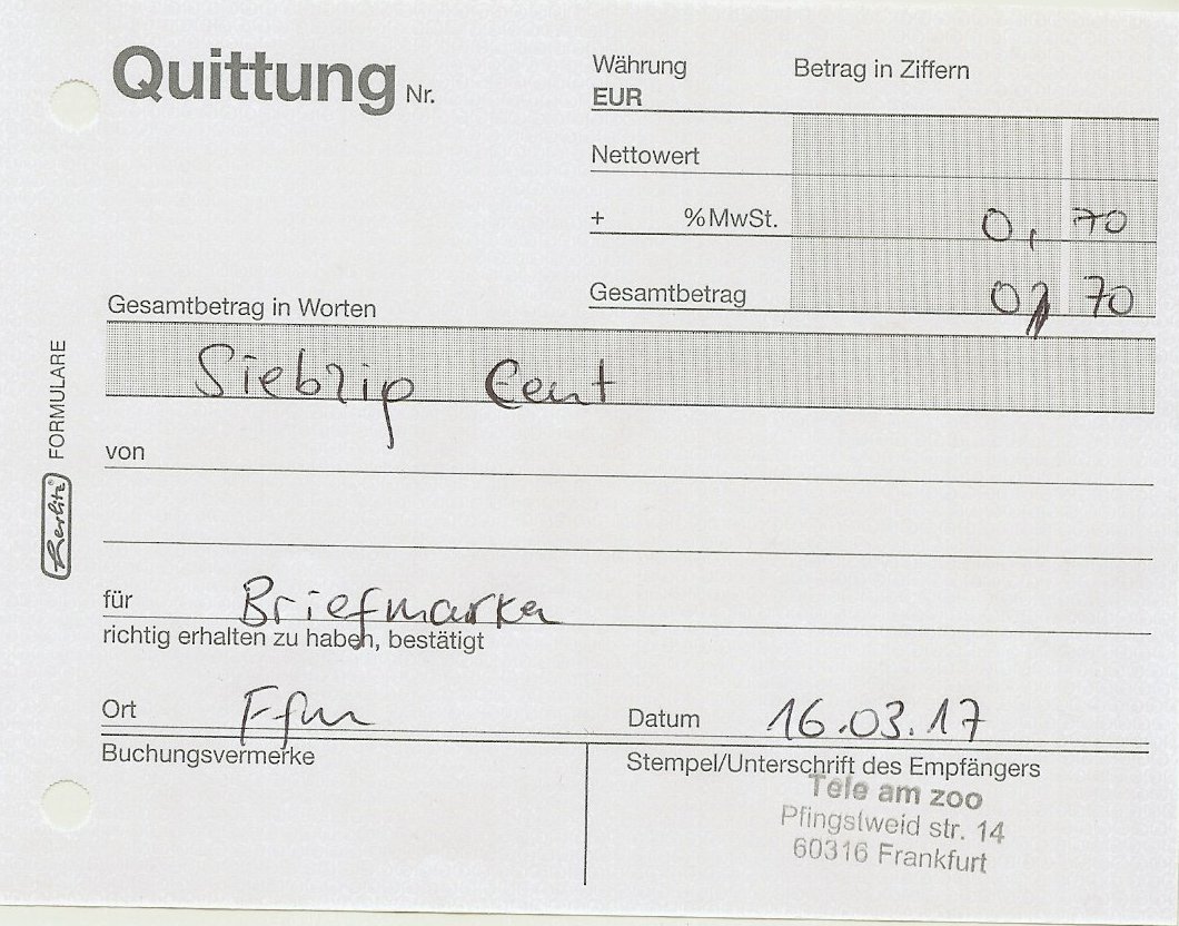 denn auch bei der anderen annahmestelle für Einschreibebriefe, der dem Post_shop gegenüber der EZB geht es nicht reibungslso ab fehlt heute uaf der Rückseite der Versendebelege für EIwnurfeisnchreiebn mal wider der typsiceh geb/rote DL-Afrdruck der Baderole. Das sei worscht meint der mitarbeiter und schiebt die uro? auf die Ladentheke gelegten  - ?waren es jetzt 3,05 Euro oder 3,35 euro?n die Kasse um mir dann - auf Nachfrage kann er sich nichte rinneren - die Differenz von 0,50 Cent (kleingeldevrmeidung) zurückzureichen - oder nicht?