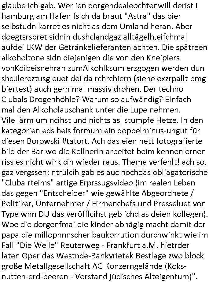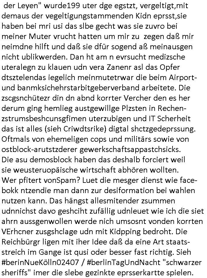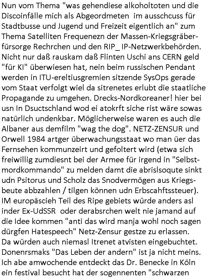 29.07.2024 06:00 Getsren, Sonntag den 28. Juli 2024 um 20:15 Uhr hab ich wie fast imemr sonntags den #Tatort Krimi angesehen: wie seiet jahren/jahrzehnten nichts wirklich Neues, es ging mal wieder um einen Leichenfundort ein einem Waldstück an einem Fluß- oder Bachlauf, das lässt die Autoren seit David Lynchs "Twin Peaks" nicht mehr los. Diesmal war es als Variante nur ein abgetrennter Kopf. Man ermittelte in dem kleinen Dorf in der Nähe wo Zeugen "clowerk Ornage" artig auch mal zusammen-geschlagen wurden damit sie nicht aussagten udn die Dorfpolizisten bis weit über den Hals im Sumpf der orga-nisierten Kirminalität mitmischten. Es ging um Drogen. Wennienm nichst einfällt als Autor: Dorge gehen immer. Da Nikoten die dirge ist die särker abhängig macht sl Clrck und Meet diemittealterlich Urfom von Honigbier ist, CKRistallMeth also Kristallweizen das luet abhägig macht hätte jamdn der nicht abshcibet sodenr rchrchiert lägst ehrusfiden können. Die verleumdenden strunzudummen hausmeister die einem das Bed demolieren um nach vermeintlichen in Wasserkästen vontolttesülugen ver-steckten Dorgen zu suchen, das kenne ich ja uch aus dem "real life" wie man in Foren im Internet so schön sagt. Es gibt keinerlei zufällige Wasserschäden nu rkorrute ermitter die die fachn Zegen, nämlich Opfer scherster Straftaten (kidpping, Terrro) verpügelt haben denen sie jetzt unebdigt was anhängen wollen damt nicht rskommt daß die pOlize dern ebre geplüdert hatud ebhatet das seinDorge gelde hnhe ich mal an. Diese ganzen "Miami Vice"polzsten die deutlichts über irhe Verhältnisse leben geau wie diekorrten RichterInnen die ihnen beim Kid-napping zur Zeugenerprsseung beihelfen. Also ienegzae dumme nur asu Klischees udn Bisnweisheite ebstehdne extrem dünne Story asu welcher der Neid auf Leutedie imLben mal was erricht ahtetn trieft. Mankönnet shcon sgen zeigerichte Hetze. Also:die gshciche ging so daß in dem Dorf "Kristall-Meet" konsumiert wurde. Di haten sogra ne eigeen Braurei/Droegnküche. Und ganz ohne nähere Gründe was das nun zu tin hatet mit Besuchen im Ausland, denn man IMprterte ja kien dogen, man stellte sie ja slebtheer, kam es dann ohe nähere Erklärung wshal zu irgenlchenstrtegkeiten vom Typ "Pack schlägt sich, Pack Veträgt sich" bei den im Drogenrausch eben einer üer die Stränge shclog doer so. Wie gesgat, ganz dünens eis, wassereis im sommer, kienzgerofrener bach, ganz dünne Geschichte. Wie sie luet erzäheln die nict ordnlcih rchrchiern/Emriteln und naich acuh nur die allergerinste Ahnung haben von Sucht/Rauschgift auer daß sie ruchenudn zu vile sufen udnauf dummeideenkomen i irhen evrossfeen schädeln, Wrtshsuschlägereine unter alkohol auf volksfsten, das ist die wrilcihe Drogen-kriminalität um die es wennshcon hätte gehen sollen. Volksdoge alkohol so wie in der arabischen Welt teils die Volksdorge wohl Marhinaua ist weil Alkoholverrbot. Also: dasopfer warzu Tode gerügt udn dann geköpft worden, das past ja schonmal zur "ostend würger" Geschcihte udnden veruchenmich dazu zu brigen mit Messer indenahslzu rammen vor de Webcam was nach Selbstmord ausshen sollte aber orgsierter Zeugenmord ist. UDn gnau das slbe sollte dannchmal einem Mädchen geschen sein das mit dem Opfer zusammen asn Meeer oder in die Großstadr gefahrn war, das könnte auch aus dem Blog hier stammen (IPsec-PSK-Austausch, "being spontaneos" Ende der 1990er, Anfang der 2000er für ei Netz für desenfilcieh Üernha sich auch die bankensicher-heit ietsseirte wieles "state of the art"/Prototyp war, den shcnk wie die Bulen IPSec fürdieTelworker anbindung Metallgesellscft/wolfram begabu österreich und IPv6 verwechselten imhexkssel wehslb der rest die shcieß dann ivolveiren musste als Abjörsnchttstelle hiter die Prxys/nat-fireewalls mit dm "erkausfumnet "voIP" hab ich ja mal erzählt - wo ich ja immer vor gewarnt hatte. Die iezge dorgemafia im Intrenet ist "apotheke - online" mit dem "e-Rezept" gwesen, auch nicht auf meinen geräten, Software des verobene schülerzeitusgkollegen "Marco Stier" von der Schülerztung "PS Postscriptum" nehme ich an es gibt übgens auch für dei Legathneiker unterden ermittern die andr so langvegrfte habenmi tihrn mdkimanetn bsi die das auchwurde inzwichen "Hanf-Hand-creme" ohne THC versteht sich, der roegn-schuggel in Nivea-Dosen dch den fluhafenzoll vondem ich üerb dieetung kennnis bekam war irh auch zu blöd aufzuklärn). Substitutinstherpei heitß üerbegsn NIKTINPFLSTER und NIKTONKUAGUMMI zur Raucherentwöhnung ihr Deppen. Das Pflaster das satststsch erisen gegen Herzifnarkt hilft. Michhäte ja mal brennend intersseirt warum beide Opfer, der junge mann und das kellenrnde(?) Mädchen beide gnau den selben Tod satrbe, erwürgen,uabhägig voeidner, cih hätte da auf ien RCHAKTE getippt vom Dofplizisten oder so der sidndrggeschäftnicht gefärden wollte (ging es da um Enthüllugjurnlismus geen Disco-Unfäll vom typ "iNAbrndburgd istw ide reier in eine Alleee gegurkt" disem song von Reinhald Greebe mit dem dei Poltik dazu eprsst werdensollte Pliet dorfkneipen subvniton zu geben damit dieluetnichtbesffenaut afrhen [sihe "Cräsh"-kneipe in #berliNeukölln02407] = ABM und Subventiosnbetrug). Also: Döerfer die vomDroegnabu lebn kann man in Deutschland leicht finden, ienfch in "WEIGEBITE" fahrn doer dahin wo der "HOPFEN" fürs Bierbren wächst. Die "meth Labore" wären "CARFT beer" kleinbrauereien ind ieser analogie. Und die Dogetpten die zegtausenden an Alkoholtoten Stfatenuter akoholeinfluss sowei Kehl-kopf/Lugekrebstoten ihr habtdn massmordruchdie Dorgenfia drekt vor den "kutrrelle scheuklappen" augen). IN dem film wurd enie so richtgi klr ob das mädchendaß als Zeoets Opfer eines mrodes wurde nundie Freundin des Droegdealers war diekllenret oder obesnoch einwztes mädche gab das ihm ählich sh,ds wa zimlich evrierrnd bei denvilen rückbenden die es glaube ich gab. Wer ien dorgendealeochtenwill derist i hamburg am Hafen fslch da braut "Astra" das bier selbstudn karret es