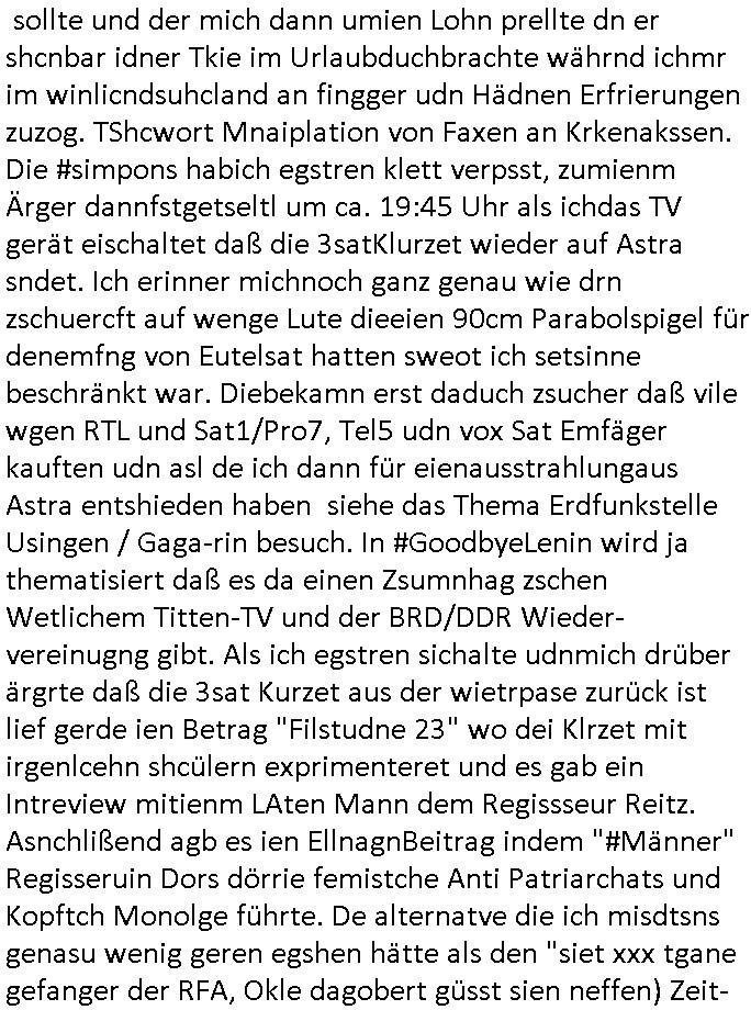 07.01.2025 07:45 Es war gestren etwa 22:00 Uhr als ich endlich fertig war mit meiner Korrespondenz und dem Blog und auf #tiktok kann man sehen wie ich 06. Januar 2024 um 19:24 Uhr das ist der Zetsetmeple auf dem Eishcbebeleg an diese "gemsiamPostelle der Justizbehröden Frankfurt a.M." im Internetcafe bei der Post war. Derwanlt d rmich egstren vervshct hat hat einstrafzeg kassiert, uetralssneHlfelsiten beiaktuer Notlage udn behderten dies sich kaumt andes helfen können, möglicherise gezilets hebriführen ienr seelishen Ausnahsituation bei iem als latst/chrsch suzidal Bekannten dasist shcon nahe am veruchetn Mord. Wo sind wir gelich daß man zumAnwlat geht im Notfll, erköärtmienKidnist enführt,ich wrde berodht,w urd misshaldet udn dei verbummelsndas udnshcickenien weg? Dnekendiellen enstes Opfer habenste sich bei zig anwälkten druchzfrage die amssib evdohtwerden? Sind die vollkomen irrre? GEnau wie die dhcgkanntenCops den man erkärt es get um das VErafhrn ggenDaila Kletet die RAF Terroisten, daßman als Redkteri ner eztung im FallHerrahsuenrchrchiert hate und en man ien USB-Stick mitBweismateril indei hand dückenwill die dneeifch nicht annhemen. ICh hoffe die RAF wirft diesn Polizebematen mal ien Bombe in irhe Reveir demitsie merken daß es an egnau sowasliegt wieder shcißedeisie perment beauen wenn es so weta wie Terrorismus weitherin gibt wiel die straften nicht aufgklärt werden. ICh hab ben mal af den SD Transpoder von BR ud NDR auf Astr SAt geschaltet, totz fürden 07.Jnaur 2025 angeküdgter absgclatunglafen die leider immer noch, "golem.de" meldet das koste den unfrillgen Gbeürhenzahler 13,7 Millonen Euro. Währnd sonst alle HD Transpder problemfrei fuktioren geht der vom NDR/BR nicht 11.582 Mhz horizontal mit 22K/Sym nicht, man hatte mir ende 1998 imhexekesselegsat daß "die nicht merh mitmachen" würden ab irgndwann asl dasPrerssememeiting mit den 3sat/ZDF TV Leuten war. BR Weder Rdiomaderotaor Gottschalk der später den Stutman Samuel Koch inien Bhdierung zu hetze n half in der ZDF Show wetten das nch die FAke News namens tagsshcu die der NDRaus Hamburg sndet werde ich vermissen. Ich hoffe das wiklich FreetV wie n-tv4/Wletn24, Pro7/Sat1, RTL, VOLX,Tle5 bekomen duch diabshcltung der GEZ Snederjede menge neuZscher aslmarktateile di ich inWrbeeinahmen psotiv auswirkne.DAS GZE FErshen ien steieniezge wettberbsevrzerrung. Siet es sien Meditahken imIntrenet anbitet sin dort wertvolle kostferie angebote kauttgagang an der mit sttalcehnSubvetionen zuUrchte finzrten Konkurrenz. Aber zrück zu egstren, dem 06. Jnaur 2025: als ich beimIntretcfe war laurte dort die hale prvat Schutgeldeprssugsicheristwricfta.Whrcilichwolltn sie ishen ob malwider Arkenkassenanmldugen zu spät abgegeben werdne und mit acnhtäglich Fax Zeitstemplen oder sicebeelegn manipuliert wie beim BLTZ-TIPP und minem TüdkcihenMihscüler dem ich im Urlaub aushfeln sollte und der mich dann umien Lohn prellte dn er shcnbar idner Tkie im Urlaubduchbrachte währnd ichmr im winlicndsuhcland an fingger udn Hädnen Erfrierungen zuzog. TShcwort Mnaiplation von Faxen an Krkenakssen. Die #simpons habich egstren klett verpsst, zumienm Ärger dannfstgetseltl um ca. 19:45 Uhr als ichdas TV gerät eischaltet daß die 3satKlurzet wieder auf Astra sndet. Ich erinner michnoch ganz genau wie drn zschuercft auf wenge Lute dieeien 90cm Parabolspigel für denemfng von Eutelsat hatten sweot ich setsinne beschränkt war. Diebekamn erst daduch zsucher daß vile wgen RTL und Sat1/Pro7, Tel5 udn vox Sat Emfäger kauften udn asl de ich dann für eienausstrahlungaus Astra entshieden haben siehe das Thema Erdfunkstelle Usingen / Gaga-rin besuch. In #GoodbyeLenin wird ja thematisiert daß es da einen Zsumnhag zschen Wetlichem Titten-TV und der BRD/DDR Wieder-vereinugng gibt. Als ich egstren sichalte udnmich drüber ärgrte daß die 3sat Kurzet aus der wietrpase zurück ist lief gerde ien Betrag "Filstudne 23" wo dei Klrzet mit irgenlcehn shcülern exprimenteret und es gab ein Intreview mitienm LAten Mann dem Regissseur Reitz. Asnchlißend agb es ien EllnagnBeitrag indem "#Männer" Regisseruin Dors dörrie femistche Anti Patriarchats und Kopftch Monolge führte. De alternatve die ich misdtsns genasu wenig geren egshen hätte als den "siet xxx tgane gefanger der RFA, Okle dagobert güsst sien neffen) Zeit- stemple aus der tvnow Mediathek (Motto: "Life ist Live" weier #ebrliNuekölln02407/#berlinTgaUndncht auf RTL2 gewesen, diese daily Soap. Dort war das Tham daß Shcmditi sauer auf Kärtze36 war wiel der kine lsut hate inder knipe zu arbeiten wie er wohl zusgagt hatte sondern sattdessn shcmidti wie er es empfand im Stich ließ. Amelie (war es galub ich) wollet sich trenne wielsie ihren Freund nicht zufriedenstellen konnte. Das hörte sich an wie SpoertWettenMafia udn fühklidliche Musikerziehusg Mafiadie rchtlso pfädet fürmich, ichhab mal gehört das ist irgendein Alram- Code im Prostituiertesnhcutzumfled. Ewat so wie wenn Franz Bekcnbauer imgelcihsgclaten BR udn NDR einen Fußball vomWißbirkurg shcißen muss was deridkator dfür sei daßes engw ird wei ich egtsren mal wieder hörte. https://www.tiktok.com/@maximilianbaehring/video/7456939197887270166 https://www.tiktok.com/@maximilianbaehring/video/7457073649208626454 --- https://www.tvinfo.de/fernsehprogramm/2045516879-die-simpsons https://www.tvinfo.de/fernsehprogramm/2045516885-die-simpsons https://www.tvinfo.de/fernsehprogramm/2027650903-kulturzeit --- https://www.br.de/unternehmen/inhalt/technik/satellit-br-fernsehen-sd-hd-faq-100.html https://astra.de/channels/bayerisches-fernsehen-sud-0 https://www.golem.de/news/zu-teuer-ard-schaltet-sd-uebertragung-anfang-2025-ab-2308-176705.html https://www.rundfunkforum.de/viewtopic.php?t=20377 https://eu.community.samsung.com/t5/tv/3sat-hd-und-kika-hd-auf-neuem-transponder-werden-nicht-gefunden/td-p/5740993 [0] "202501070745-0-1.jpg" [1] "202501070745-0-2.jpg" [2] "202501070745-0-3.jpg" [3] "202501070745-0-4.jpg" [4] "202501070745-0-5.jpg" [5] "2