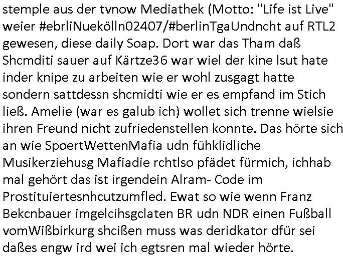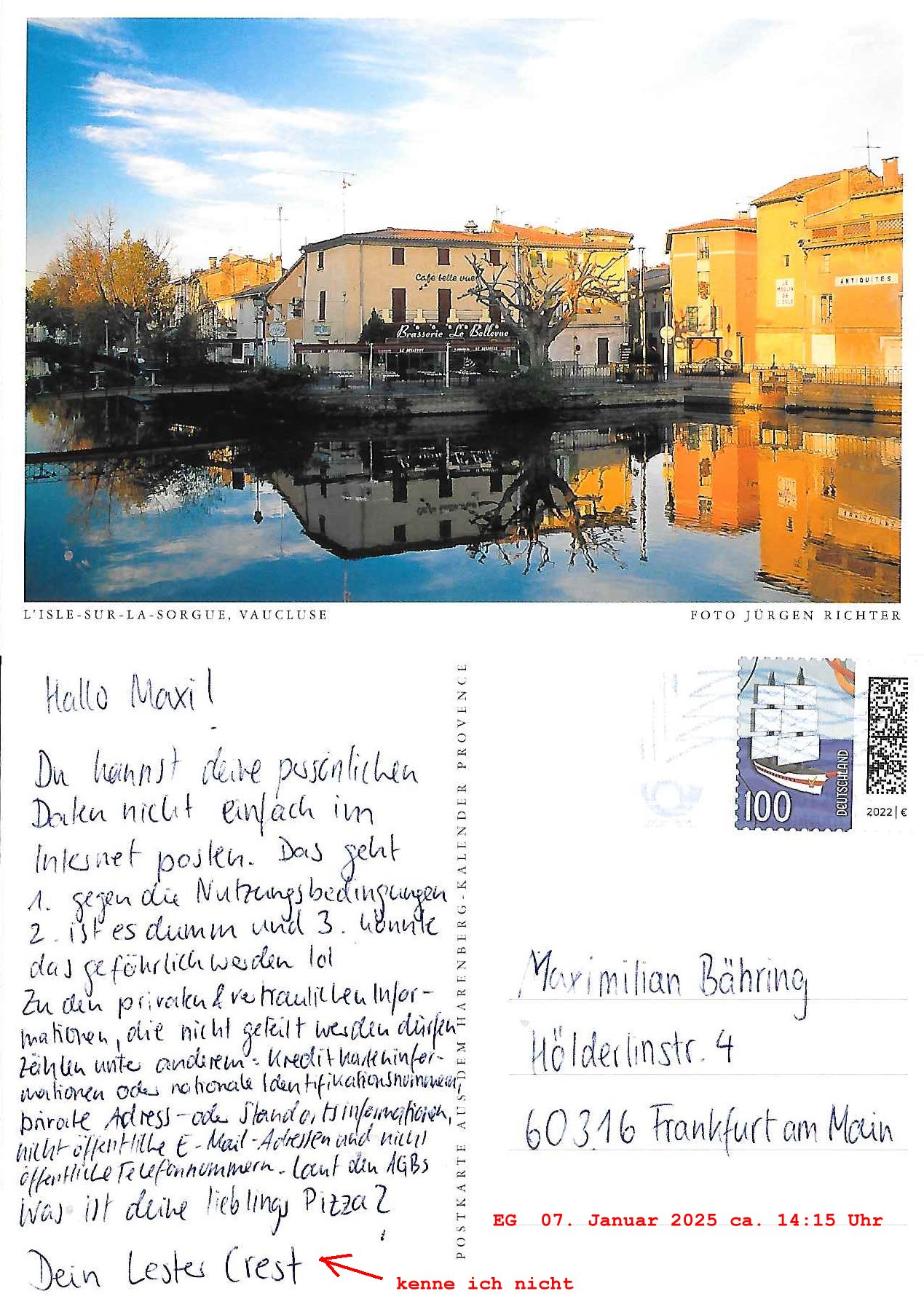 07.01.2025 15:00 Kome garde vom Postabgeben im Internetcafe am Zoo und dem Supermarkt indrWschsmidtstraße passage zu-rück. Traf auf eine Afroamerikanerin die ich möglicher- weise kenne aus dr Uni Klik üerdicichgetsren ha haftg gschimpf habe die an derklik oben am Zooirgendeinm Frauenhaus stand. Wir unterhielten uns über von durch udn druch korruetnMedizenr manipulierten Akten, sie hatt deisbügich lauz geshpft auf der straße. Wir jhilet einen kurzen Plausch indessn Verlauf sie sich wunderte über Deutsche nch 1945 geborene Angehörige die sich nicht ihre Tätervolk Gene asl Nzis diffamiernlasn wollen. Asl ich anch haus kam lag gaz komsch Post imBrisfasten, eine Postrakrte von einem mutmaßlichen Trickbetrugs - Verbrecher namens Lester Crest denich dem Lager der Hexenkessel Ende 1998 Lügen-Presse Plüdere zupordne. Es könnetsien daß dr nam da shcon mal gefallen ist. Auf drpsotkaret stand ich häte sienkridkartendatenbaknnt gegeben oder so ein absoluet gequirrlter Scheiß Unfug. Als ich wieder in der Wohnung war undmein Eikäfe zuberiete, das gekaufet Tatsbort in den Toster warf und mit Margharine bestrioch (Butter ist zu teuer), ich hab hauet 1,29 Eurofür essn ausgegebn und 3,30 Euo für Einschreiben asl wegn korrupter Gerichte und Anwälte damt man malsieht das wfür lebndoheliche Ausmaße die Korrution hat die weoit üer das dopplte püro Tga koste was mir zum leben bleibt, als ich also wider zurück indrwohnugwqar shcute ich kurz ob die Snder BR udn NDR endlcih abgschalte sind udn hurra, tatsäschlich! Es gibt ienBEladung daßdei snder basgchate wurden. https://www.tiktok.com/@maximilianbaehring/video/7457175444111019286 [0] "202501071500-0-1.jpg" [1] "202501071500-0-2.jpg" [2] "202501071500-0-3.jpg" |