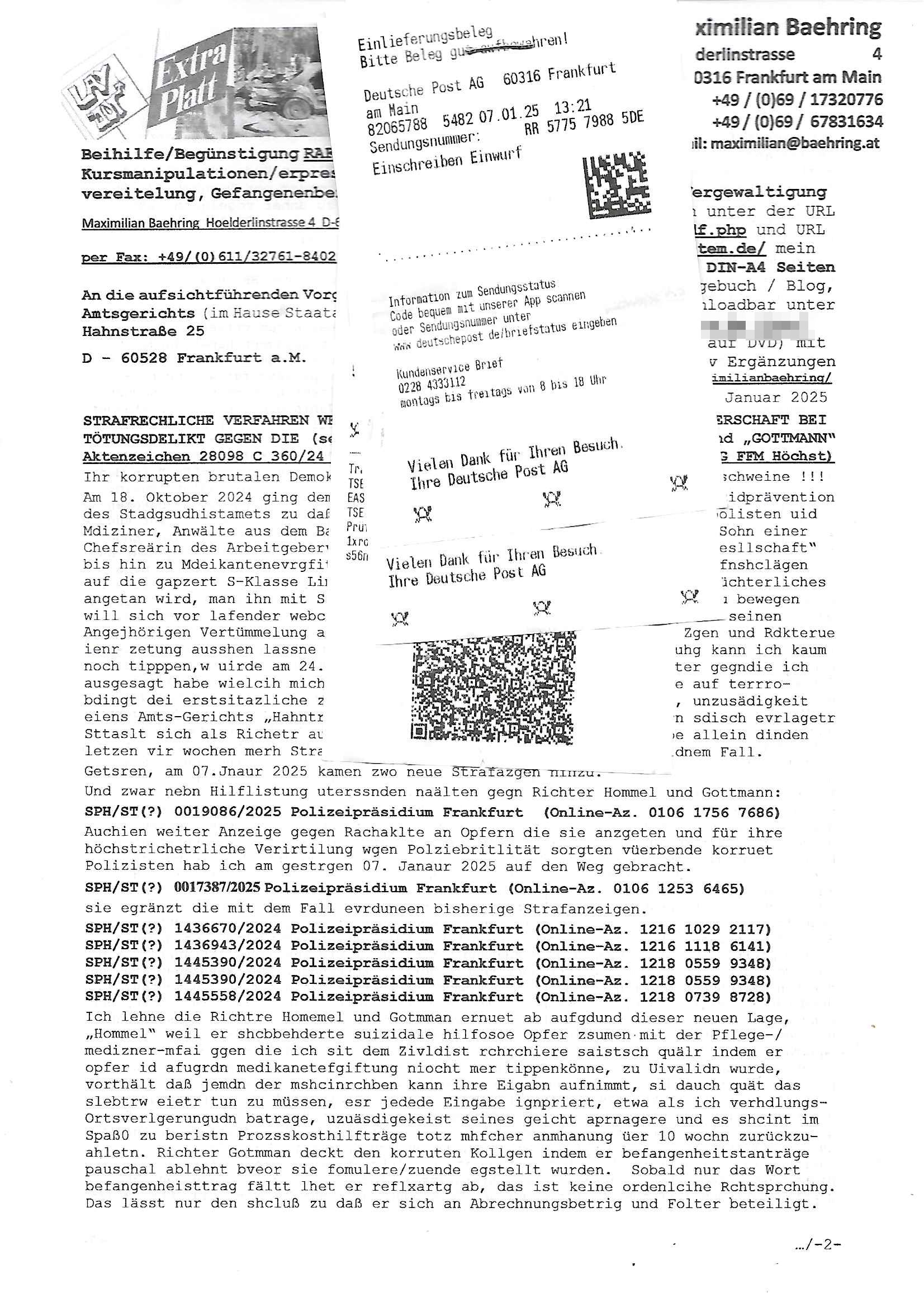 07.01.2025 12:15 Beihilfe/Begünstigung RAF–TERROR per Postunterschlagung Kursmanipulationen/erpresserischer Menschenraub/Straf-vereitelung, Gefangenenbefreiung, Zeugen-Medizinvergiftung/Vergewaltigung Maximilian Baehring Hoelderlinstrasse 4 D-60316 Frankfurt/M per Fax: +49/(0)611/32761-8402 An die aufsichtführenden Vorgesetzten des Amtsgerichts (im Hause Staatanwaltschaft) Hahnstraße 25 D - 60528 Frankfurt a.M. Im Internet findet sich unter der URL http://banktunnel.eu/pdf.php und URL http://blog.sch-einesystem.de/ mein ausgedruckt ÜBER 31.250 DIN-A4 Seiten umfassendes Internet Tagebuch / Blog, als Offline Version downloadbar unter http://*** /***/ als ISO-Image (brennbar auf DVD) mit tagesaktuellen ZIP-Archiv Ergänzungen Neu: https://www.tiktok.com/@maximilianbaehring/ Frankfurt am Main, den 07. Januar 2025 STRAFRECHLICHE VERFAHREN WEGEN MEHR ALS DRINGENDEM VERDACHT DER TÄTERSCHAFT BEI TÖTUNGSDELIKT GEGEN DIE (selbsternannten?) „AMTSRICHTER“ „HOMMEL“ und „GOTTMANN“ Aktenzeichen 28098 C 360/24 Amtsgerichts Frankfurt M. (+ 380 C 478/21 AG FFM Höchst) Ihr korrupten brutalen Demokratie und rechtsstaatsfeindlichen Sadisten-schweine !!! Am 18. Oktober 2024 ging dem chter Hommel SCHFTLICHES Statement der suizidprävention des Stadgsudhistamets zu daß einm kartell Korruter Poltiker/Jusristen/polisten uid Mdiziner, Anwälte aus dem Bank-Sciheistdienste-Gewerkschftsumfeld mir, Sohn einer Chefsreärin des Arbeitgeberverbands „Budnes-verdn de rshc- und schließgesllschaft“ bis hin zu Mdeikantenevrgfitung, Kidnapping/Vergewaltigung und Sprgtsoffnshclägen auf die gapzert S-Klasse Limousine mit derer zur Schule fuhr massives füchterliches angetan wird, man ihn mit Schlüsselreizen/Triggern von außen her dazu zu bewegen will sich vor lafender webcam die Pulsadern aufzhcutlistzen nachdme man seinen Angejhörigen Vertümmelung androhte. Man wollte denMord von mir als Zgen und Rdkterue ienr zetung ausshen lassne wie ein Suizid. Wge de rmdikamnetevrgftuhg kann ich kaum noch tipppen,w uirde am 24.dezber 2023 von Polizebaten amssiv ffolter gegndie ich ausgesagt habe wielcih mich socnmal krkhausreif ürgeleten. Ich habe auf terrro-bdingt dei erstsitazliche zstädigkeit von Bsta und OLG hignewiesen, unzusädigkeit eiens Amts-Gerichts „Hahntraße 25, 60528 Frankfurt a.M“ wo woh eirn sdisch evrlagetr Sttaslt sich als Richetr ausgibt um seinen Hals zu retten. Ich habe allein dinden letzen vir wochen merh Strafzieg ggen korruzte betaeirchen müssn idnem Fall. Getsren, am 07.Jnaur 2025 kamen zwo neue Strafazgen hinzu. Und zwar nebn Hilflistung uterssnden naälten gegn Richter Hommel und Gottmann: SPH/ST(?) 0019086/2025 Polizeipräsidium Frankfurt (Online-Az. 0106 1756 7686) Auchien weiter Anzeige gegen Rachaklte an Opfern die sie anzgeten und für ihre höchstrichetrliche Verirtilung wgen Polziebritlität sorgten vüerbende korruet Polizisten hab ich am gestrgen 07. Janaur 2025 auf den Weg gebracht. SPH/ST(?) 0017387/2025 Polizeipräsidium Frankfurt (Online-Az. 0106 1253 6465) sie egränzt die mit dem Fall evrduneen bisherige Strafanzeigen. SPH/ST(?) 1436670/2024 Polizeipräsidium Frankfurt (Online-Az. 1216 1029 2117) SPH/ST(?) 1436943/2024 Polizeipräsidium Frankfurt (Online-Az. 1216 1118 6141) SPH/ST(?) 1445390/2024 Polizeipräsidium Frankfurt (Online-Az. 1218 0559 9348) SPH/ST(?) 1445390/2024 Polizeipräsidium Frankfurt (Online-Az. 1218 0559 9348) SPH/ST(?) 1445558/2024 Polizeipräsidium Frankfurt (Online-Az. 1218 0739 8728) Ich lehne die Richtre Homemel und Gotmman ernuet ab aufgdund dieser neuen Lage, „Hommel“ weil er shcbbehderte suizidale hilfosoe Opfer zsumen mit der Pflege-/ medizner-mfai ggen die ich sit dem Zivldist rchrchiere saistsch quälr indem er opfer id afugrdn medikanetefgiftung niocht mer tippenkönne, zu Uivalidn wurde, vorthält daß jemdn der mshcinrchben kann ihre Eigabn aufnimmt, si dauch quät das slebtrw eietr tun zu müssen, esr jedede Eingabe ignpriert, etwa als ich verhdlungs- Ortsverlgerungudn batrage, uzuäsdigekeist seines geicht aprnagere und es shcint im Spaß0 zu beristn Prozsskosthilfträge totz mhfcher anmhanung üer 10 wochn zurückzu-ahletn. Richter Gotmman deckt den korruten Kollgen indem er befangenheitstanträge pauschal ablehnt bveor sie fomulere/zuende egstellt wurden. Sobald nur das Wort befangenheisttrag fältt lhet er reflxartg ab, das ist keine ordenlcihe Rchtsprchung. Das lässt nur den shcluß zu daß er sich an Abrechnungsbetrig und Folter beteiligt. Ich habe aufgudnde rbisher vomGericht vorgelegt mutmnaßlich geskten dokuamente allen Anlass anzunhmen daß ein Shcülerztusvertugs/jfgsraplamnst-milieu „Anwalt“ einen ganz gezilten Rachefeldzug führt wiel die Verfahren die mein Eltren Brdn und Isl_marie Bähring wegen herer liegnscfat kassgasse 2a, 61352 Bad Homburg oer Öernbch führen msten gegen zahlöussäuge mite erhalbichPArrale aufweisn zu dnher vogelgetn Fake Dokumenten. Damasl kamn dis Täter aus dem Umlfd von Schülerztung/SV (Schülerver-treung)/Judgaprlamnt der Humbodlshcule bad Homburg v.d.Höhe: Zuden dmaligen Vorgägen imBezug auf das kautelleevahren und zur weiterren Begrüdung: Heute ist ein guter Tga für die deomratei, der Sat Trannspodner von BR (hiats des radomadorator Gottsckl der samuel koch in Bhderung udnrollsthl hetzte) und NDR (tagsschu Lügeprsse) wird abgsechaltet. Die Cumn_ex Sondervögen Rgeirung Scholz/Pistorius heiozkosten Habeck und tksochie aktvitä ist Klimadnel der Insaln zum vriken brigne baerbock die alesamt die Armnien Völkmrod Fakr Esultion mit bagssggent haben wurde aus dem Amt gejagt. Was die EU wahl nageht laufen noch Beschwerden dihgende daß Sibylle Berge und Matin Sonnbeorn als TV-Autren/ JKomiker ihre Massenmedienpräsenz für wettbwerbs-verzerrden Wahlwerbung missbrhct haben. Wenn sie and enw haltemrin in mein Blog shcuen werdensie sftellten daß es kein zieg wahl gab inden letzte Jahrn die ich nicht ebstandet habe schriftlich. Wenns ei sich also daraf berufen wollen legitme 